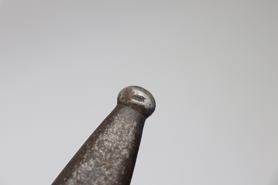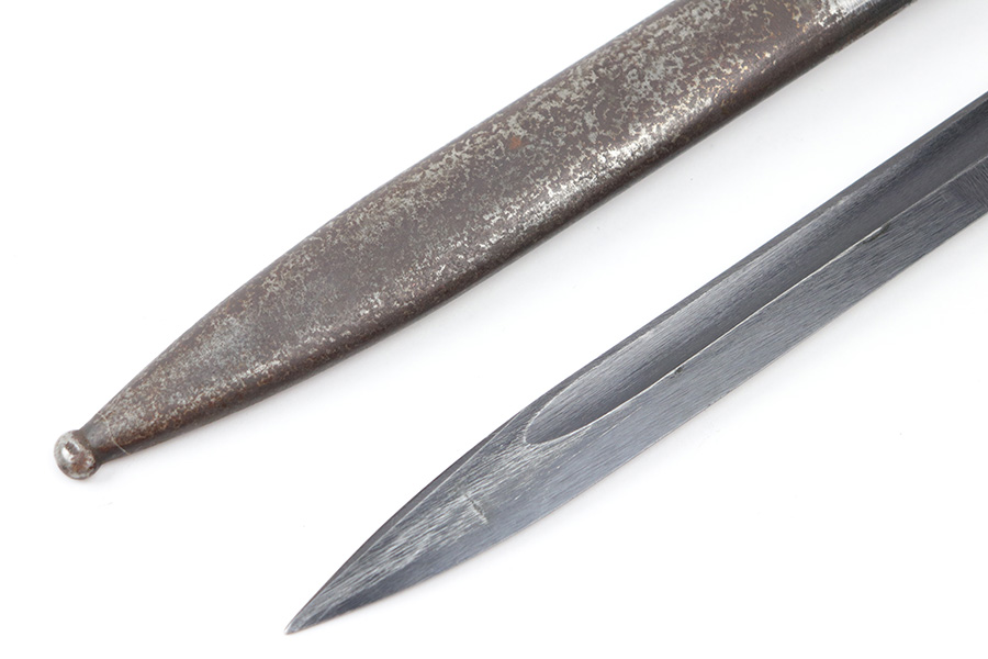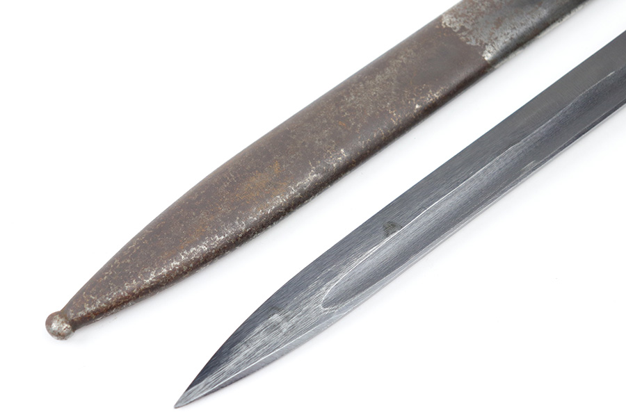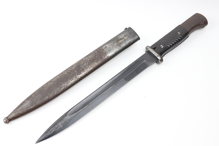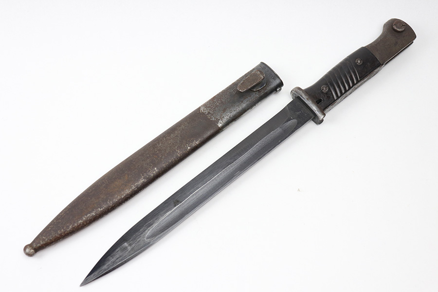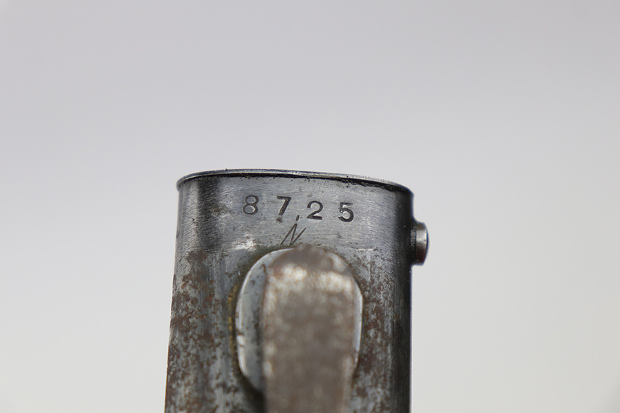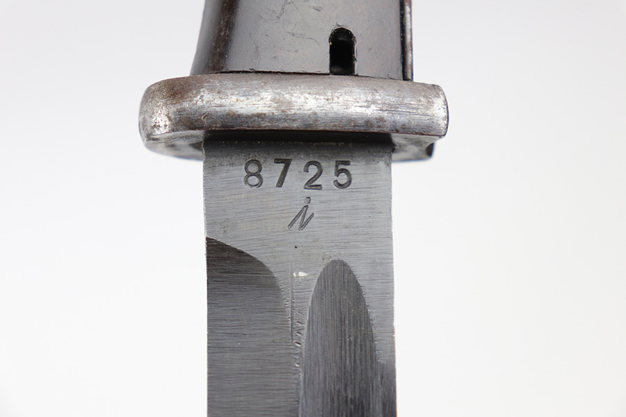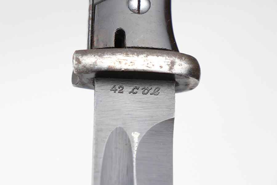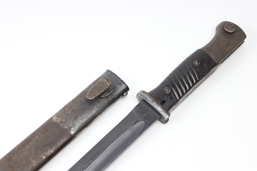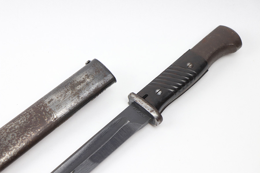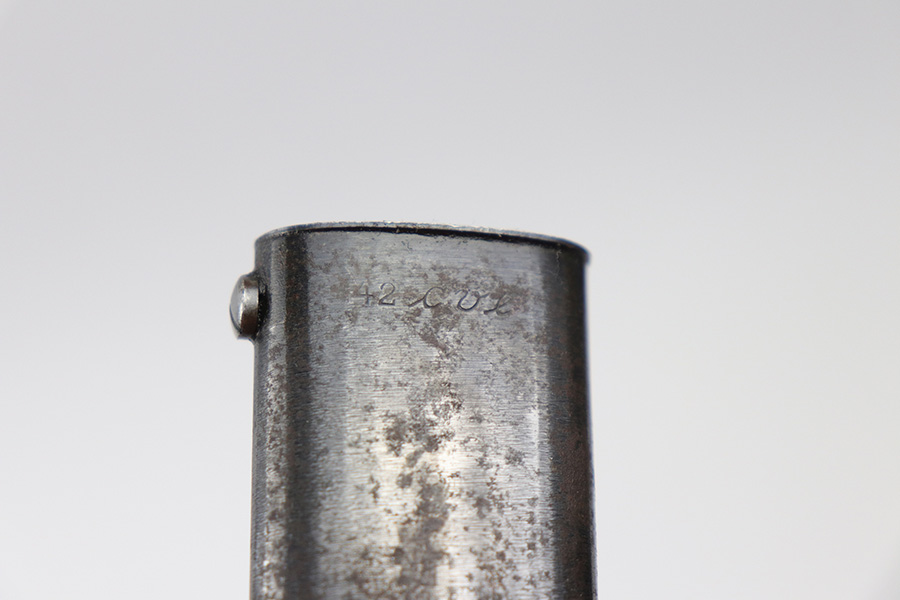 11/12/21 – This is an original 1942 dated K98 bayonet with a matching serial numbered scabbard. The bayonet blade is excellent with very nice finish throughout. Maker stamped “cvl” (WKC code) and dated on one side with the serial number stamped on the other. The handle has surface rust throughout the metal parts. There’s similar surface rust and dark patina throughout the scabbard. No dents, however. See photos.