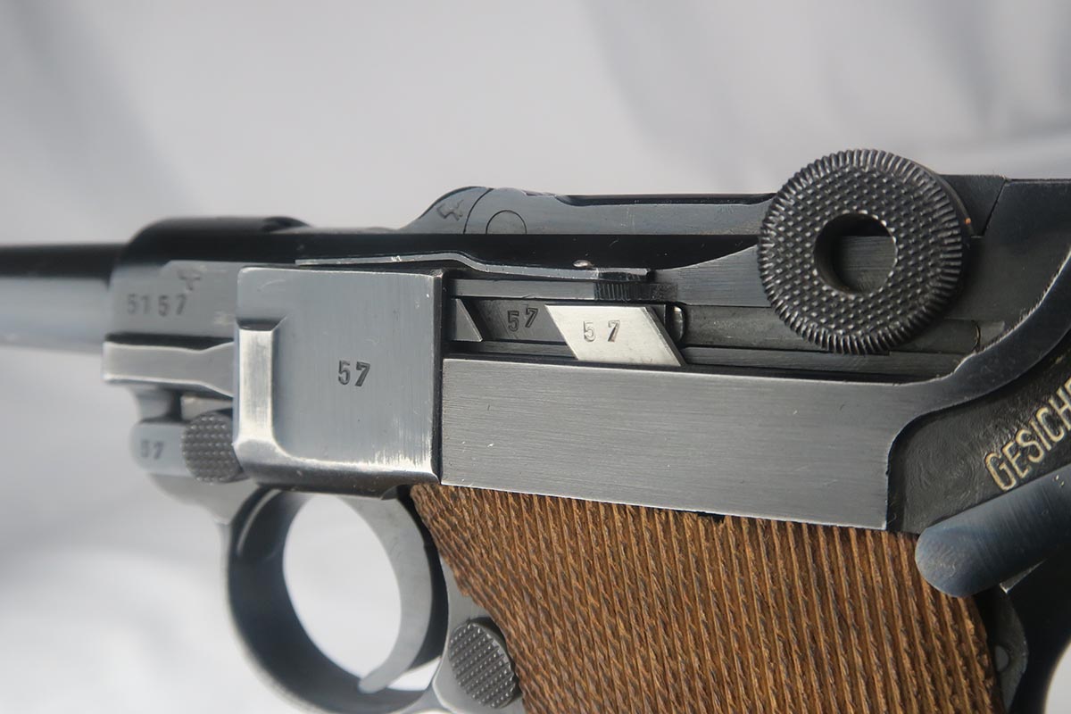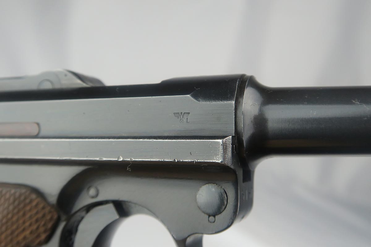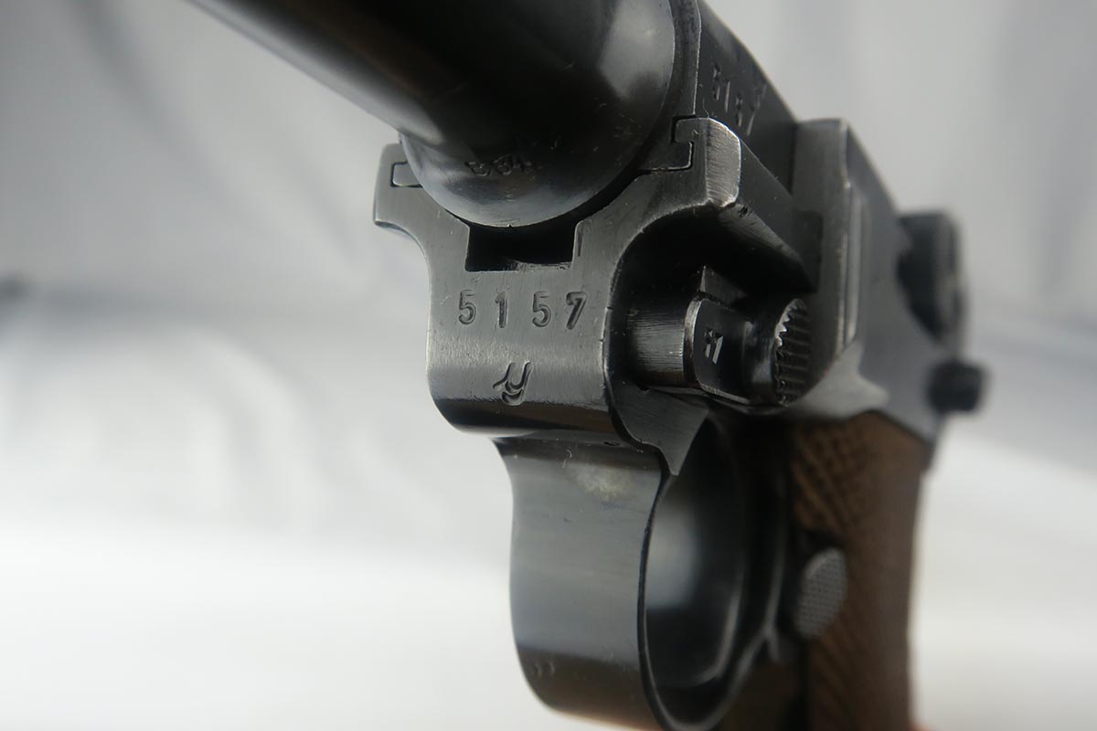 9/7/17 – This is a nice Mauser Banner luger from 1942 with Eagle/L proof denoting police issue on the right side of the receiver. It is all original and correct with about 96-97% blue remaining. There is some high edge wear on the sideplate and muzzle, and a little thinning on the front strap. All numbered small parts are matching, as are the grips. Black widow type magazine. Left grip panel has small chip under the safety. There were only ~4,700 of this variation produced with sear safety, which this pistol is in the proper range for. Excellent bore.