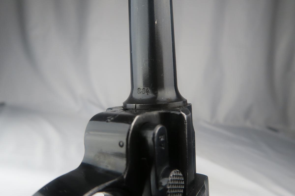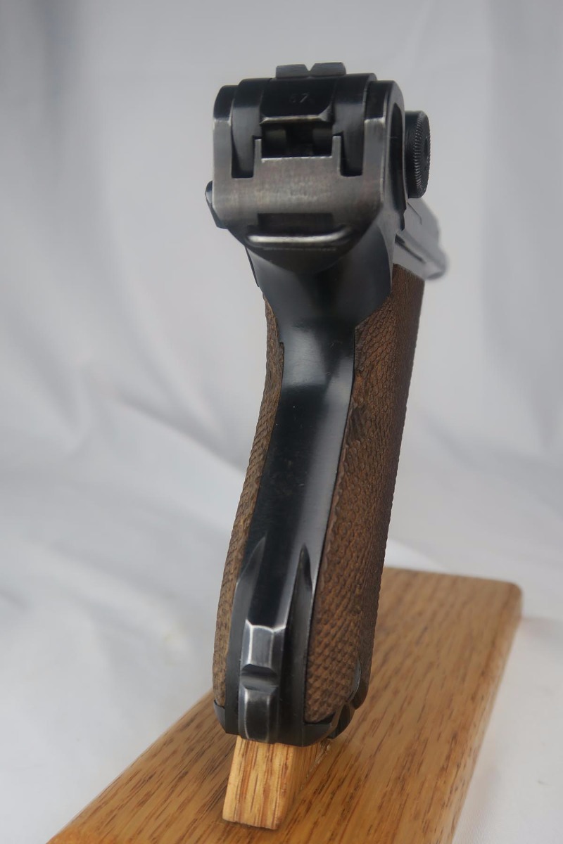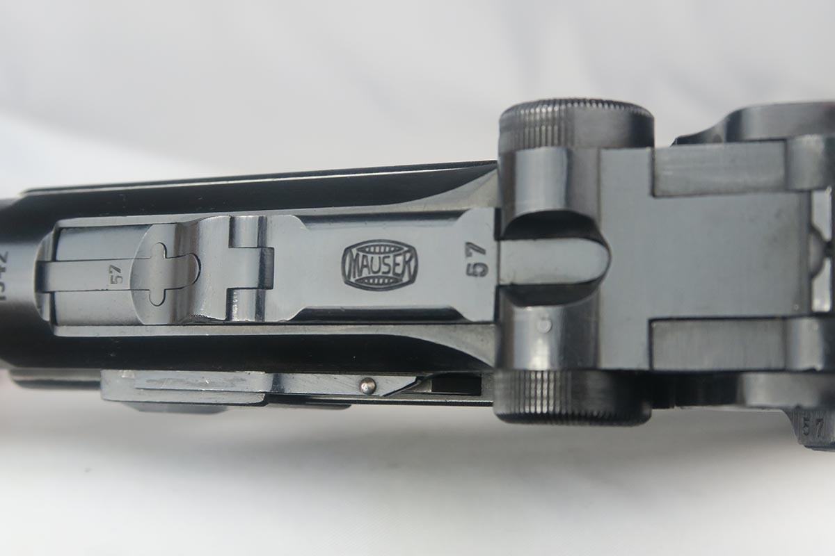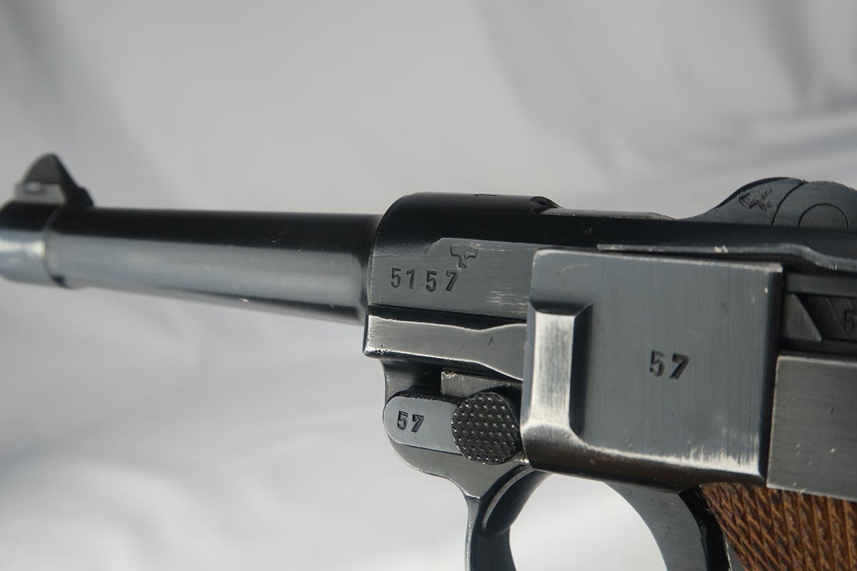 9/7/17 – This is a nice Mauser Banner luger from 1942 with Eagle/L proof denoting police issue on the right side of the receiver. It is all original and correct with about 96-97% blue remaining. There is some high edge wear on the sideplate and muzzle, and a little thinning on the front strap. All numbered small parts are matching, as are the grips. Black widow type magazine. Left grip panel has small chip under the safety. There were only ~4,700 of this variation produced with sear safety, which this pistol is in the proper range for. Excellent bore.