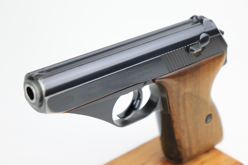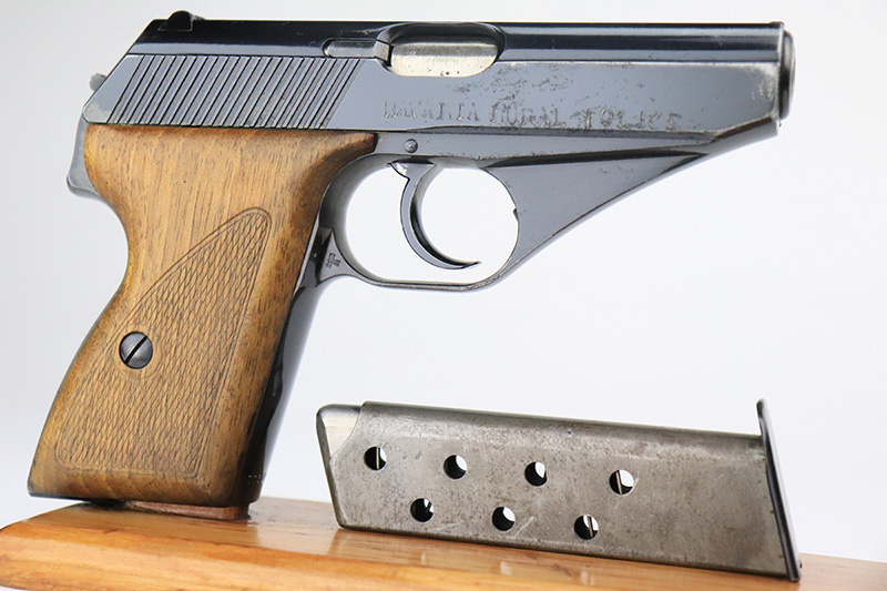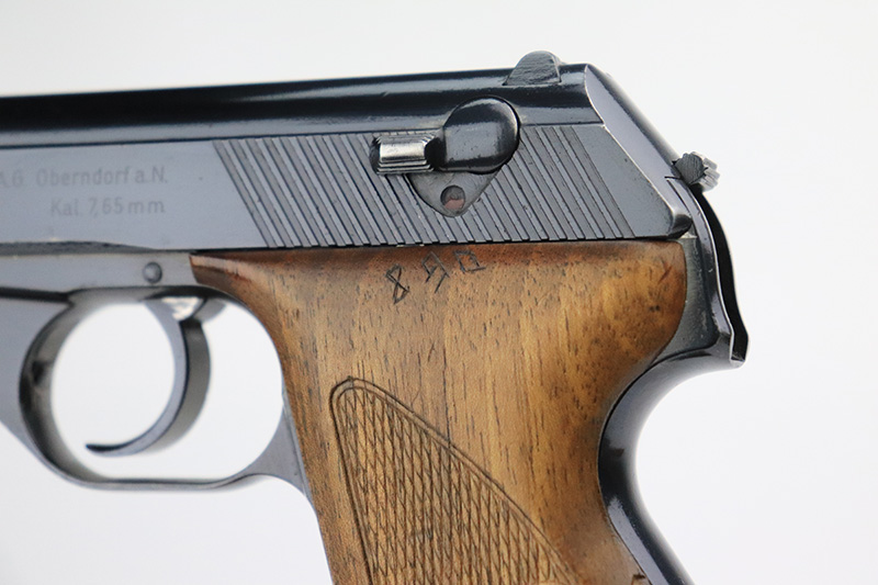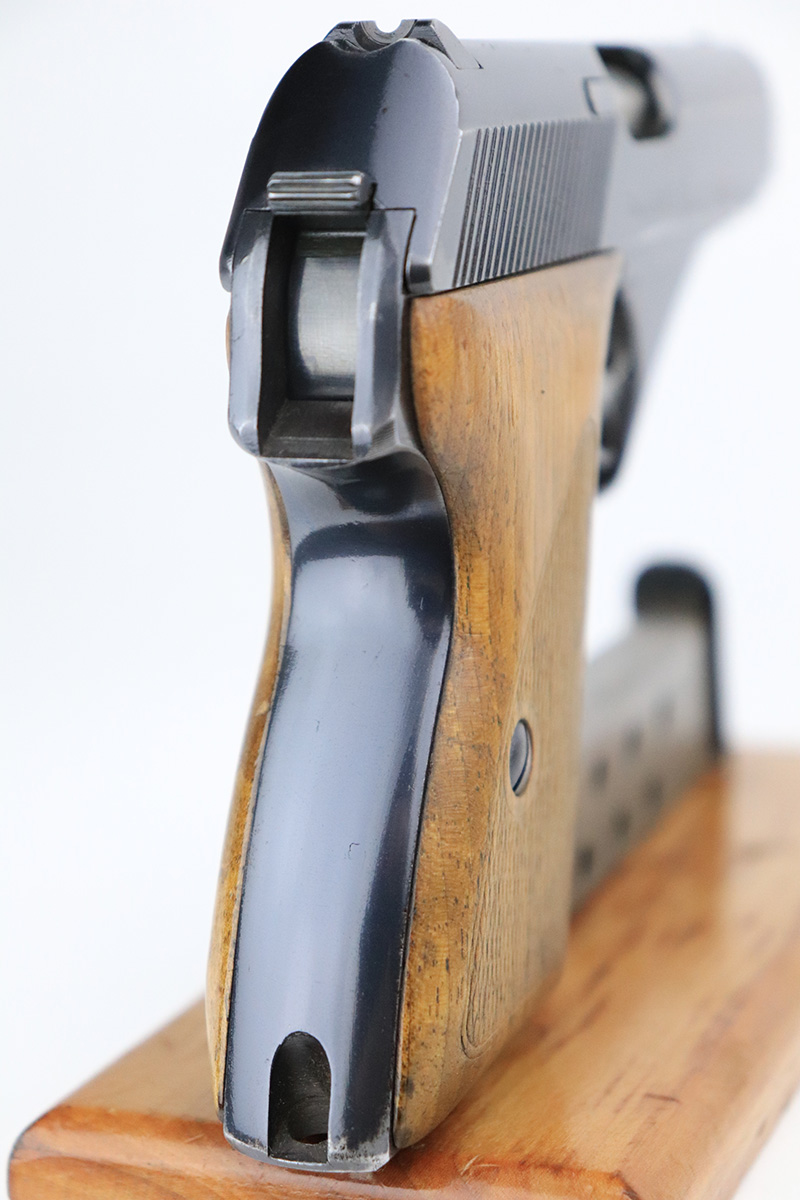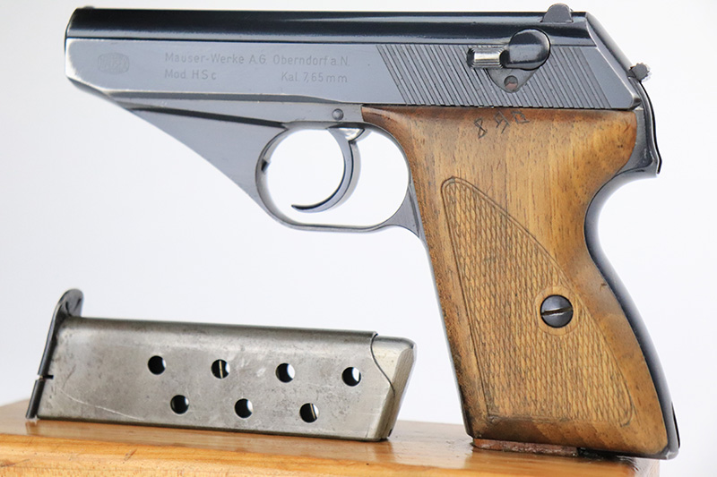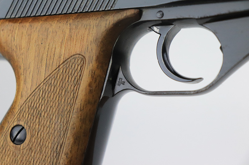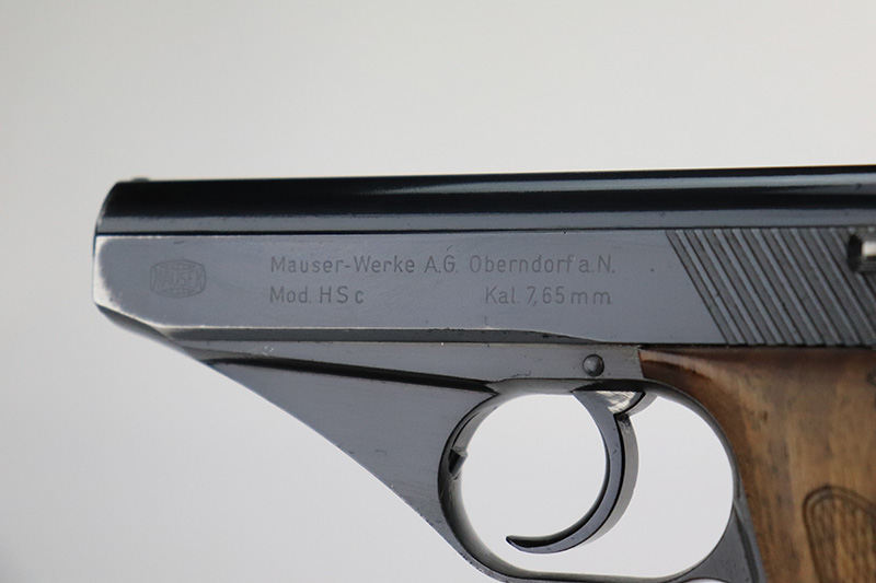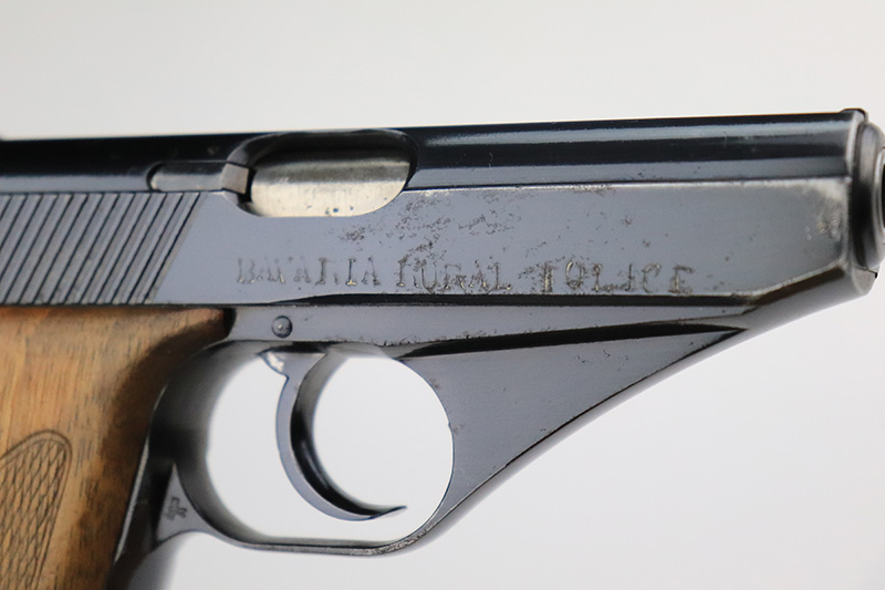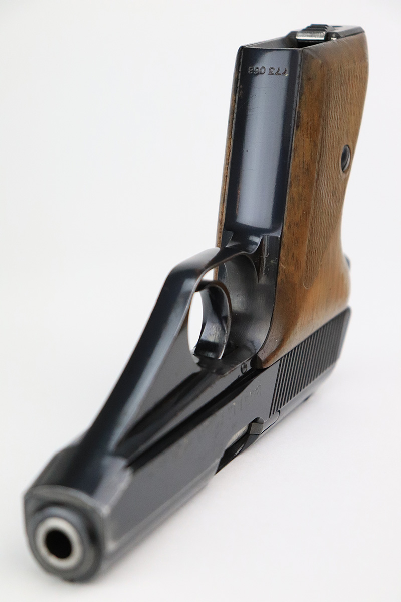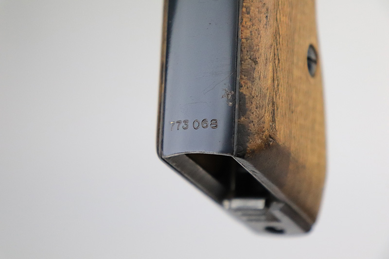 8/25/22 – This is an excellent example of a Mauser HSC manufactured in 1942. It is all matching and has “Eagle N” proofs. There are no military markings, but there is a “Bavaria Rural Police” marking on the right side of the slide. The gun has retained about 97% of its original high polish finish. There is minor muzzle wear and one small dot of wear on the front strap. An area of freckling on the right side of the slide near the ejection port. Comes with excellent wood grips and one proper magazine. The bore is mint.