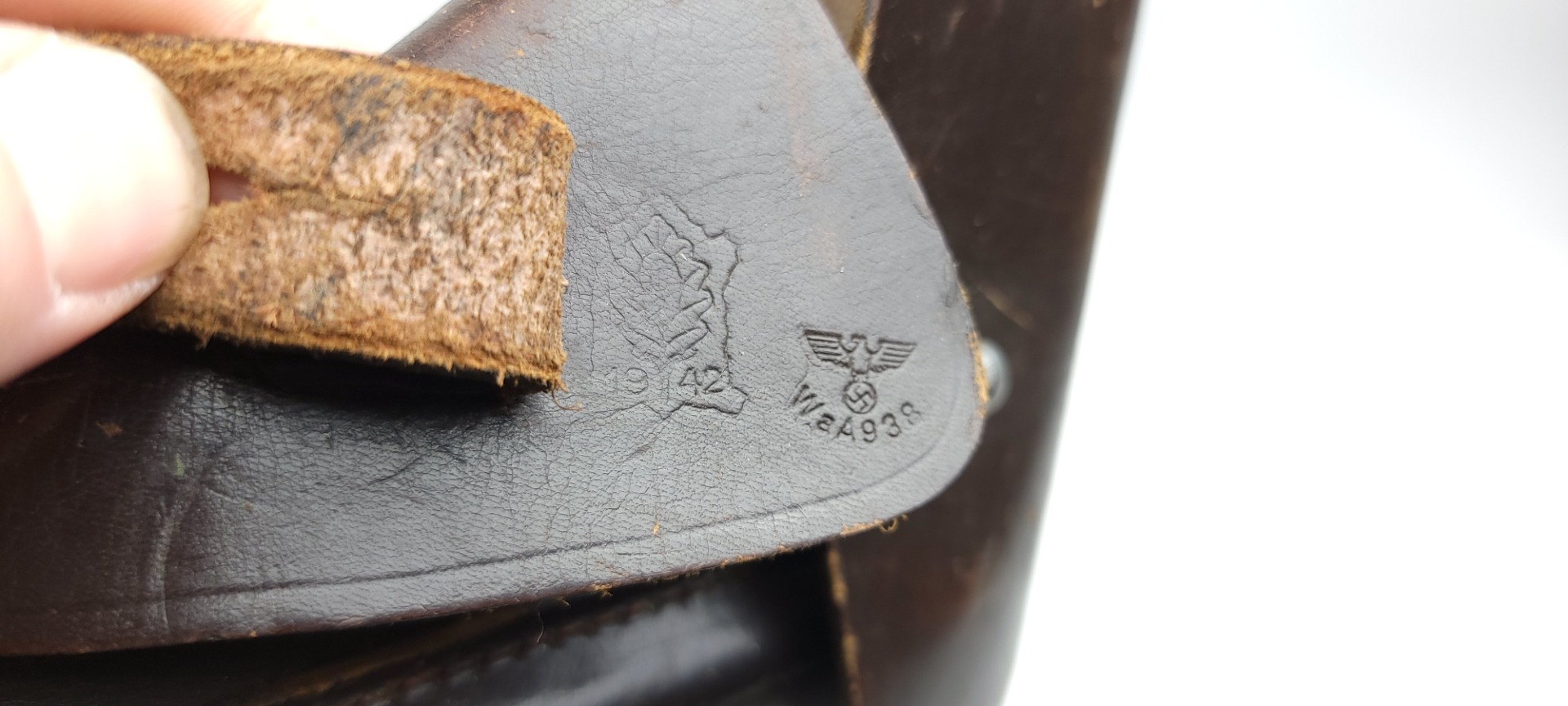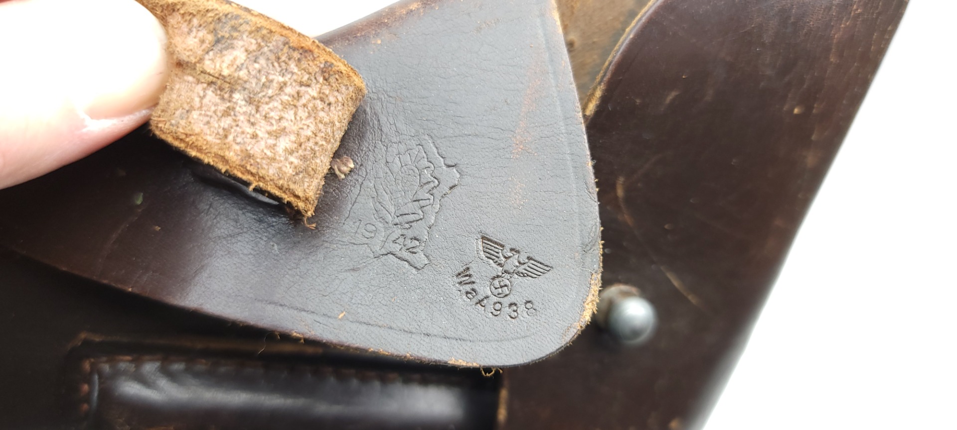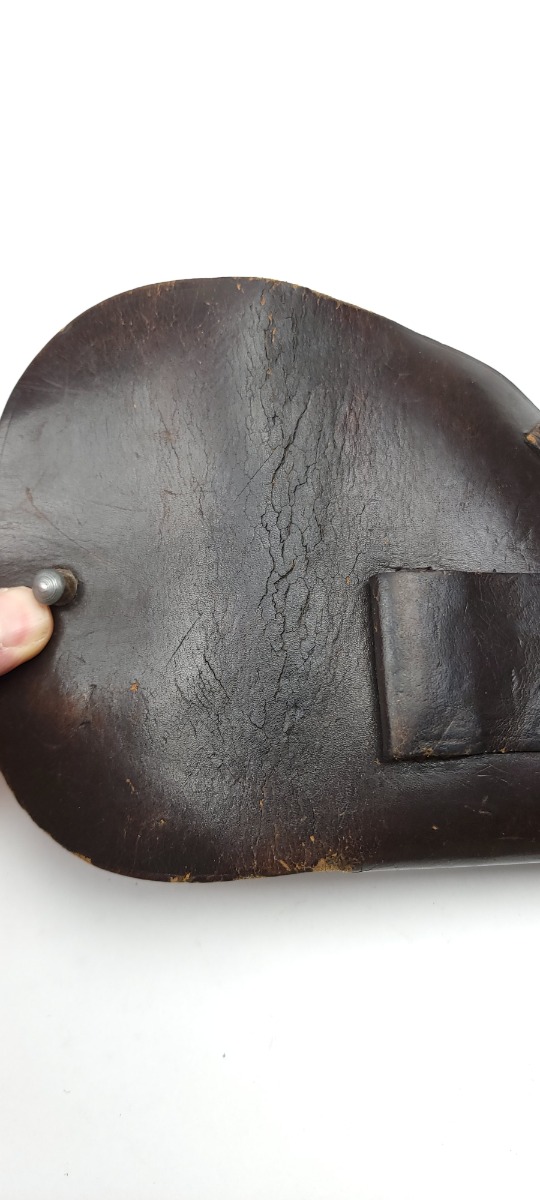 3/9/22 – This is an original 1942 dated holster for a Mauser HSc or model 1934 pistol. The holster is maker stamped, dated, and waffen proof stamped under the closure strap. The interior leather indicates “Mauser 7.65”. The dark brown leather is in great condition overall despite some surface wrinkling and scuffing of the exterior leather. The interior leather is fairly clean with no major issues. No stitching issues as well.