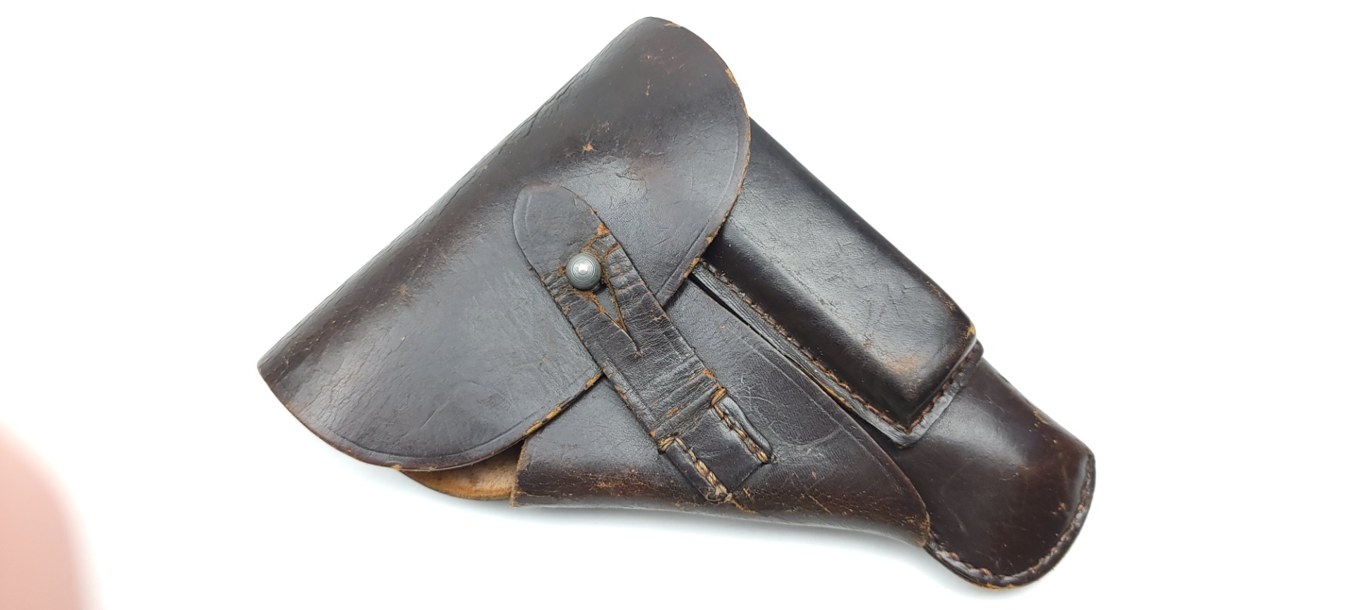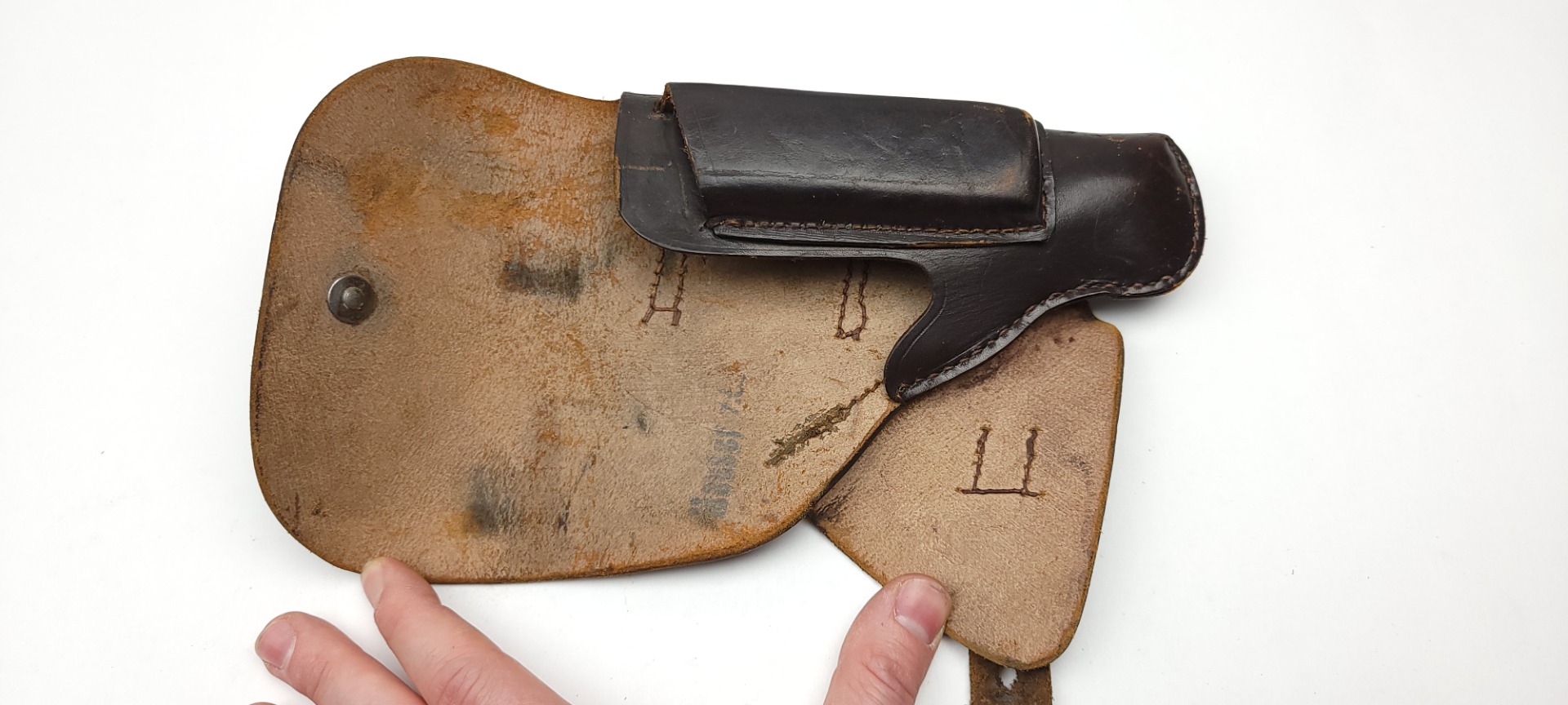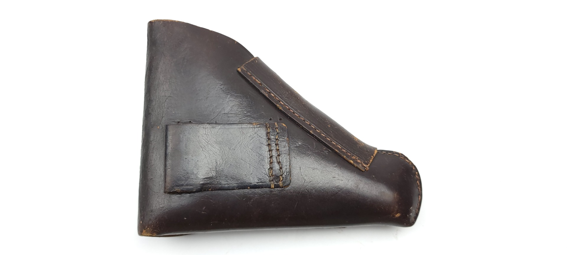 3/9/22 – This is an original 1942 dated holster for a Mauser HSc or model 1934 pistol. The holster is maker stamped, dated, and waffen proof stamped under the closure strap. The interior leather indicates “Mauser 7.65”. The dark brown leather is in great condition overall despite some surface wrinkling and scuffing of the exterior leather. The interior leather is fairly clean with no major issues. No stitching issues as well.