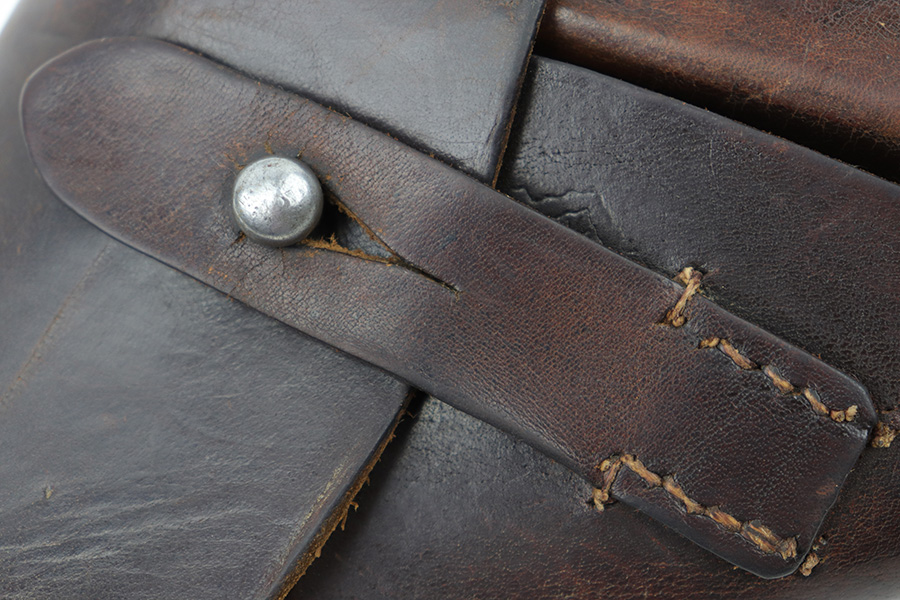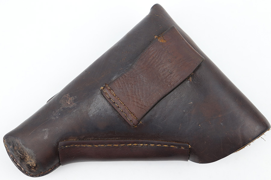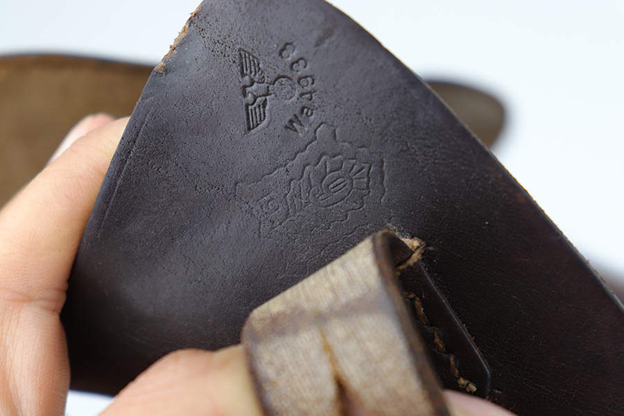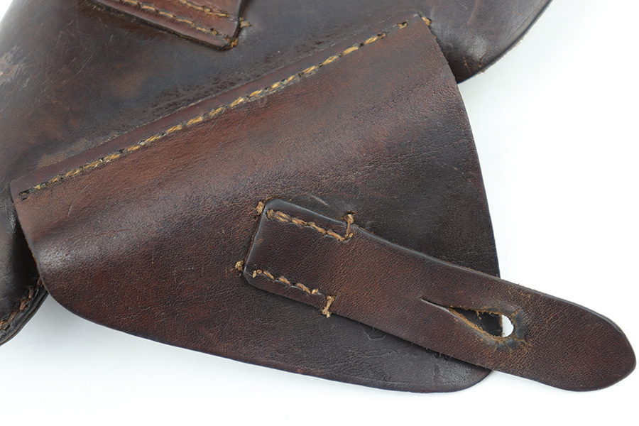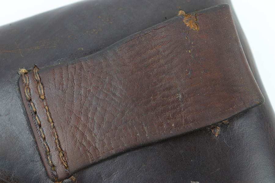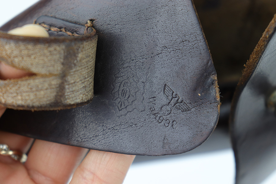 4/6/23 – This is an original 1942 dated holster for a Mauser HSc or M1934. The holster is in great overall condition with normal pliability and typical surface wear. The back belt loop has some general use wear, and there’s scuffs around the toe of leather. There’s wrinkling and one small area of cracking on the top leather. The interior leather is clean, and the stitching is original throughout. Under the closure strap is a “bearskin oak leaf 9” maker stamp with 1942 date, and a waffen military proof. The interior leather is ink stamped “Mauser 7,65”.