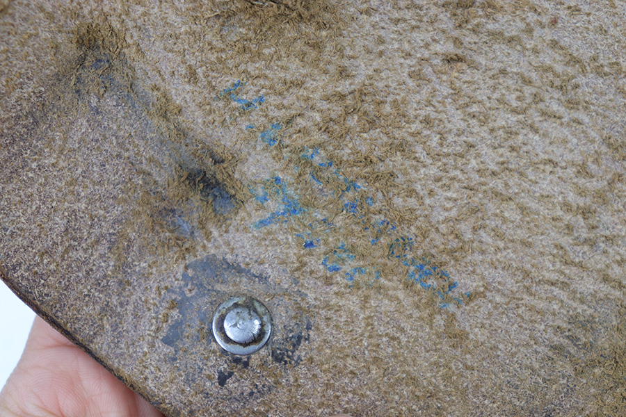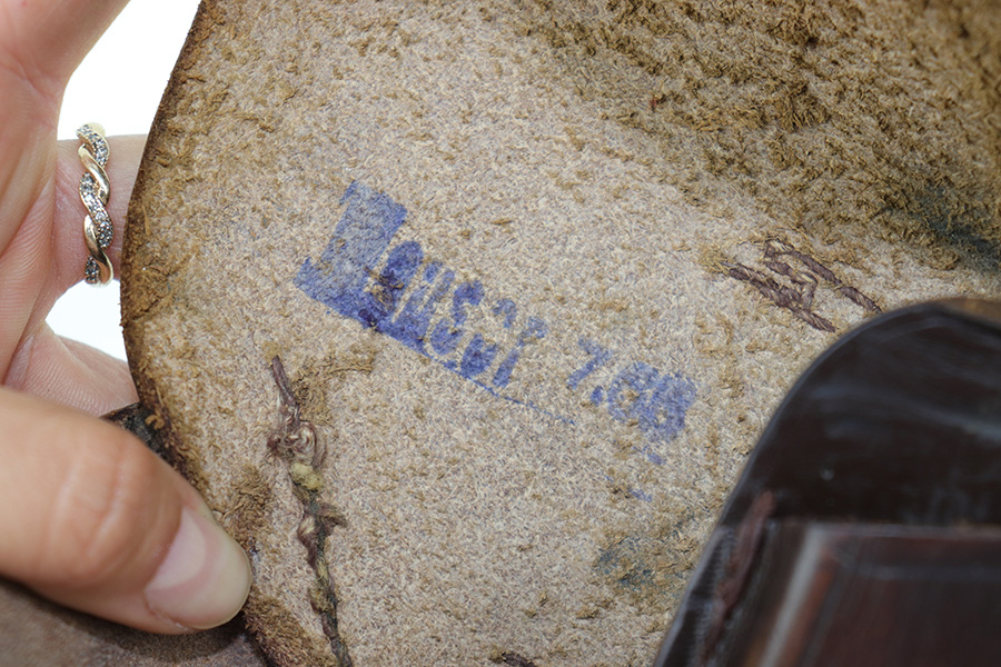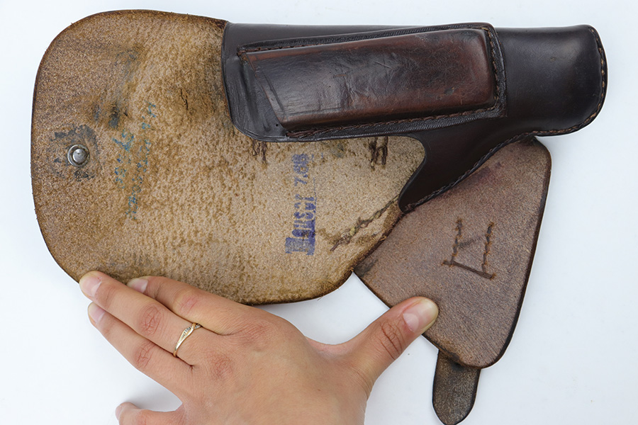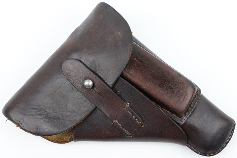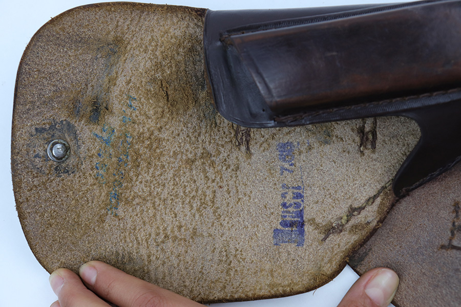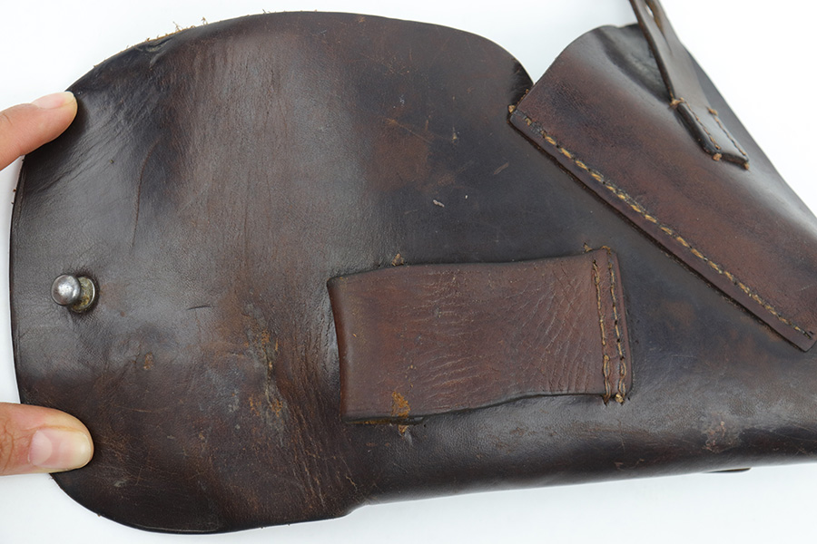 4/6/23 – This is an original 1942 dated holster for a Mauser HSc or M1934. The holster is in great overall condition with normal pliability and typical surface wear. The back belt loop has some general use wear, and there’s scuffs around the toe of leather. There’s wrinkling and one small area of cracking on the top leather. The interior leather is clean, and the stitching is original throughout. Under the closure strap is a “bearskin oak leaf 9” maker stamp with 1942 date, and a waffen military proof. The interior leather is ink stamped “Mauser 7,65”.