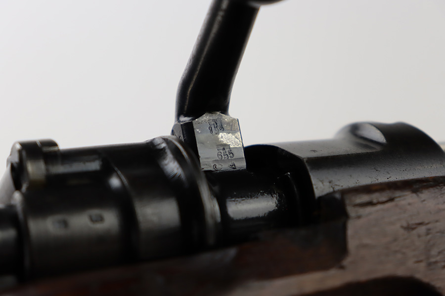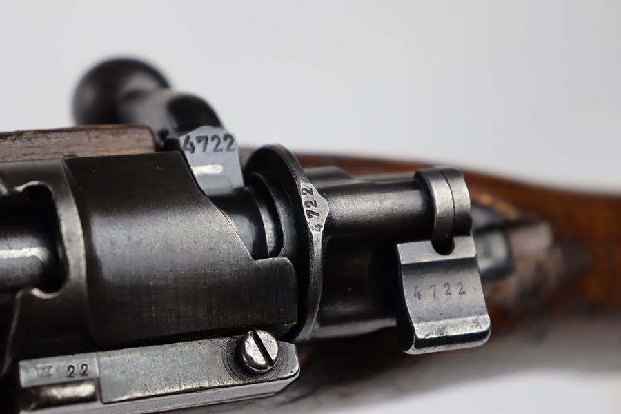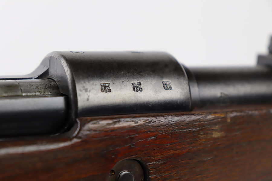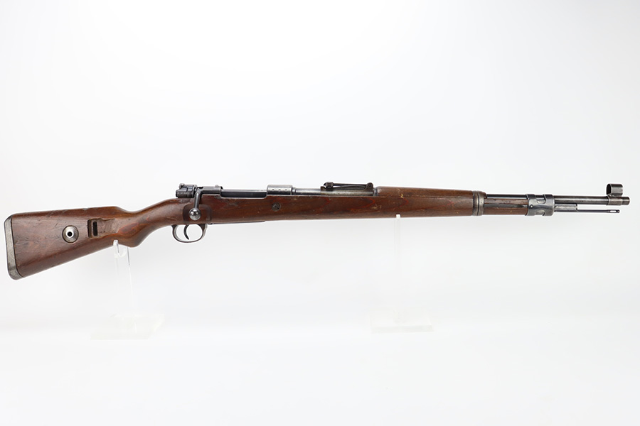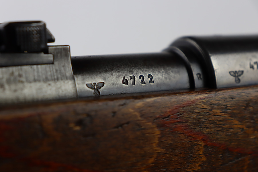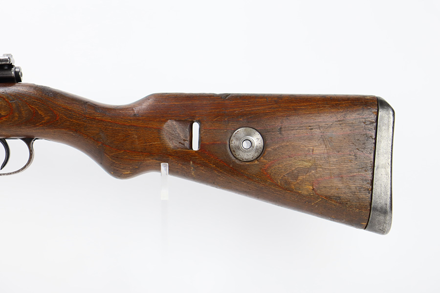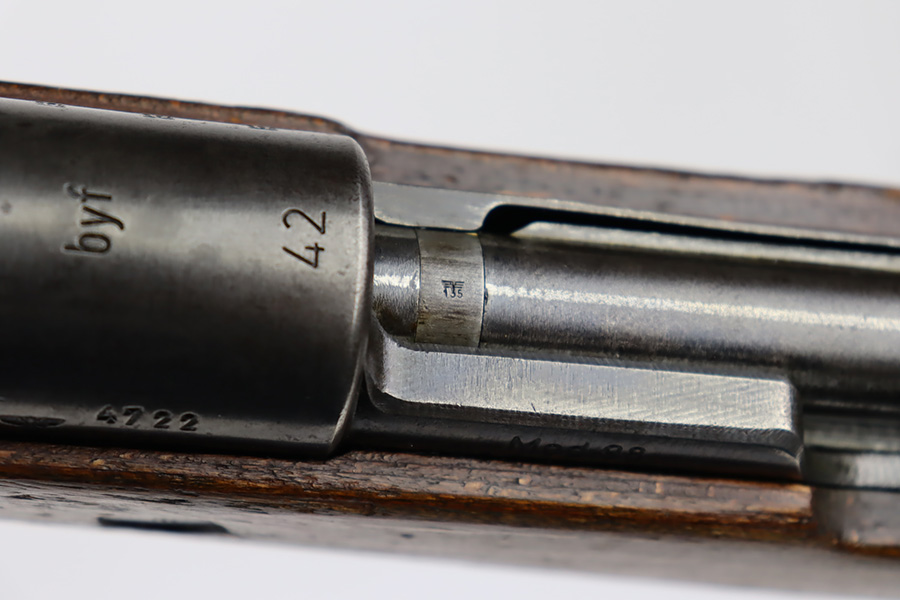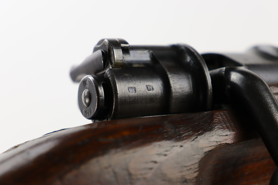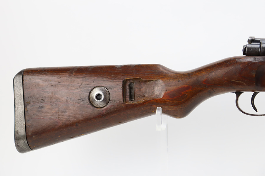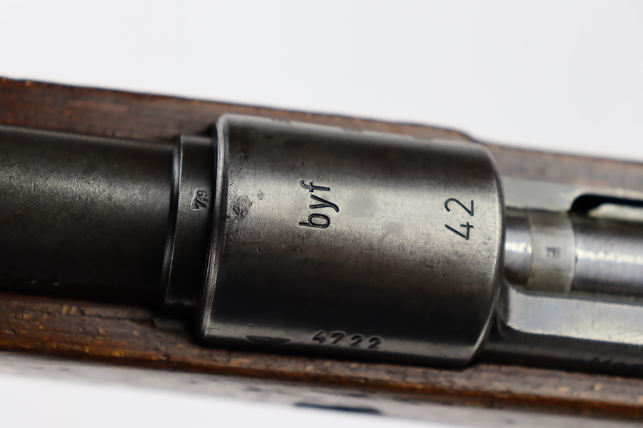11/3/23 – This is a nice example of a BYF 42 Mauser K98 rifle issued to the Nazi military in 1942. It is all matching, but some of the small parts are not numbered. The stock is matching-numbered and has the proper waffen proofs. The bluing on the metal parts rates roughly 25% with obvious finish loss and spotty oxidation throughout. The wood furniture shows the typical signs of wear and use – minor dings and scratches throughout. The rifling in the bore is slightly worn with tiny pitting in the grooves.