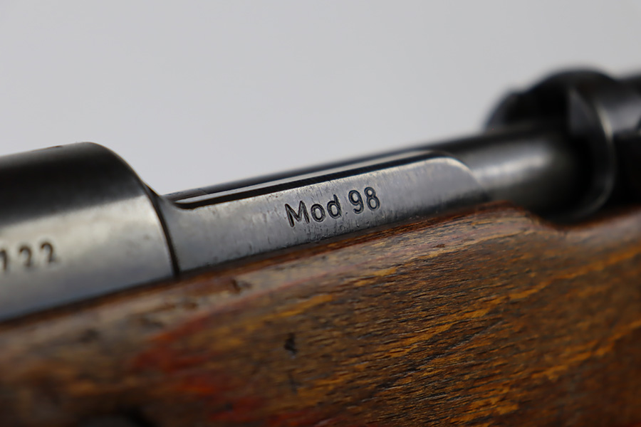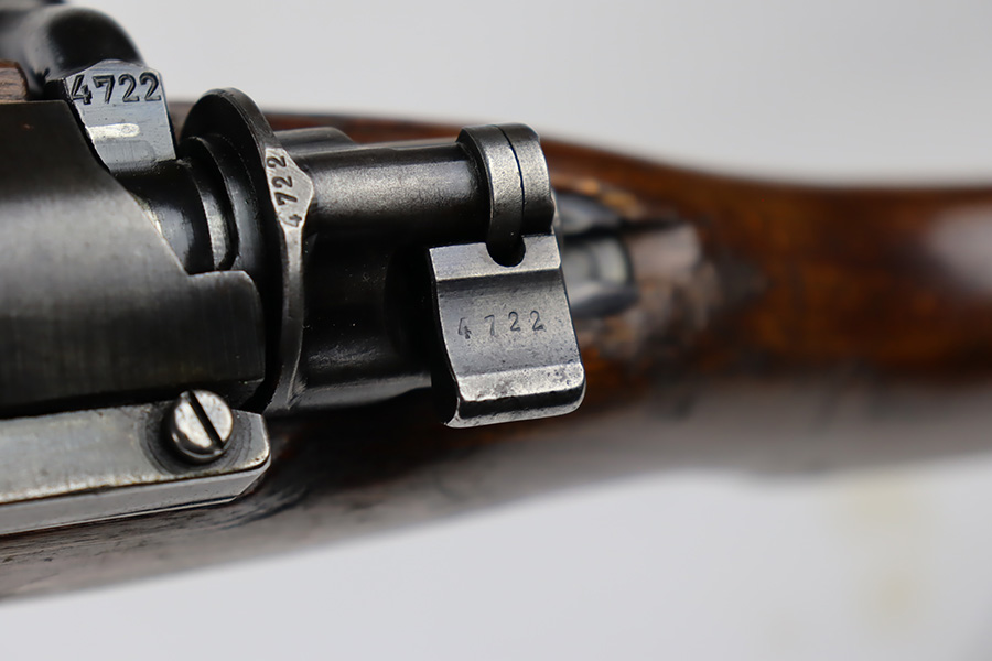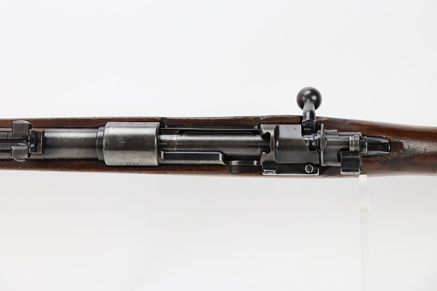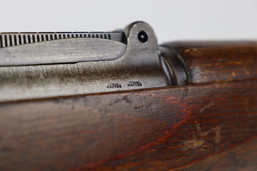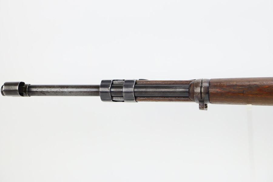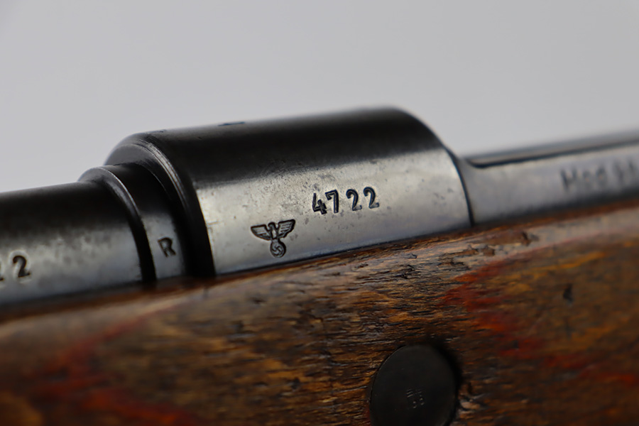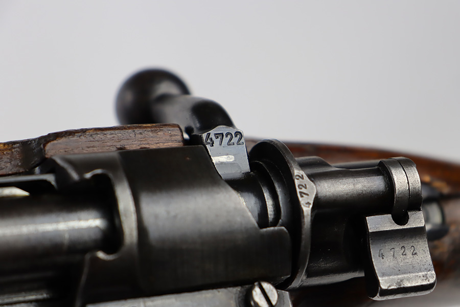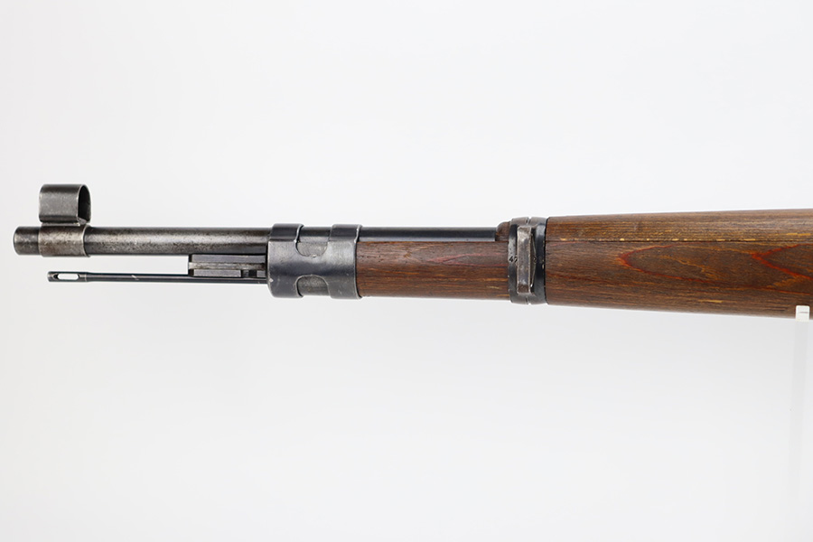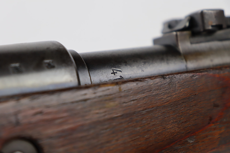 11/3/23 – This is a nice example of a BYF 42 Mauser K98 rifle issued to the Nazi military in 1942. It is all matching, but some of the small parts are not numbered. The stock is matching-numbered and has the proper waffen proofs. The bluing on the metal parts rates roughly 25% with obvious finish loss and spotty oxidation throughout. The wood furniture shows the typical signs of wear and use – minor dings and scratches throughout. The rifling in the bore is slightly worn with tiny pitting in the grooves.