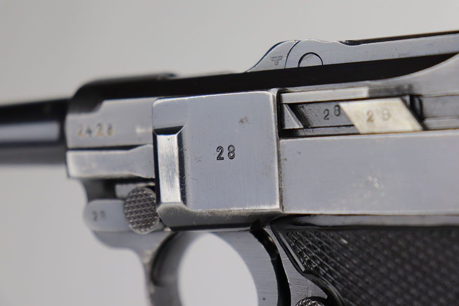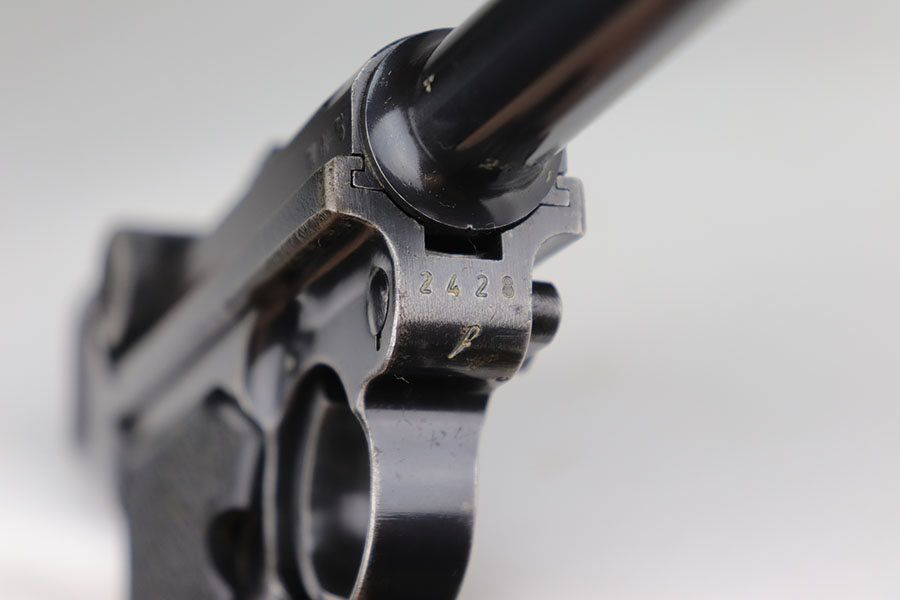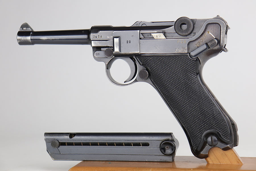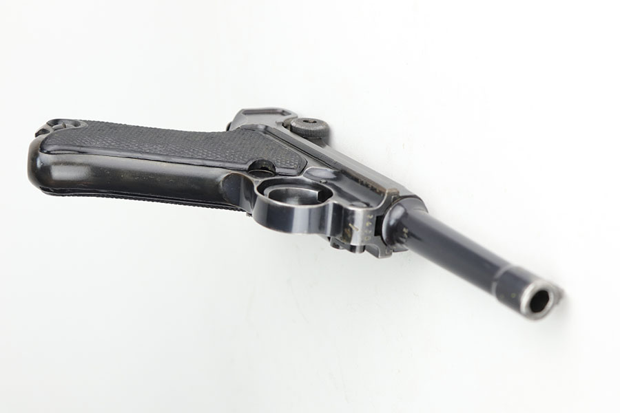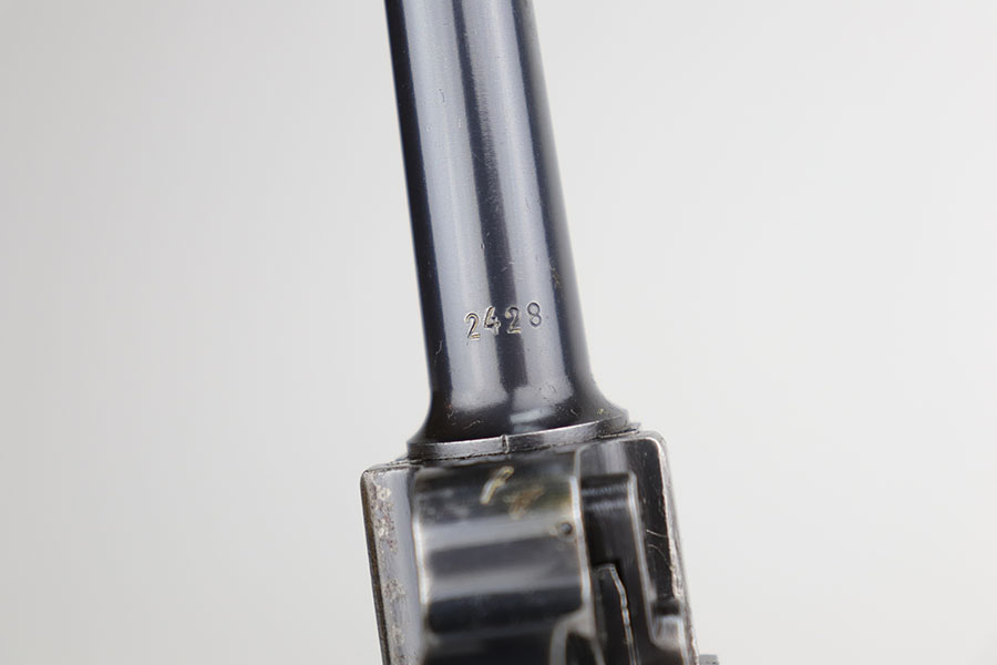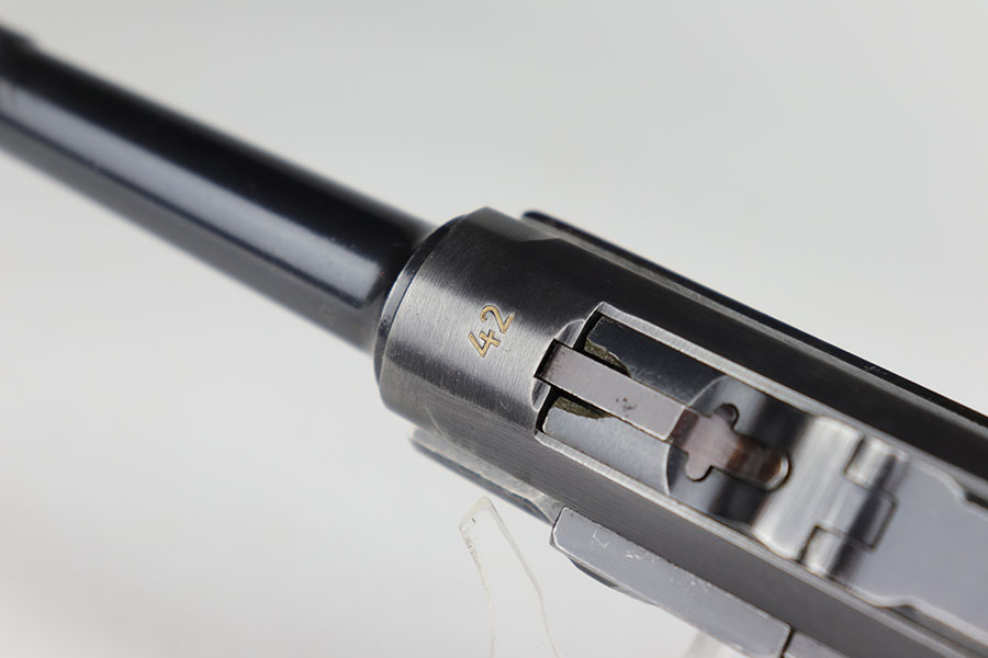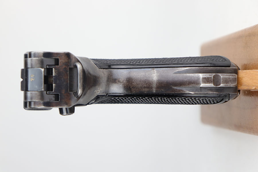 11/6/20 – This is a matching and original Black Widow Mauser Luger from 1942. The original finish rates at maybe 75% with the majority of the finish loss on the back strap. Also some wear on the barrel and high edges, with a little freckling on rear left side of frame and right side rail. Front strap a little brown from patina. Excellent bore. Original Black Widow grips and magazine. No cracks or chips on either.