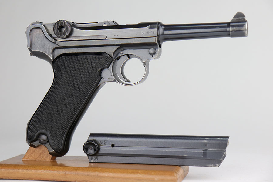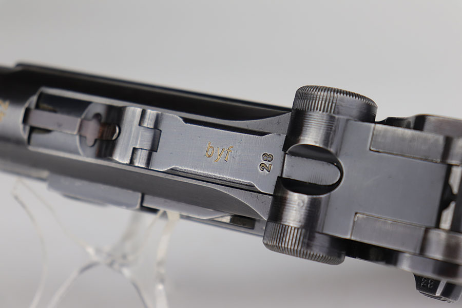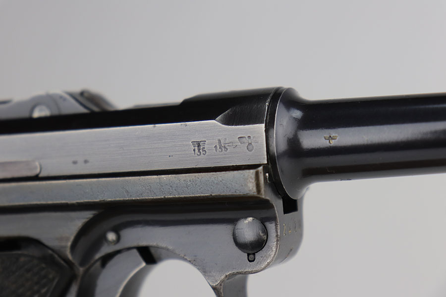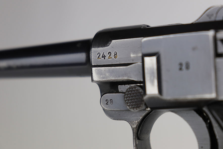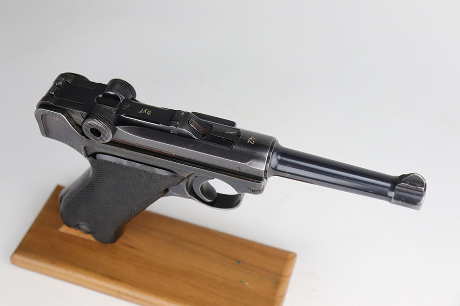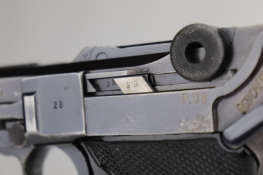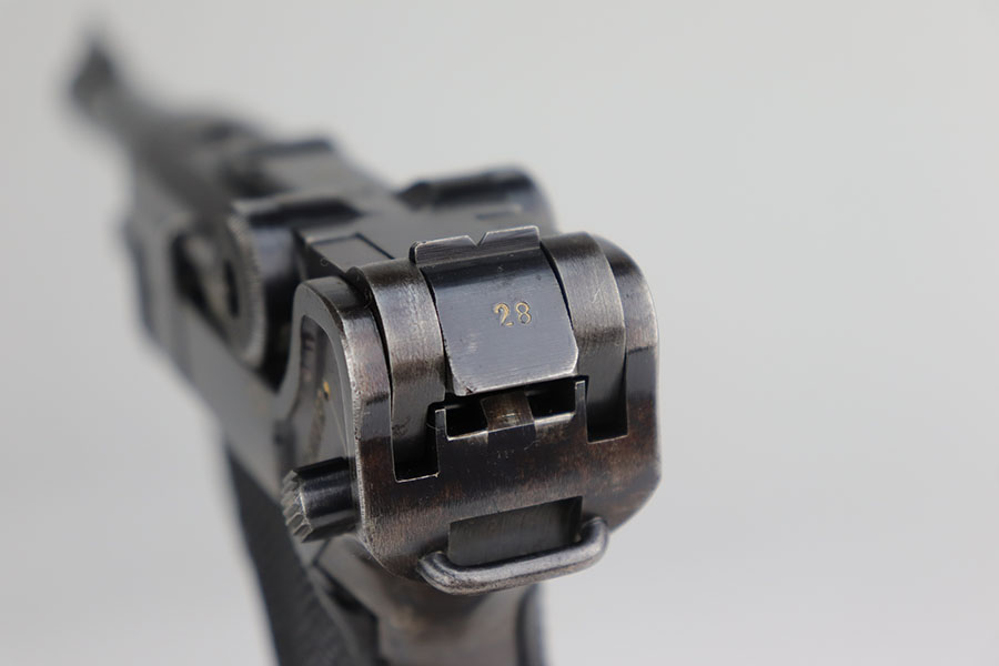 11/6/20 – This is a matching and original Black Widow Mauser Luger from 1942. The original finish rates at maybe 75% with the majority of the finish loss on the back strap. Also some wear on the barrel and high edges, with a little freckling on rear left side of frame and right side rail. Front strap a little brown from patina. Excellent bore. Original Black Widow grips and magazine. No cracks or chips on either.