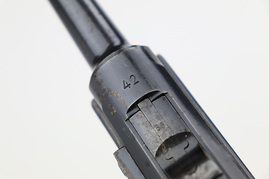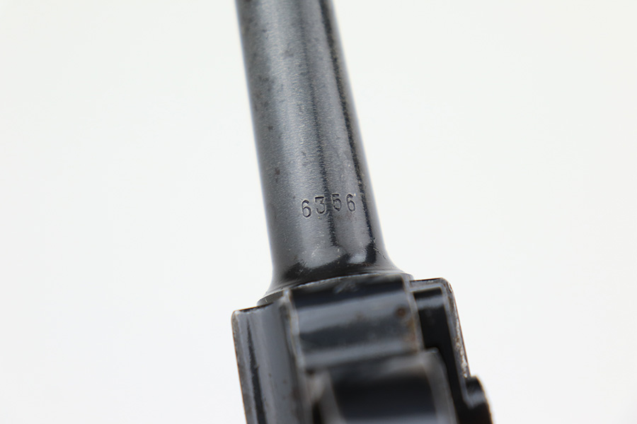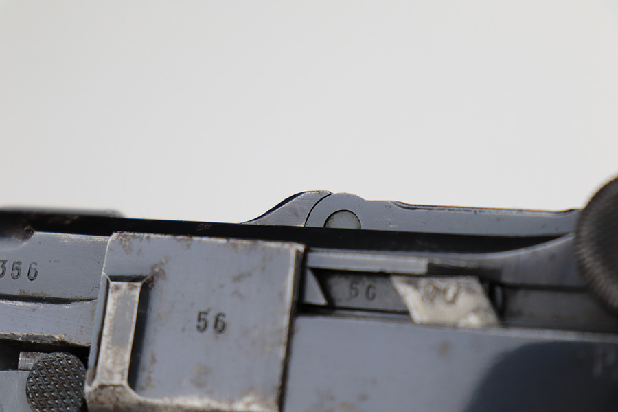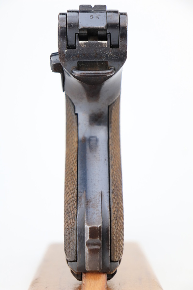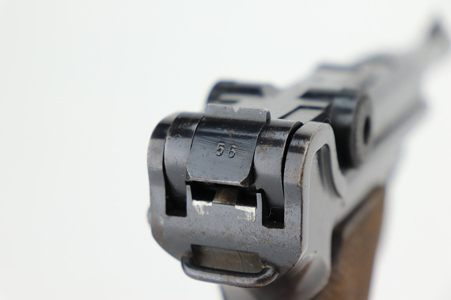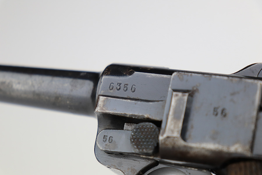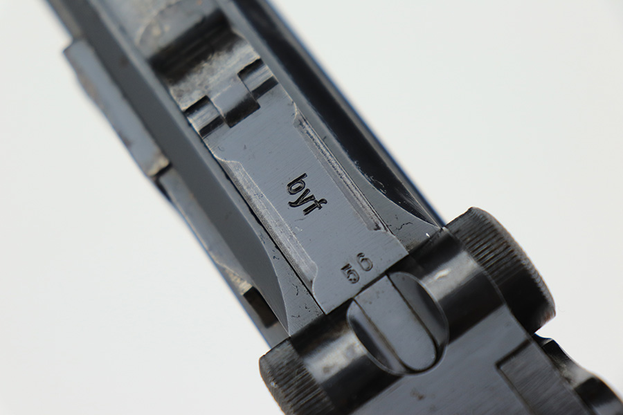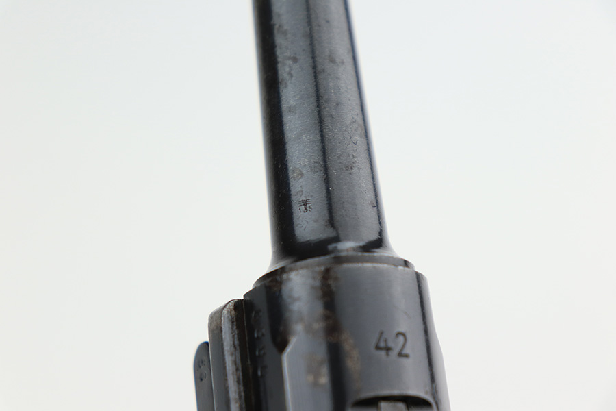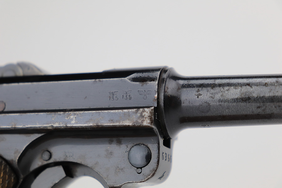 5/18/23 – This is a BYF 42 Mauser Luger issued to the Nazi military in 1942. It is all matching and has the proper “Eagle 135” military acceptance proofs. The gun has retained roughly 85% of its original finish. The majority of the finish loss is along the barrel, but there is splotchy discoloration and spotty oxidation on most of the gun. Fitted with un-numbered wood grips – small chip on the top edge of the left panel. The left panel fits a little loose and wiggles just a bit. Comes with a mismatched “Eagle 37” proofed magazine. The bore has pretty good rifling, but there is frosting throughout.