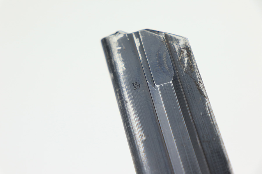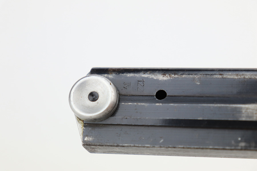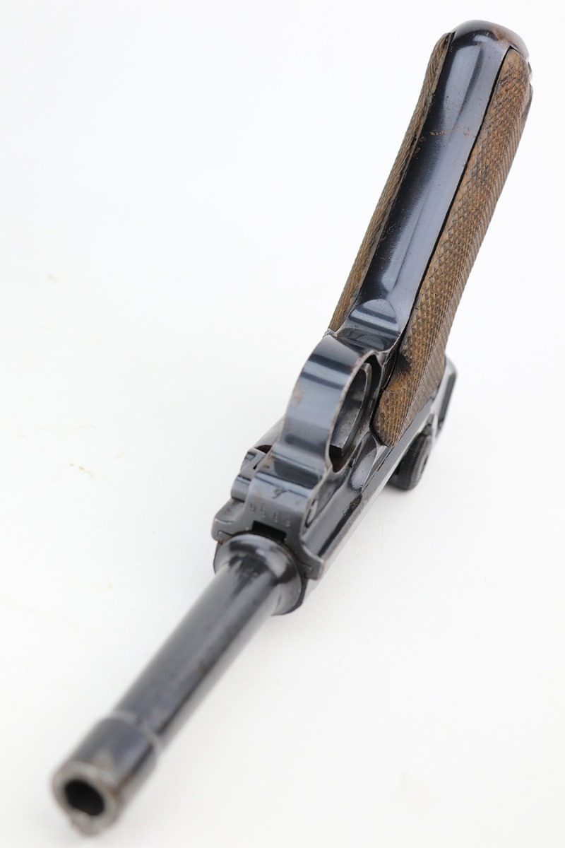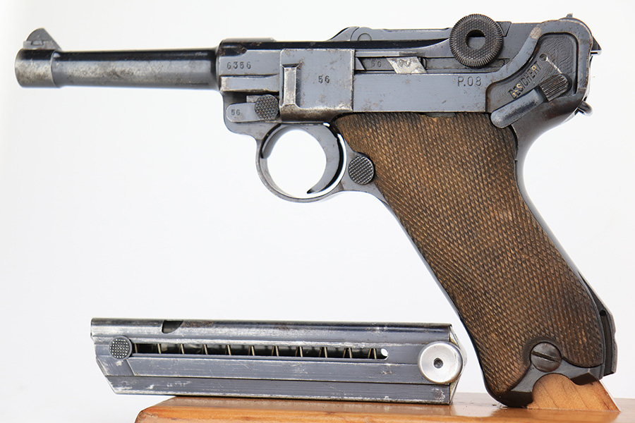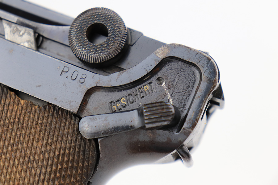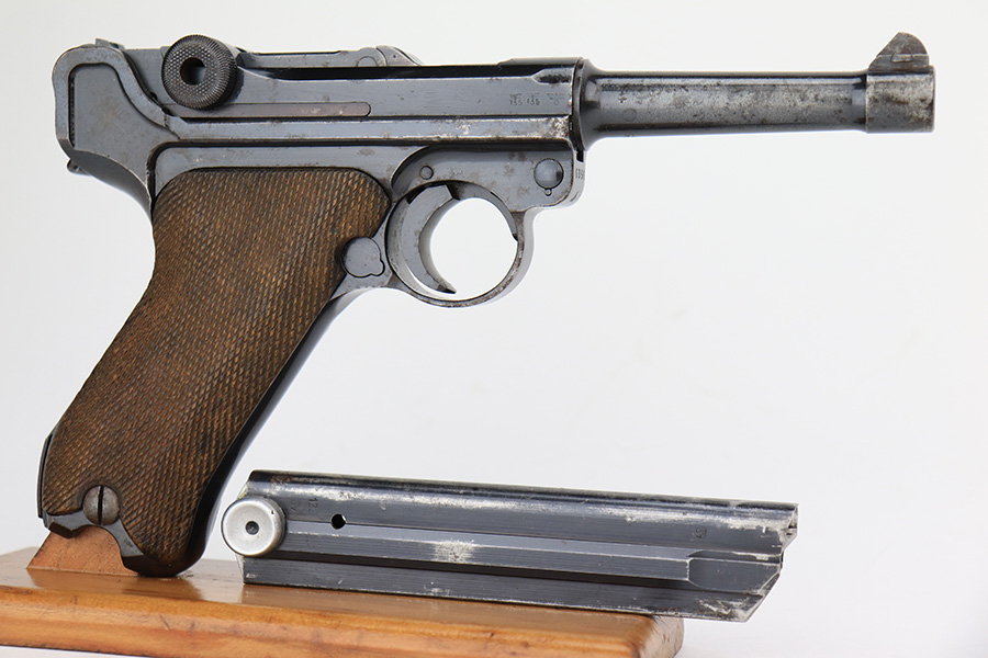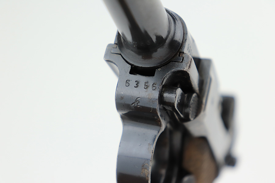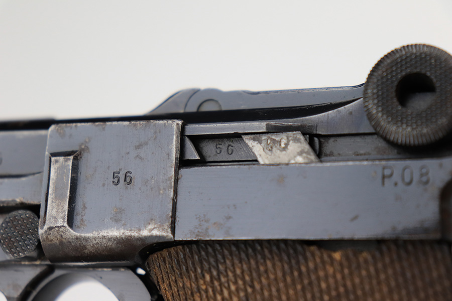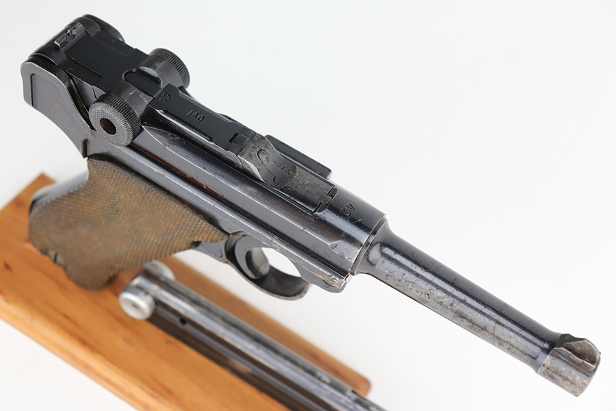 5/18/23 – This is a BYF 42 Mauser Luger issued to the Nazi military in 1942. It is all matching and has the proper “Eagle 135” military acceptance proofs. The gun has retained roughly 85% of its original finish. The majority of the finish loss is along the barrel, but there is splotchy discoloration and spotty oxidation on most of the gun. Fitted with un-numbered wood grips – small chip on the top edge of the left panel. The left panel fits a little loose and wiggles just a bit. Comes with a mismatched “Eagle 37” proofed magazine. The bore has pretty good rifling, but there is frosting throughout.
