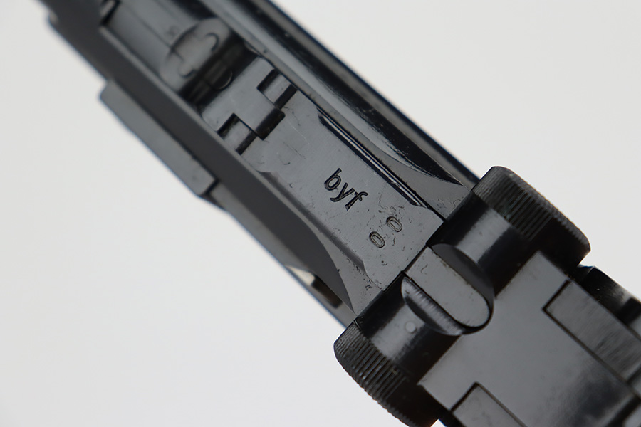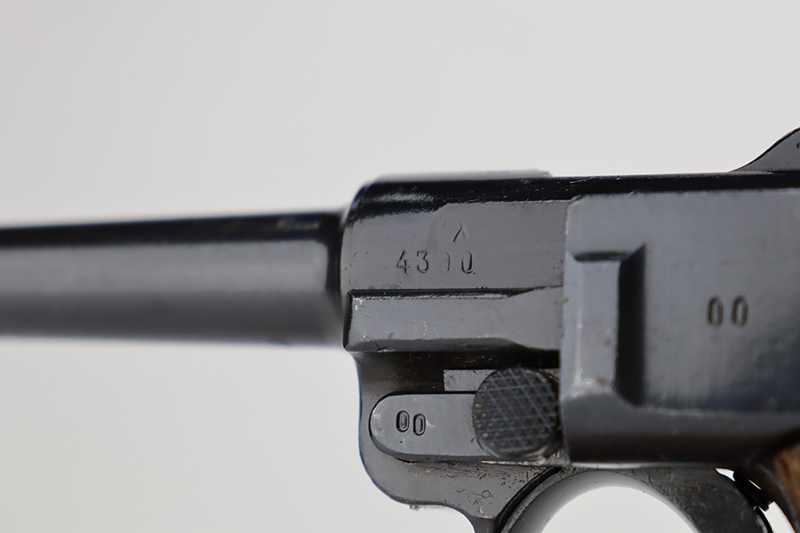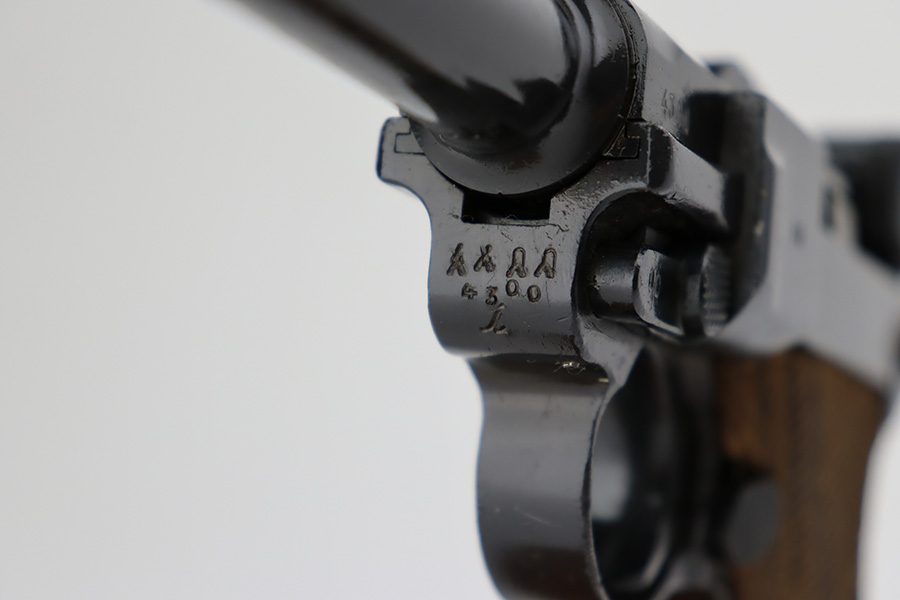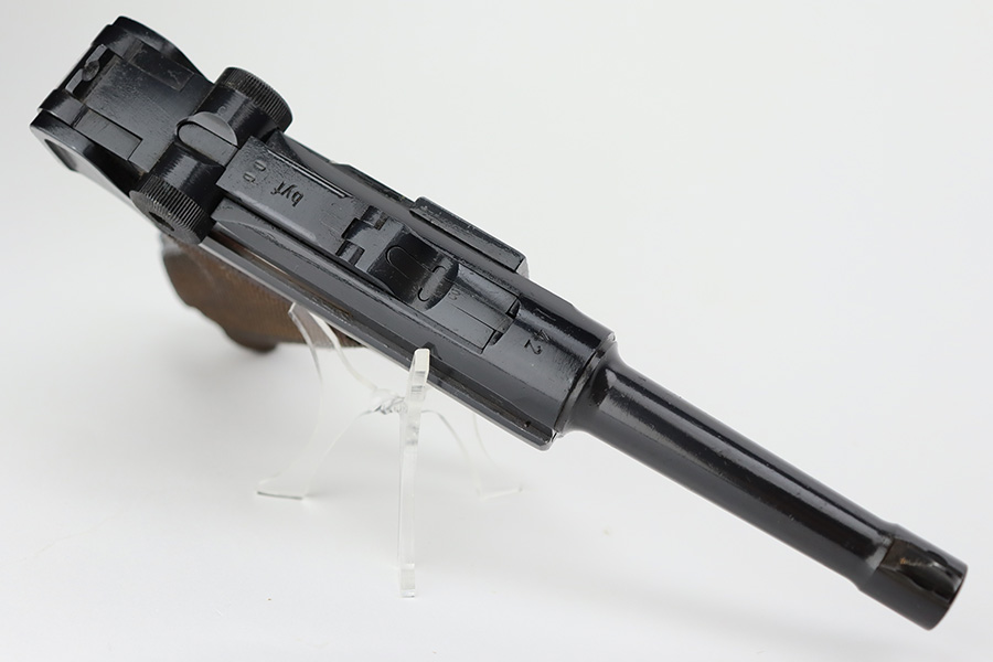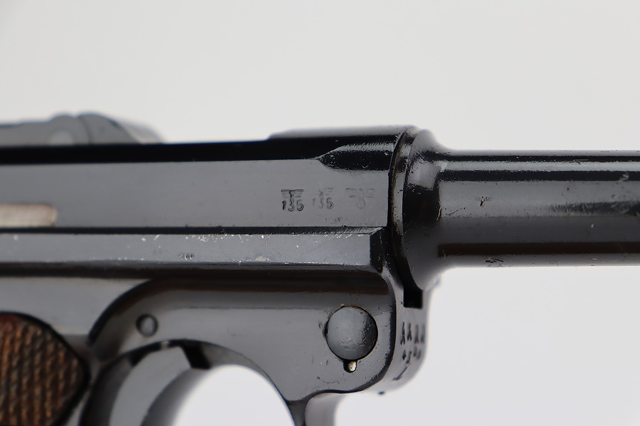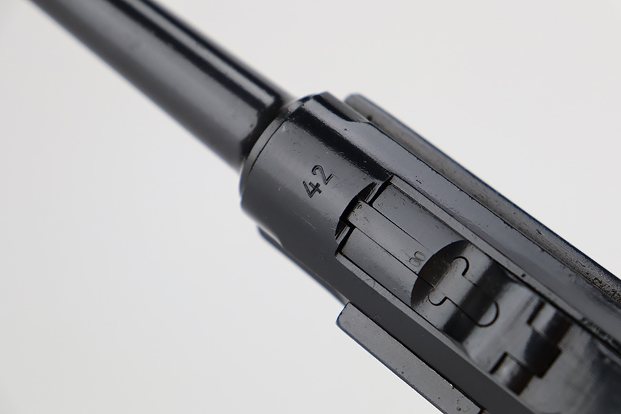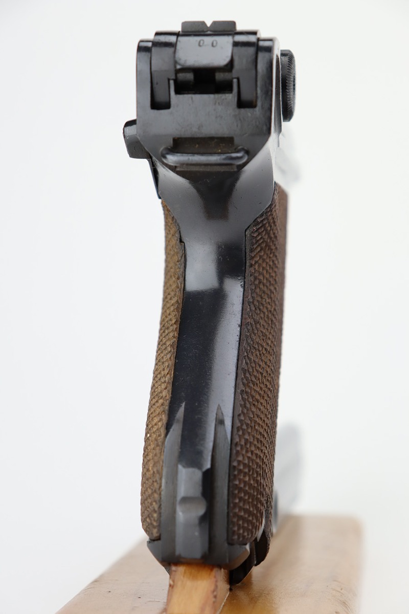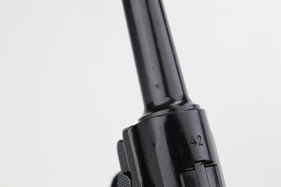 8/2/23 – This is a nice example of a BYF 42 Mauser Luger issued to the Nazi military in 1942. It is all matching, but the frame has been re-numbered. The whole gun has a dark “Russian dipped” finish, and there is a “Russian X” on the left side of the slide. There is virtually no actual finish loss, just some areas of pin-pricking under the finish and some tiny handling marks here and there. Fitted with matching-numbered wood grips – tiny chip in the upper corner of the left panel. Comes with an original “Black Widow” magazine. The rifling in the bore is fairly worn with obvious pitting and oxidation throughout.