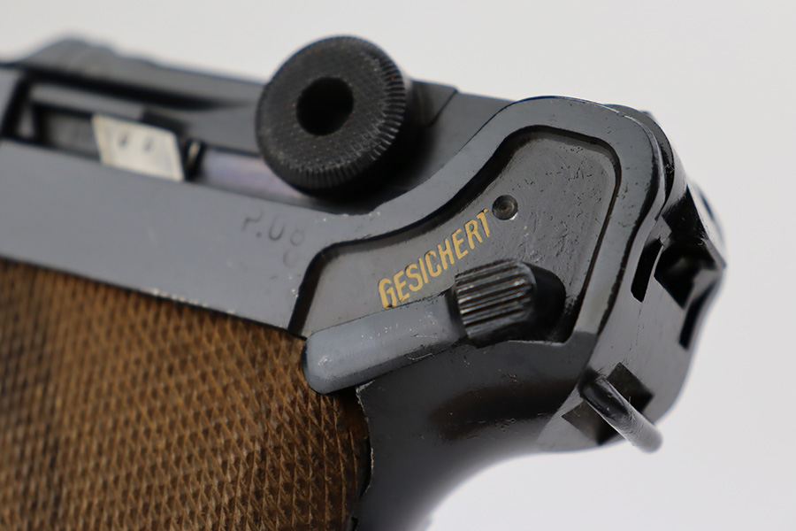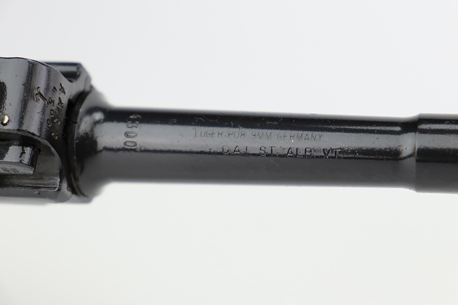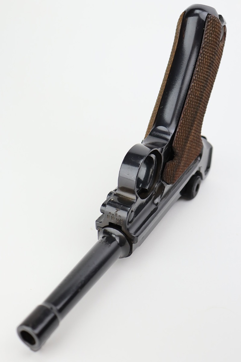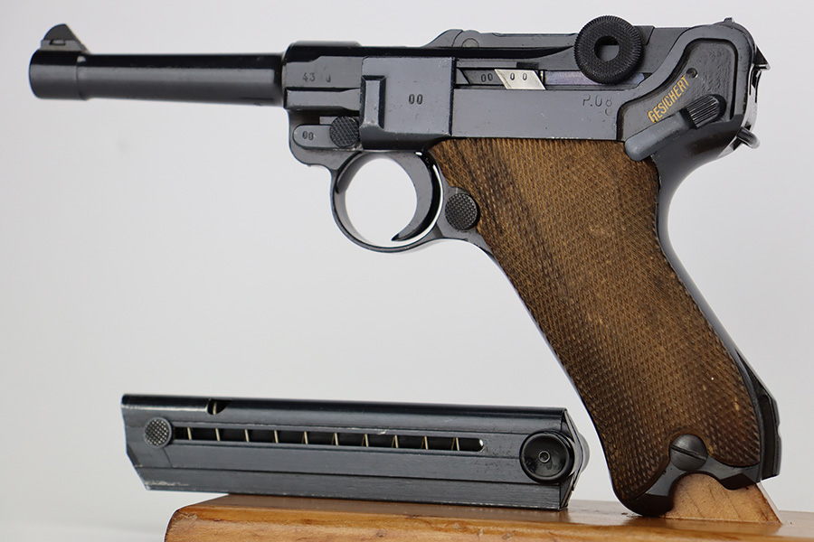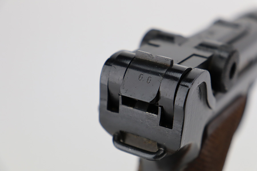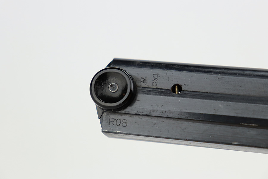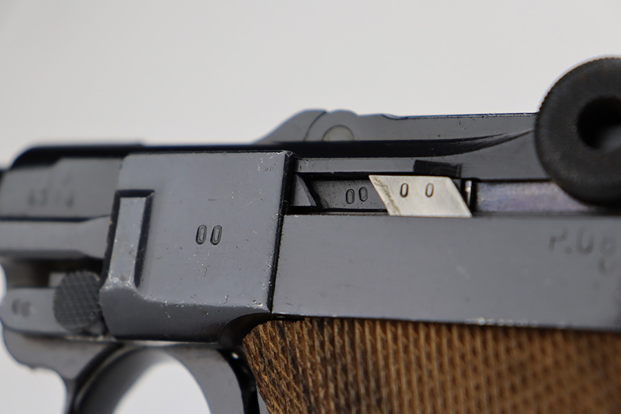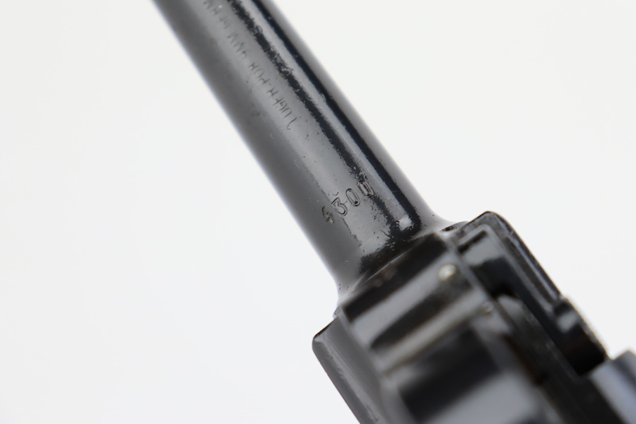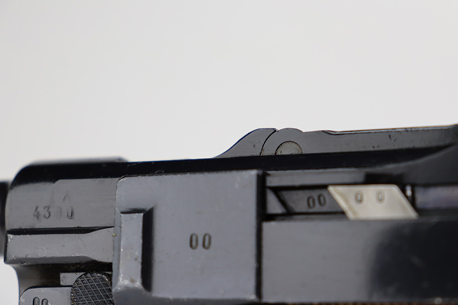 8/2/23 – This is a nice example of a BYF 42 Mauser Luger issued to the Nazi military in 1942. It is all matching, but the frame has been re-numbered. The whole gun has a dark “Russian dipped” finish, and there is a “Russian X” on the left side of the slide. There is virtually no actual finish loss, just some areas of pin-pricking under the finish and some tiny handling marks here and there. Fitted with matching-numbered wood grips – tiny chip in the upper corner of the left panel. Comes with an original “Black Widow” magazine. The rifling in the bore is fairly worn with obvious pitting and oxidation throughout.