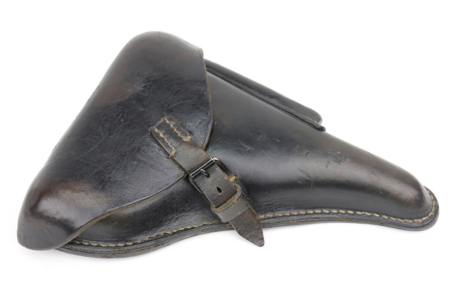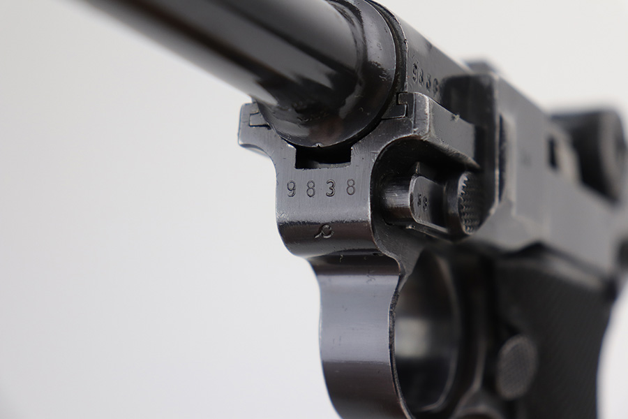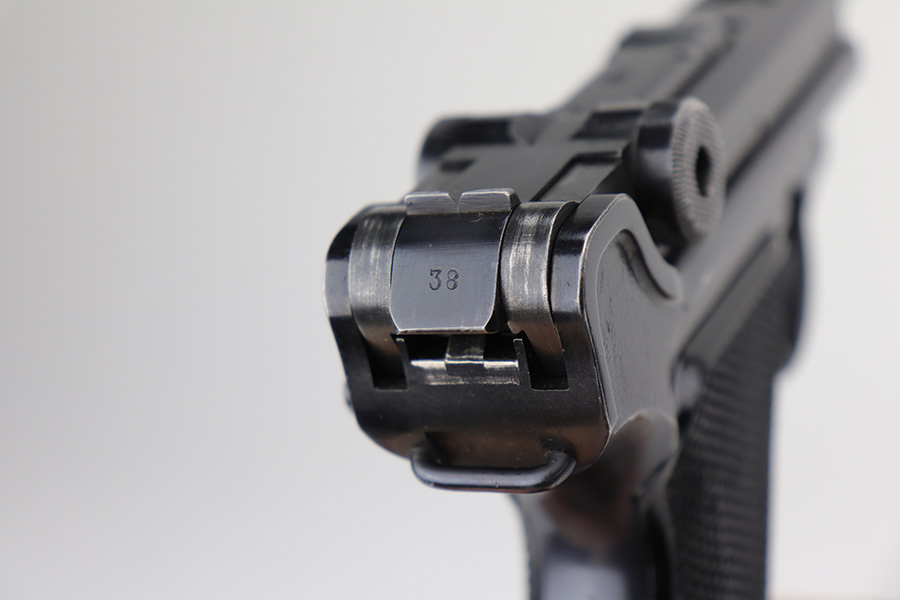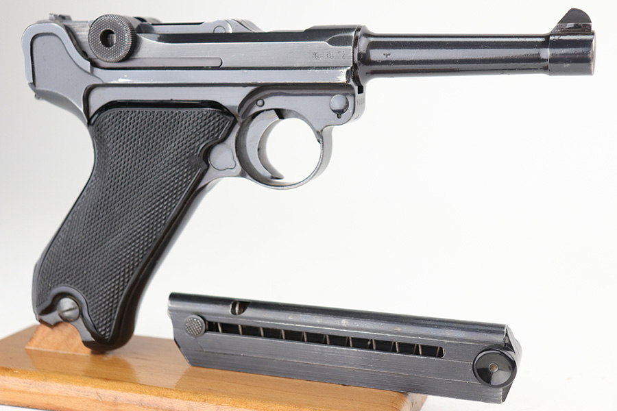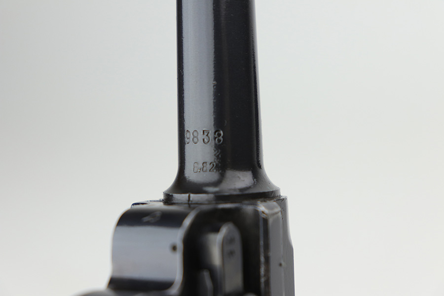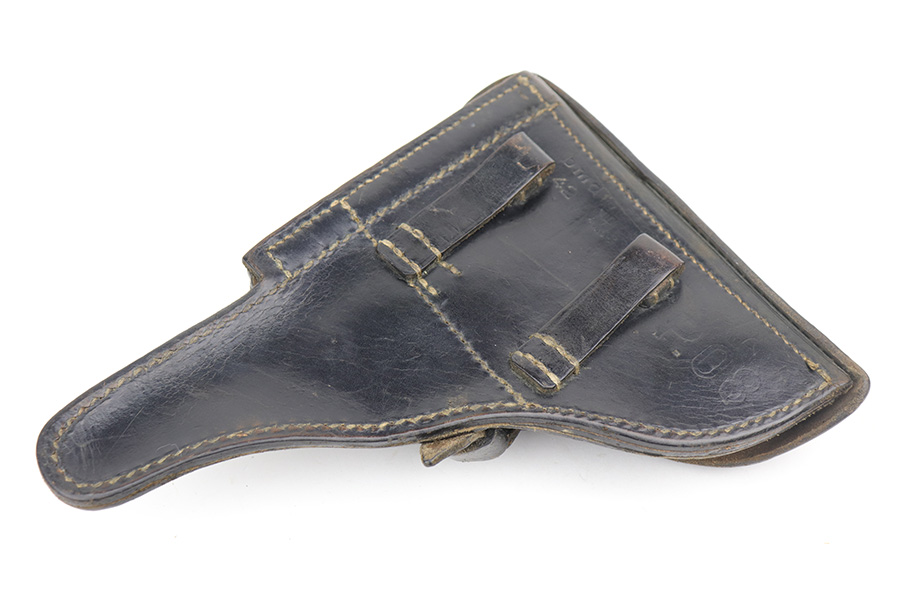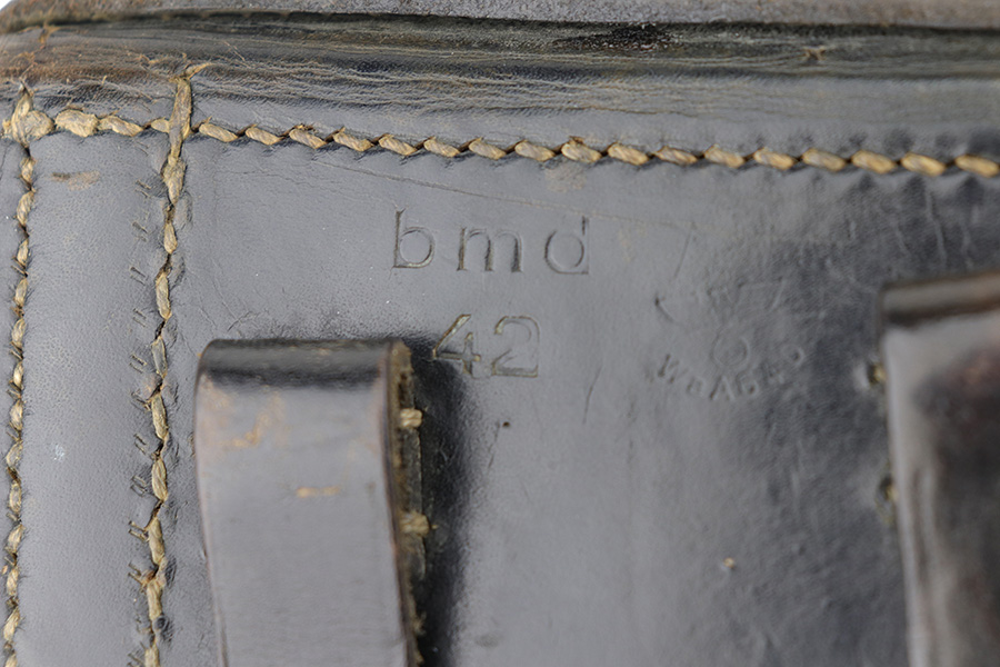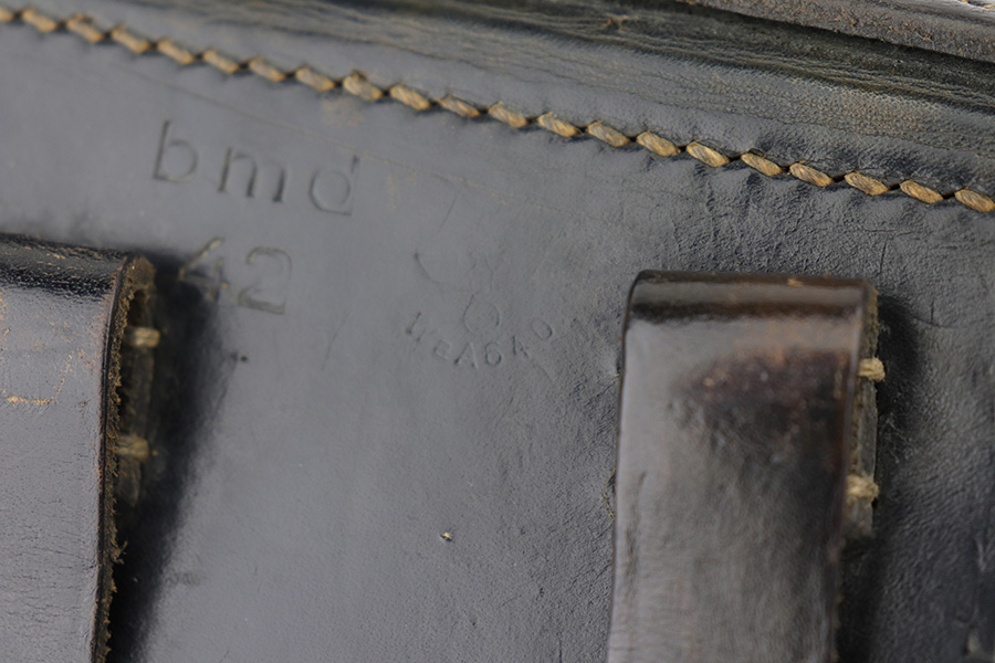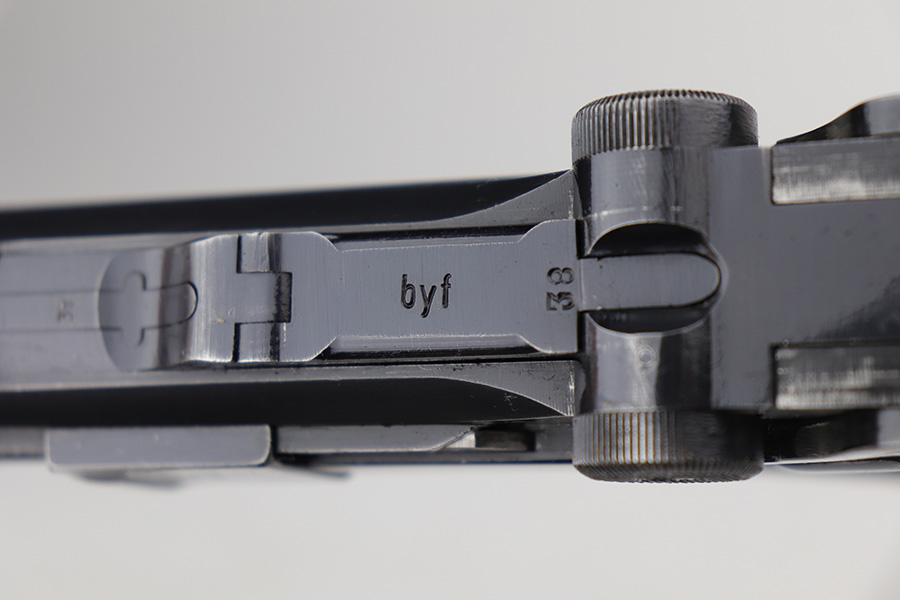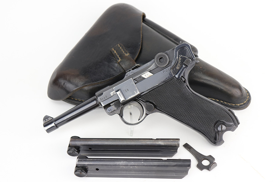 8/19/21 – This is a nice, honest example of a complete Black Widow Mauser Luger rig from 1942. The pistol is all matching and original with maybe 92% of the blue remaining. Most of the finish loss is on the sideplate or muzzle, with a little more on the ears of the receiver. Excellent bore. Excellent Black Widow grips with only minor handling wear. Total of two original magazines included. Original E/655 tool is in the pouch. Rig is completed by the excellent ’42 dated holster, which is ‘bmd’ maker marked.