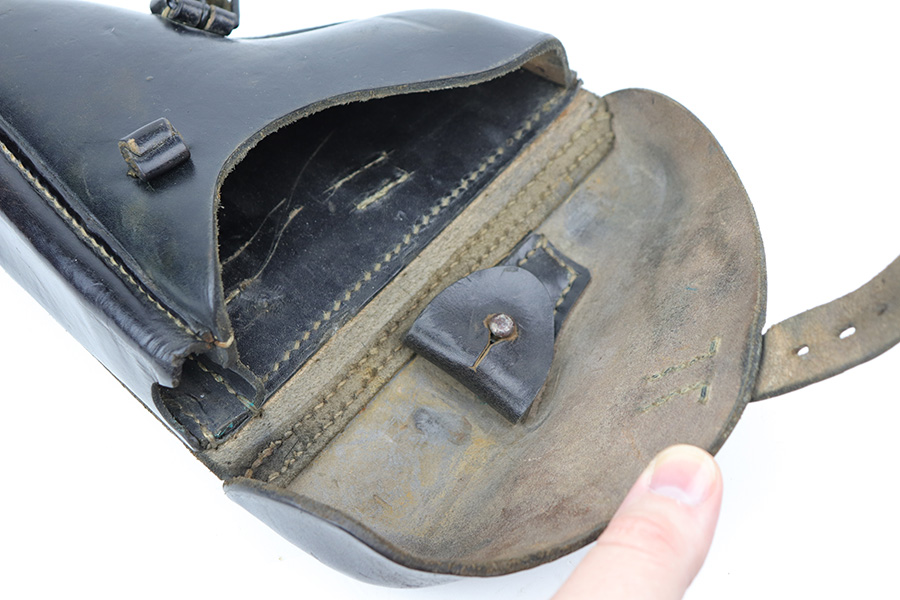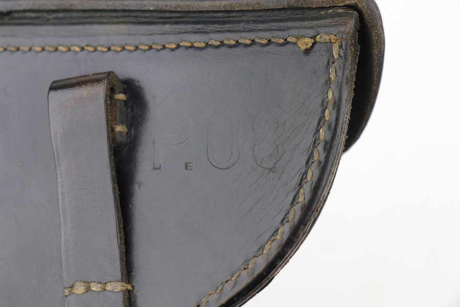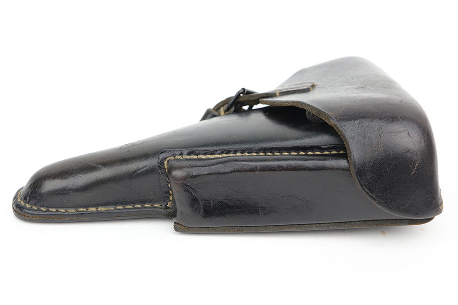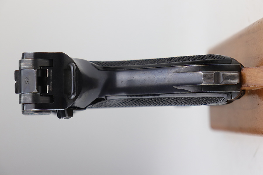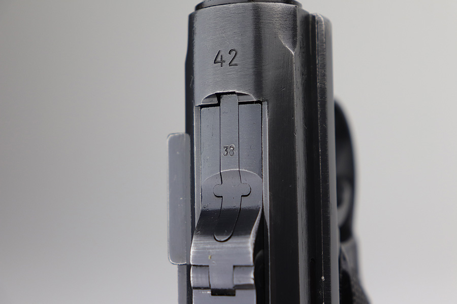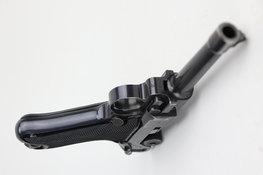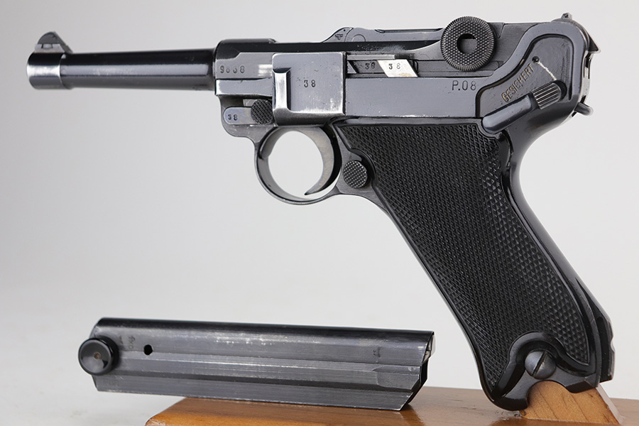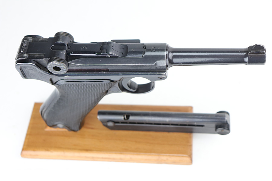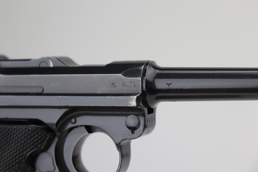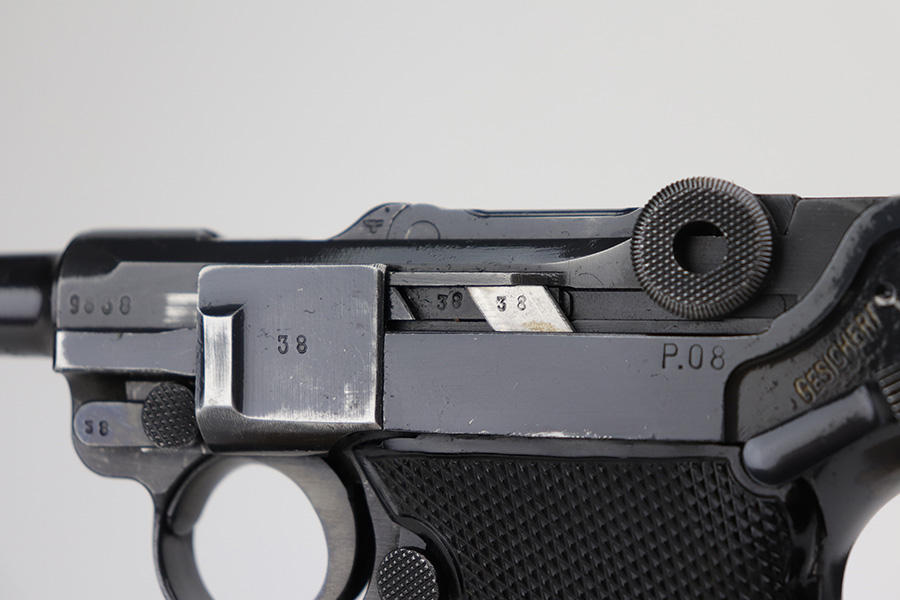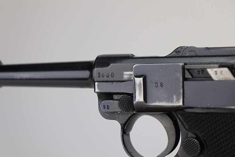 8/19/21 – This is a nice, honest example of a complete Black Widow Mauser Luger rig from 1942. The pistol is all matching and original with maybe 92% of the blue remaining. Most of the finish loss is on the sideplate or muzzle, with a little more on the ears of the receiver. Excellent bore. Excellent Black Widow grips with only minor handling wear. Total of two original magazines included. Original E/655 tool is in the pouch. Rig is completed by the excellent ’42 dated holster, which is ‘bmd’ maker marked.