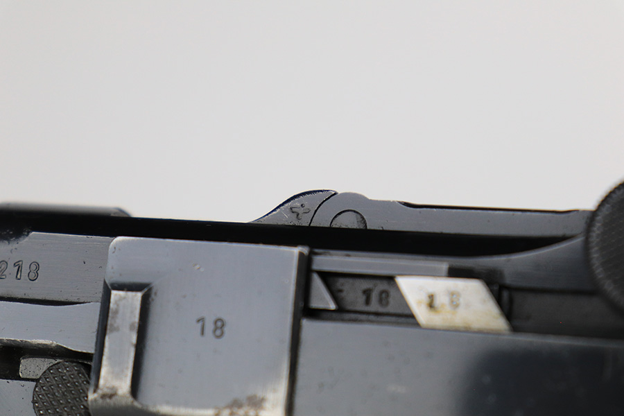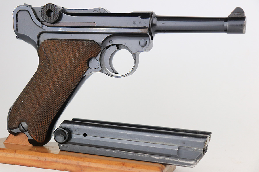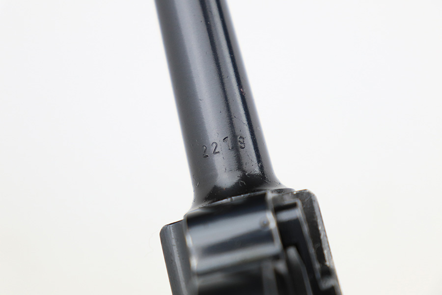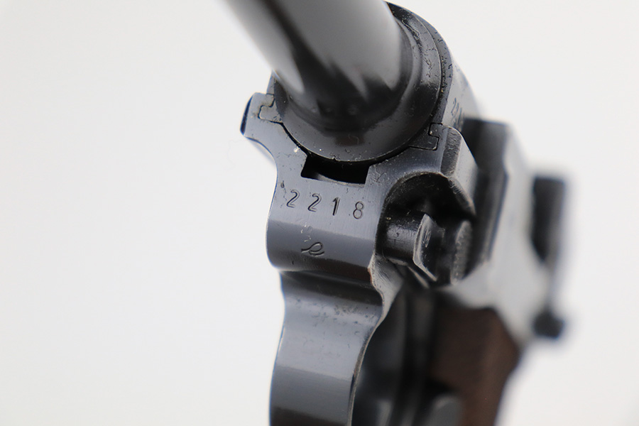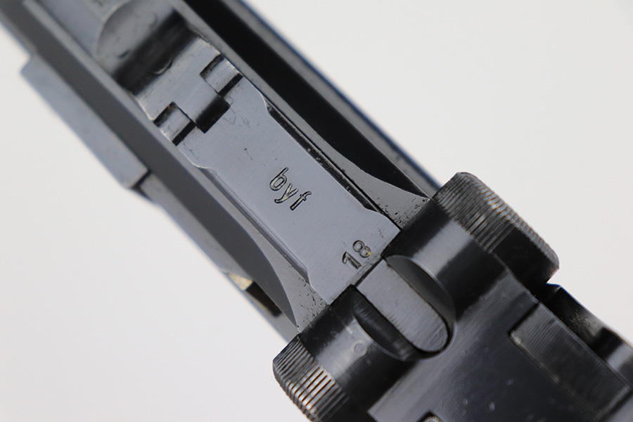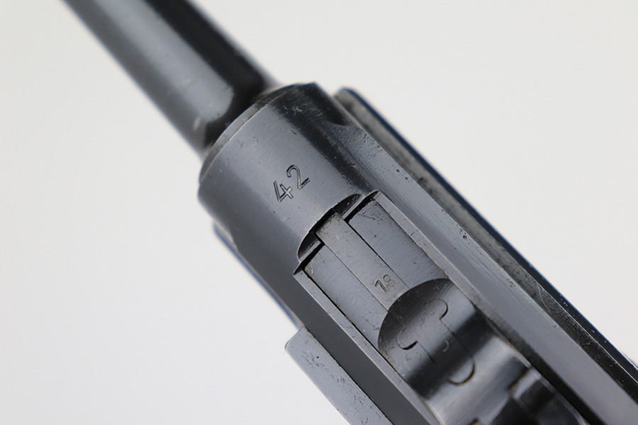 6/5/23 – This is a very nice example of a BYF 42 Mauser Luger issued to the Nazi military in 1942. It is all matching with the proper “Eagle 135” military acceptance proofs. It comes as a rig with a very nice 1942-dated holster, an “Eagle 655” tool, and two original “black widow” magazines. The gun itself has retained about 94-95% of its original finish. There is minor wear around the muzzle, on the side plate, and on the left side of the barrel. One small spot at the base of the front strap. Very light freckling on both grip straps. Areas of light oxidation on the side plate and on the front edge of the right side rail. Fitted with minty un-numbered but waffen-proofed grips. Mint bore.