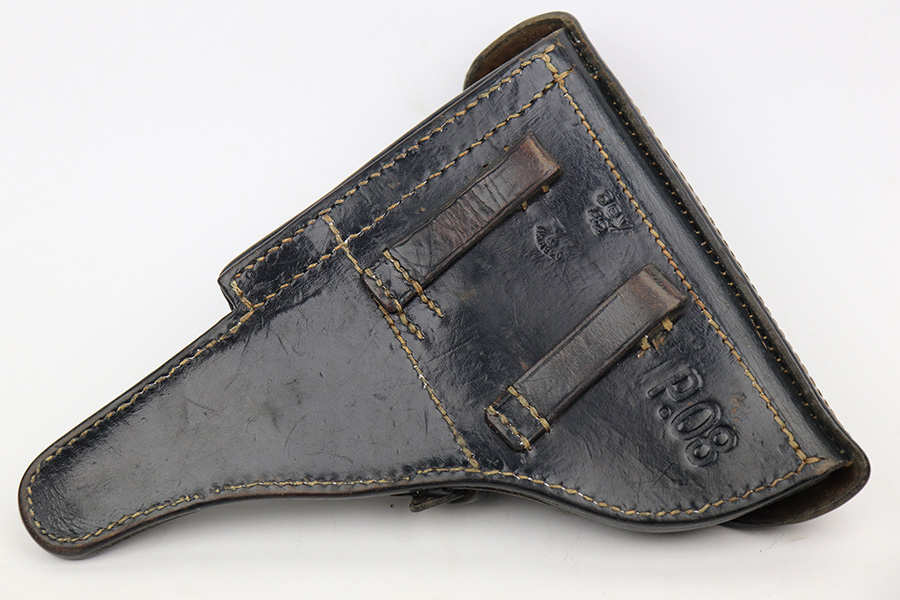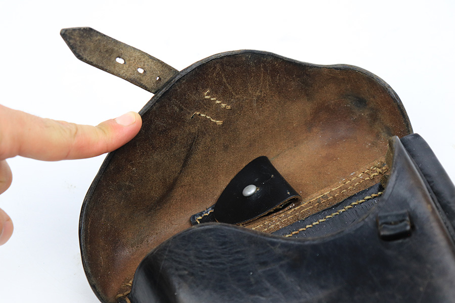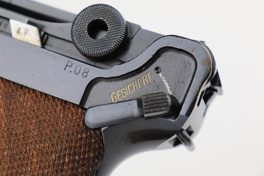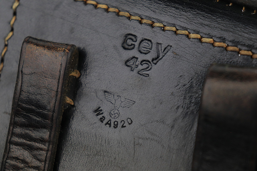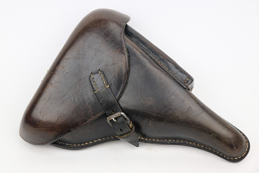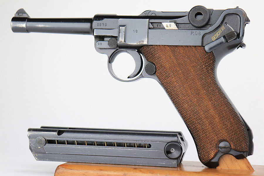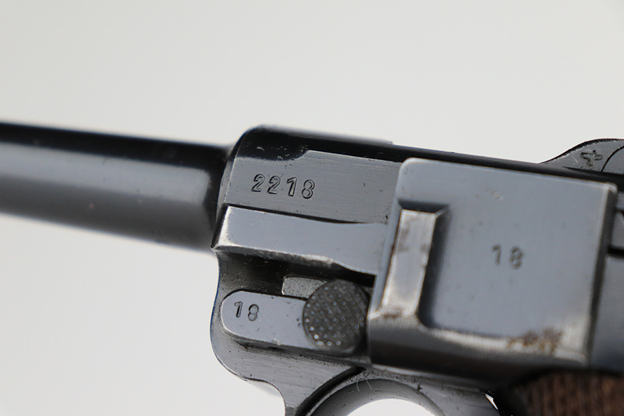 6/5/23 – This is a very nice example of a BYF 42 Mauser Luger issued to the Nazi military in 1942. It is all matching with the proper “Eagle 135” military acceptance proofs. It comes as a rig with a very nice 1942-dated holster, an “Eagle 655” tool, and two original “black widow” magazines. The gun itself has retained about 94-95% of its original finish. There is minor wear around the muzzle, on the side plate, and on the left side of the barrel. One small spot at the base of the front strap. Very light freckling on both grip straps. Areas of light oxidation on the side plate and on the front edge of the right side rail. Fitted with minty un-numbered but waffen-proofed grips. Mint bore.