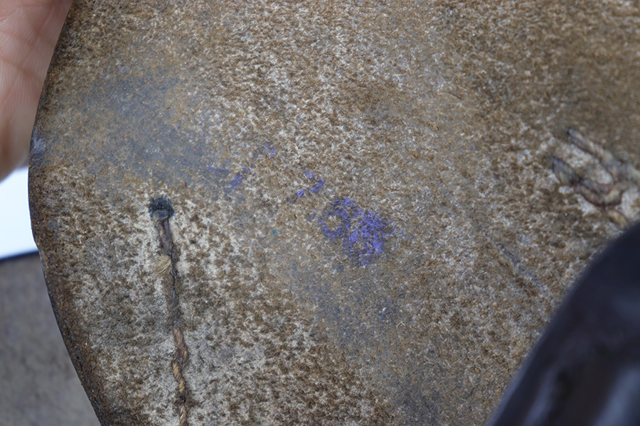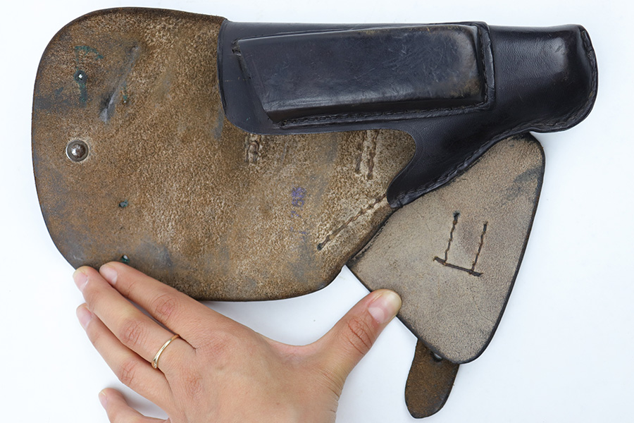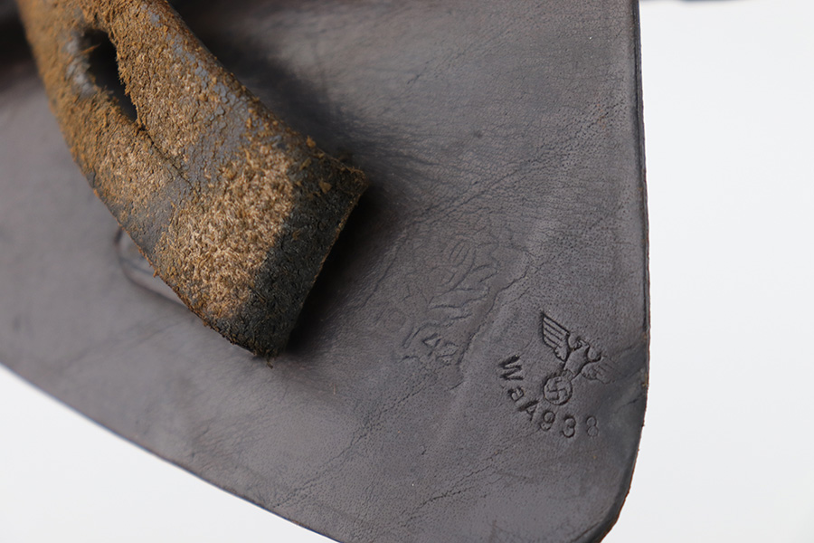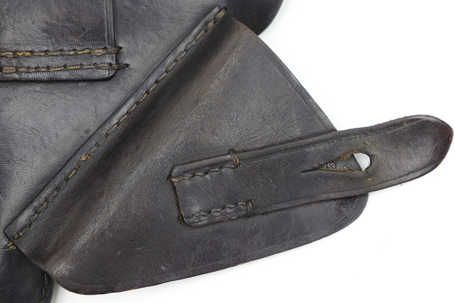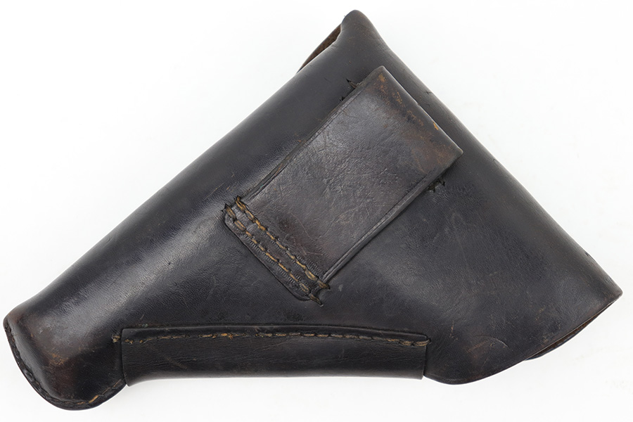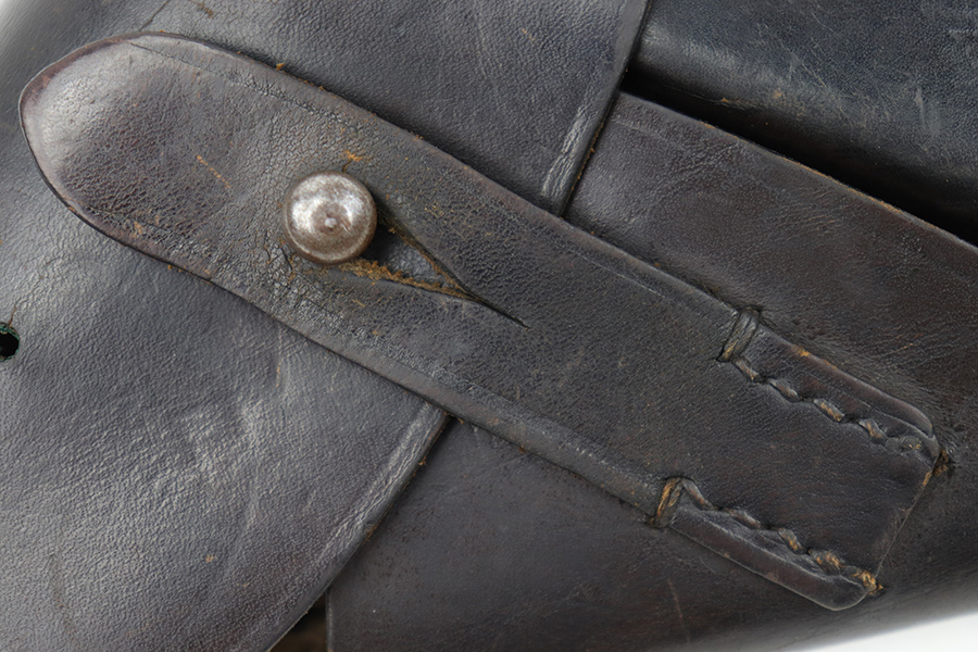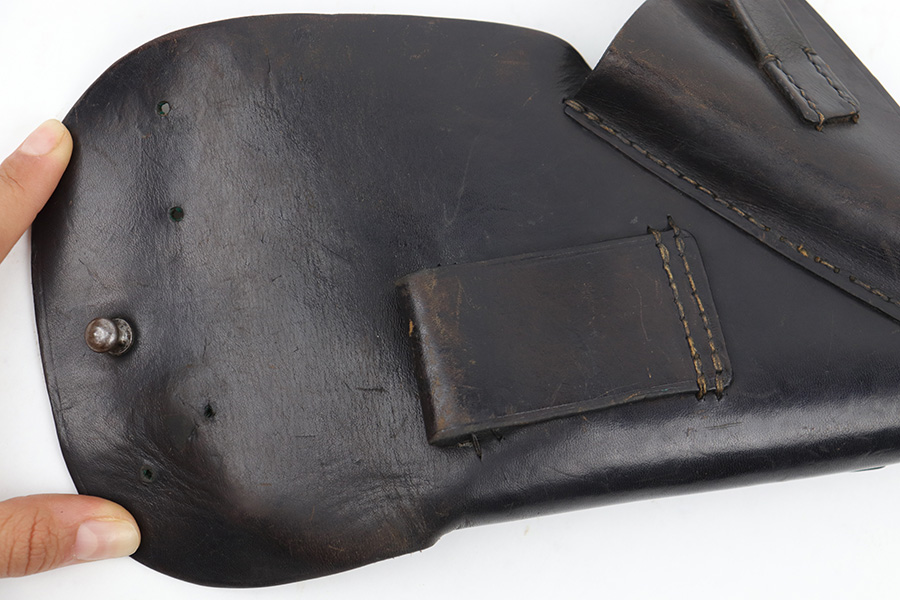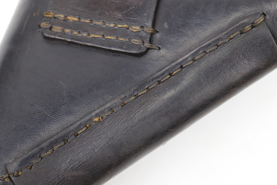 4/7/23 – This is an original 1942 dated holster from WW2. The holster is maker stamped and dated under the closure strap. There’s also a waffen military proof stamp under the closure strap, as shown. The leather is in great condition, although there are 4 small holes in the front leather, likely from added GI embellishments that have been since removed. The leather has normal pliability and signs of previous use without excessive wear or damage. All original stitching intact. The interior leather has a faint remnant of the original designation ink stamp, but all that’s visible is the 7,65mm portion. This would have read either “Mauser” or “Sauer”.