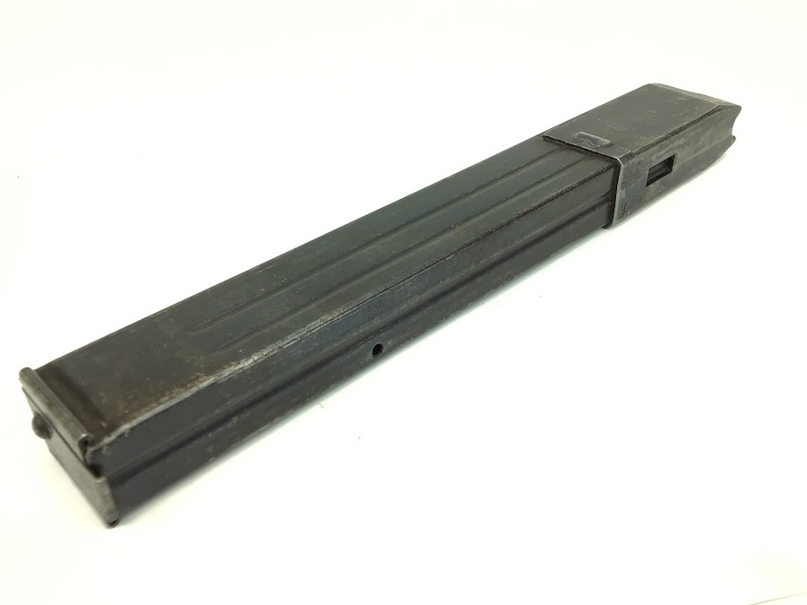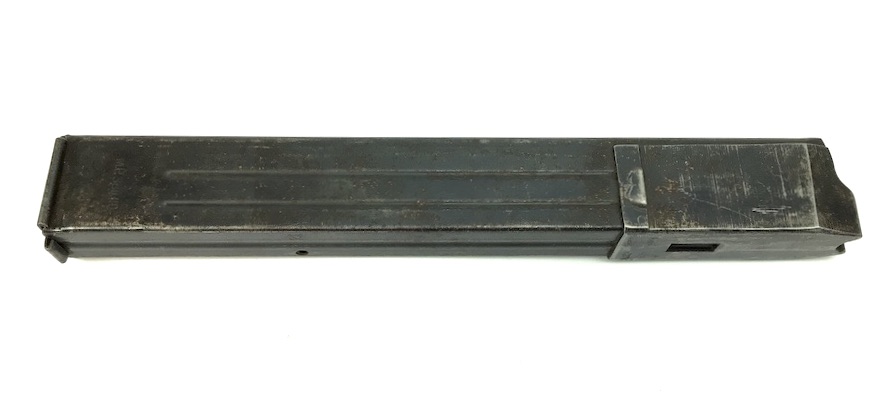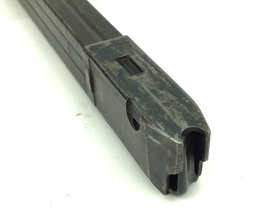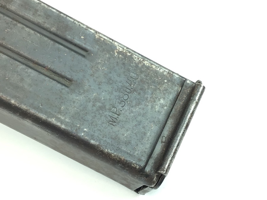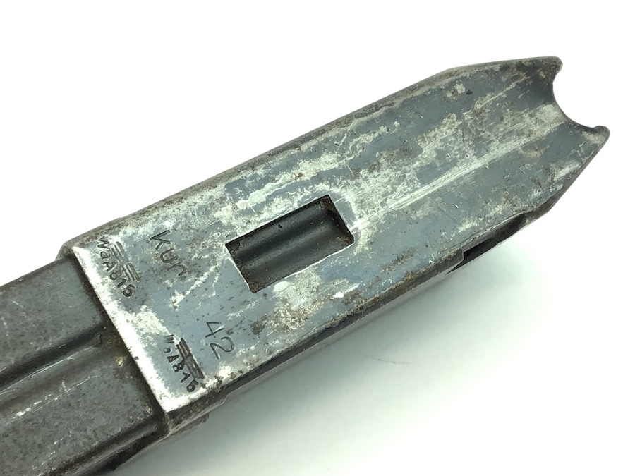 7/14/22 – This is an original 1942 dated Mp 38 or 40 magazine. The magazine is waffen proofed, dated, and maker code stamped. ‘1942 – kur – WaA815’ Overall in very good shape with some normal spots of wear, and minor corrosion. Strong, fully functional spring. Waffen stamped on the interior small parts as well.