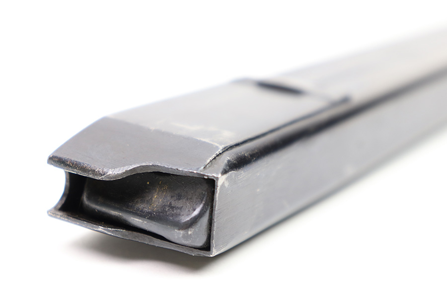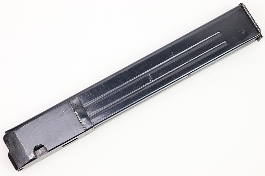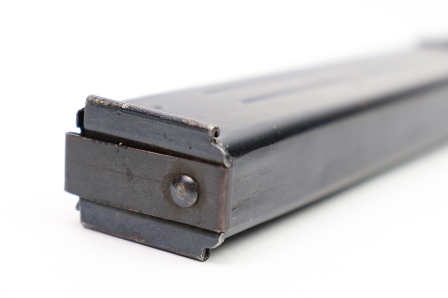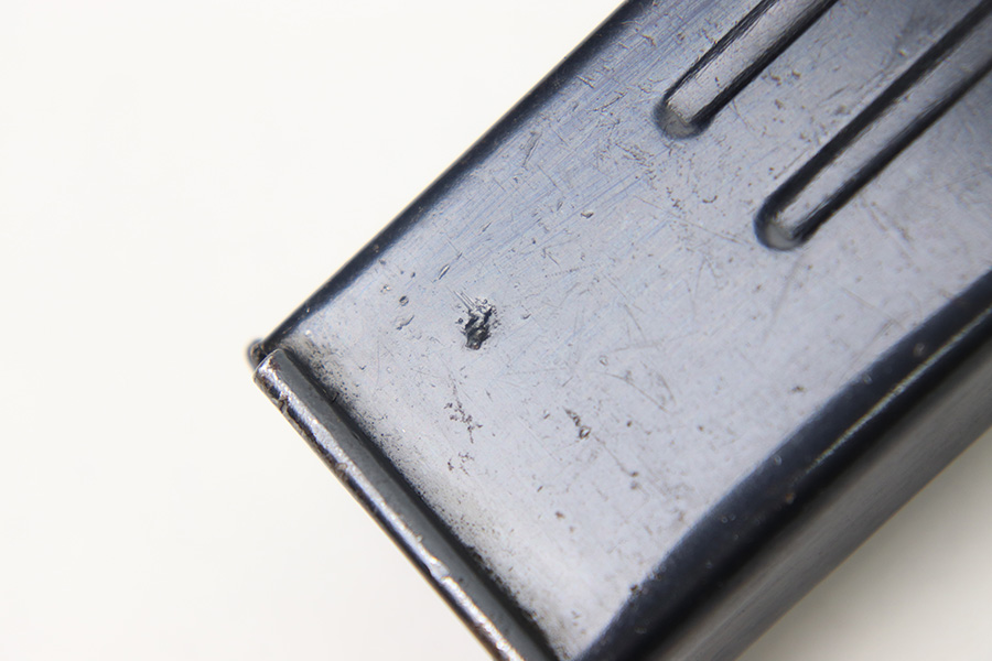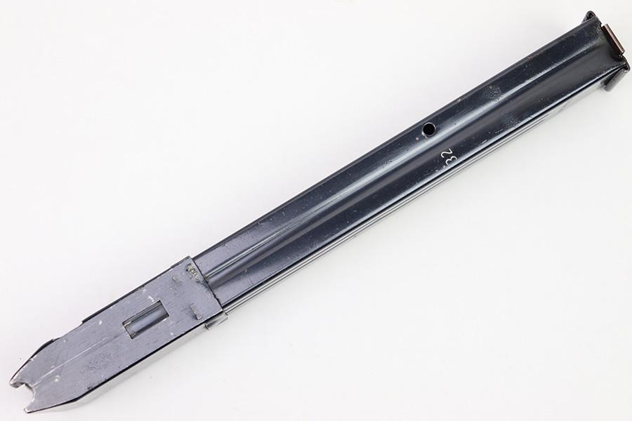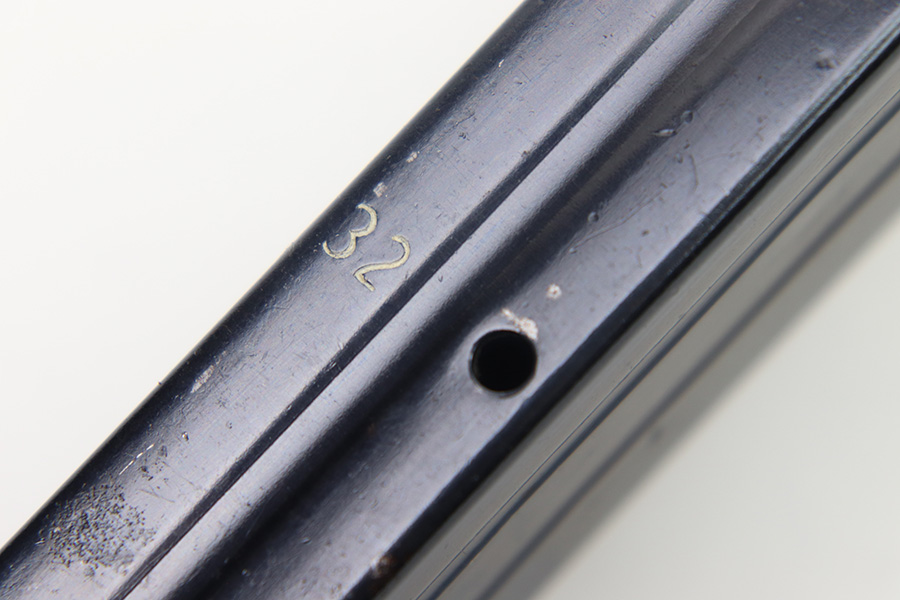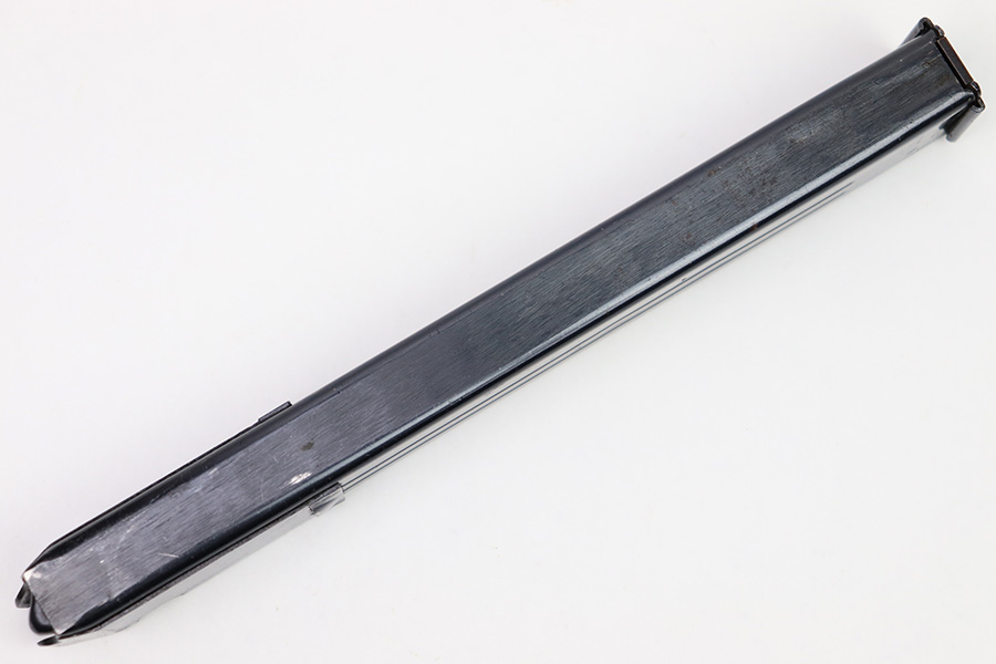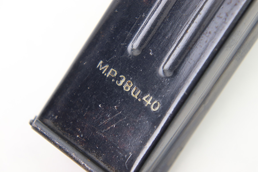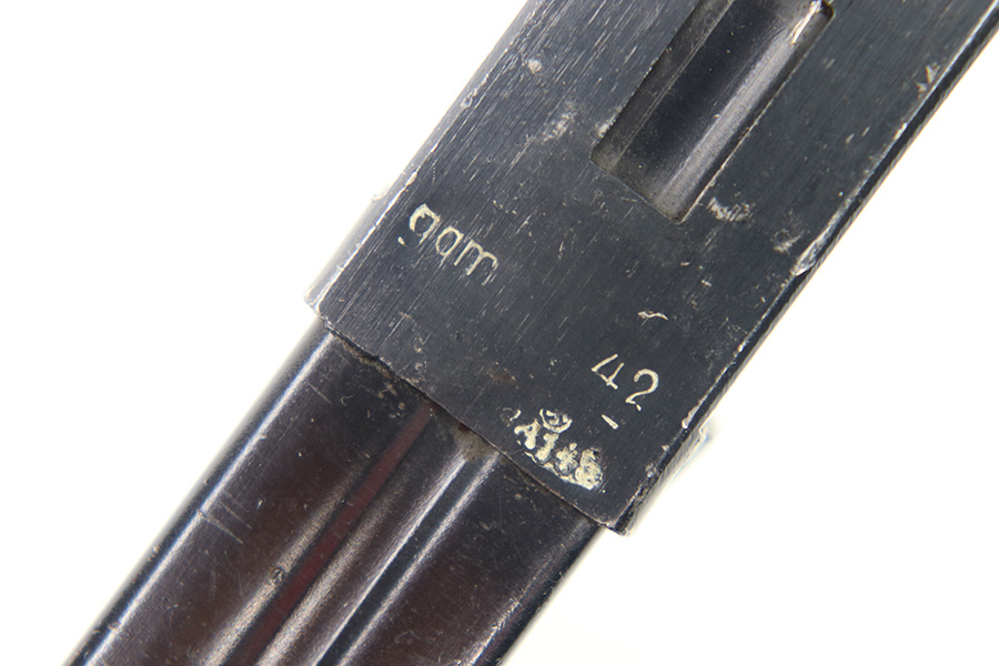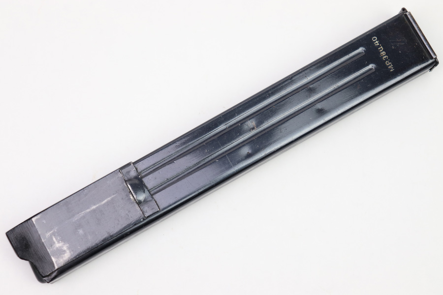 1/12/23 – This is an original MP 40 submachine gun magazine from WW2. The magazine is maker stamped, dated, and waffen proofed on the spine as shown. The magazine is in great condition with most of the original finish still intact. There’s some mild signs of use and aging wear. The spine of the magazine has a small area of light surface pitting, and there’s some speckling patina in a few areas on the tube. The spring is strong and fully functional.