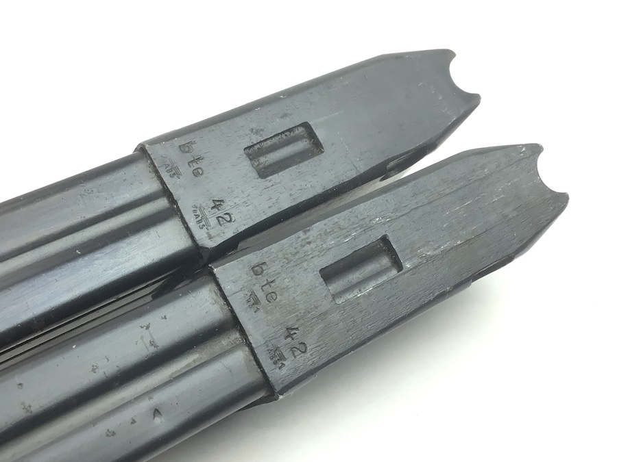 12/14/21 – Set of 2. These are original 1942 dated Mp 38 or 40 magazine. The magazines are waffen proofed, dated, and maker code stamped “bte”.  Overall in great shape with some normal spots of wear, with no corrosion or pitting. Strong, fully functional spring. Follower and base cap stamped as well.