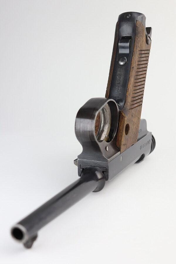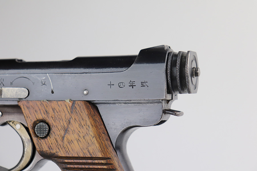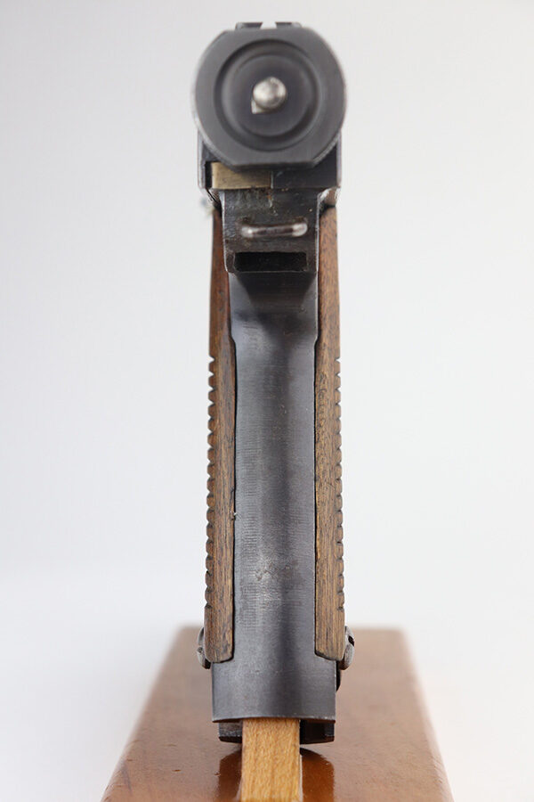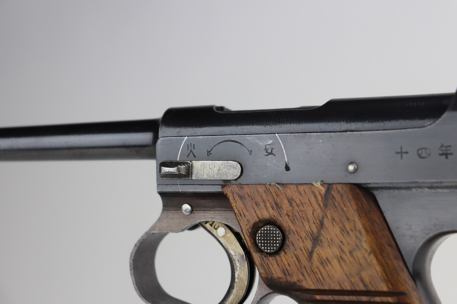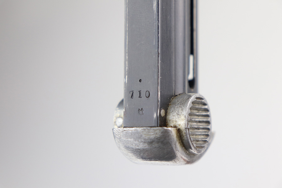 6/15/21 – This is an excellent example of a Nambu Type 14 issued to the Japanese military in July of 1942. The gun is all matching and comes with one original matching magazine. It has retained about 97% of its original finish. There is just a hint of wear on the high edges and very minor thinning on the straps. There is a small number scratched into the front strap. Comes with excellent un-numbered grips. The bore is shiny with strong rifling with minor freckling here and there.