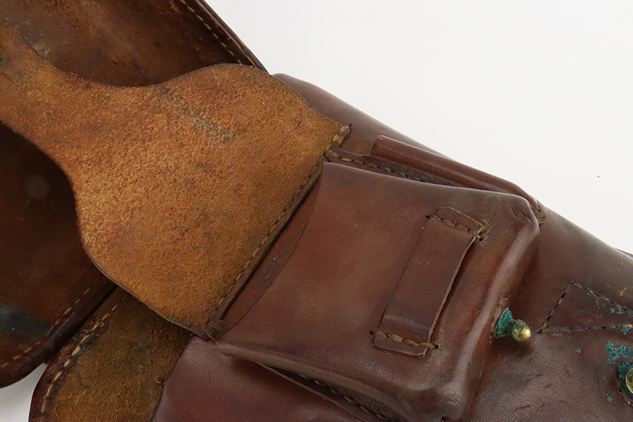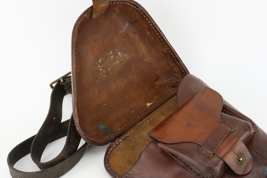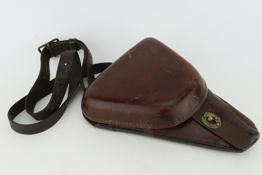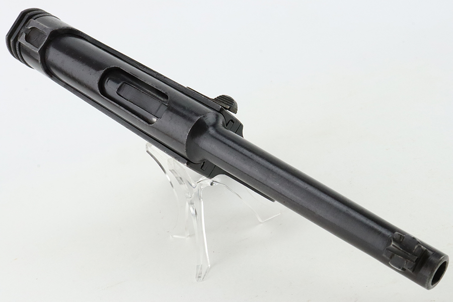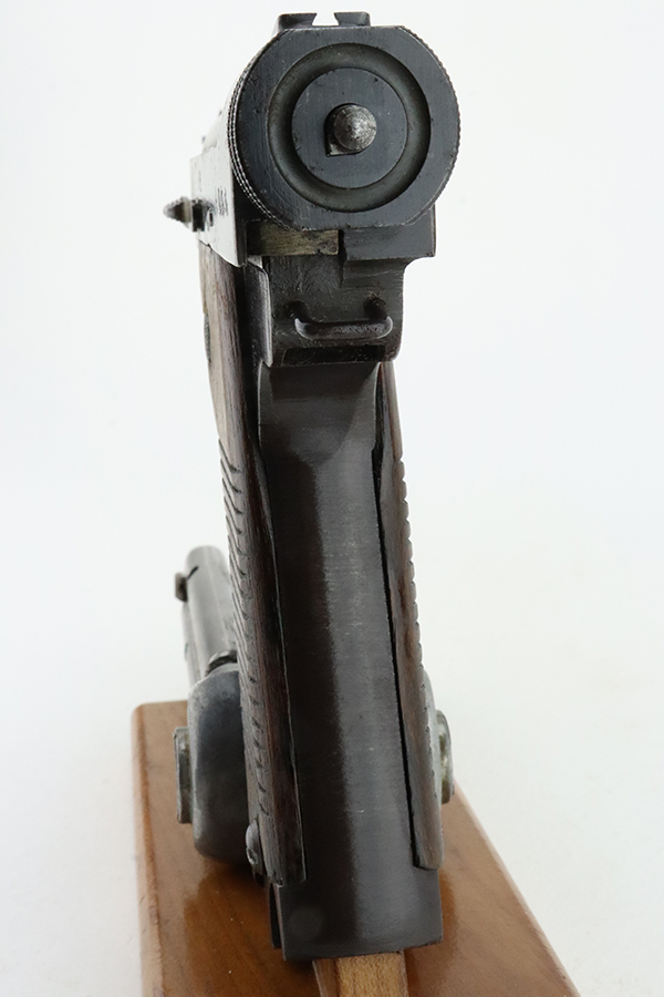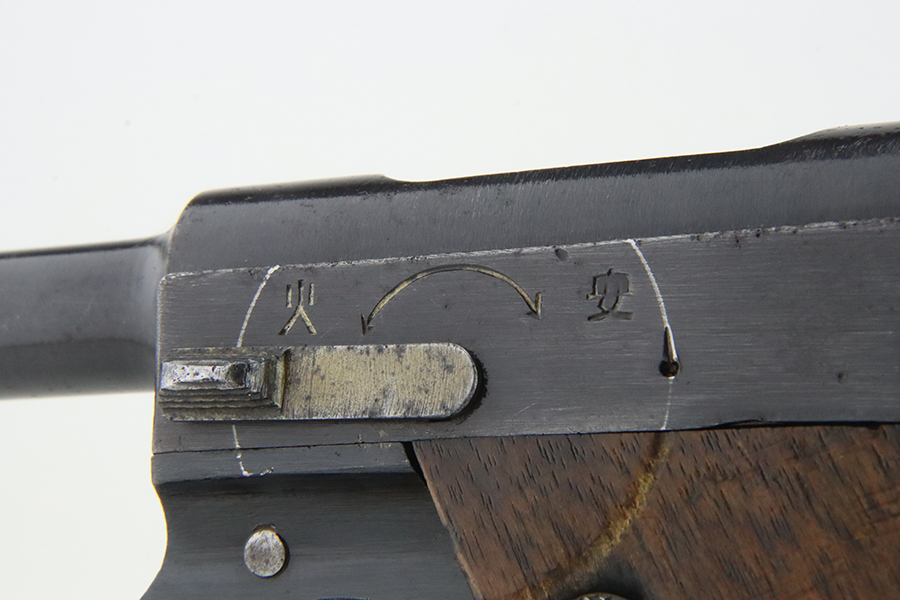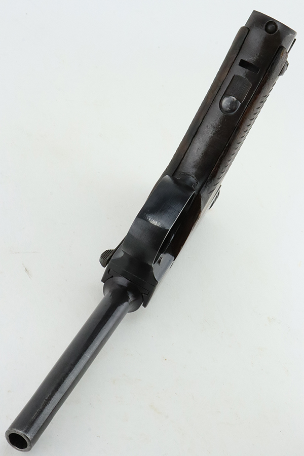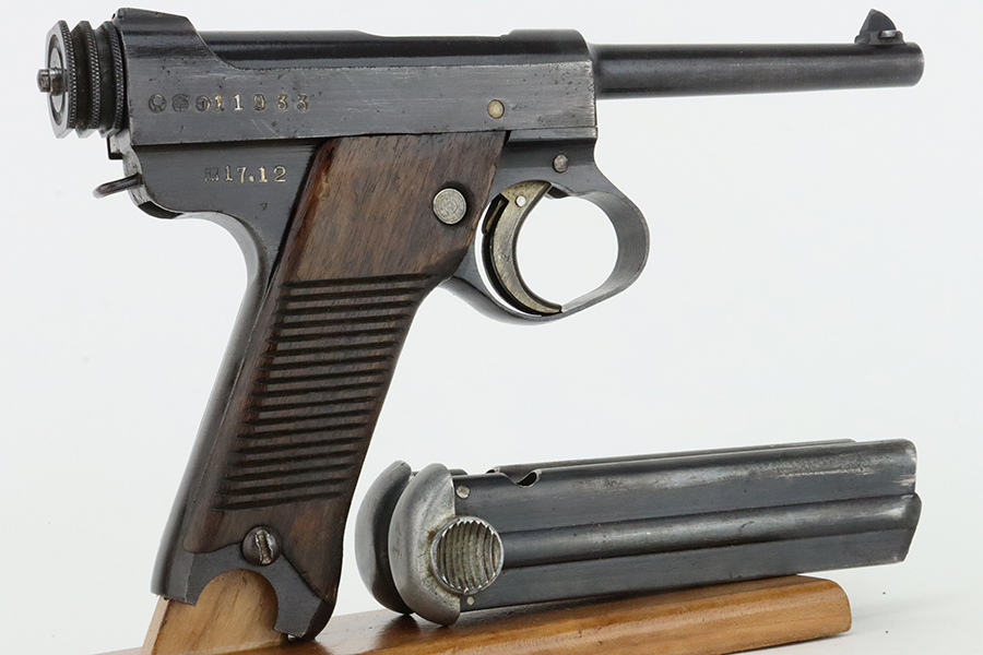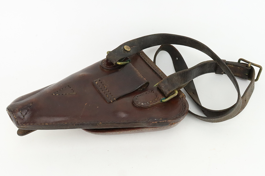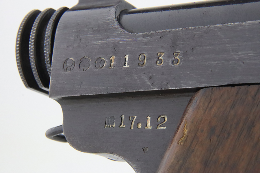 1/29/24 – This is an excellent example of a Nambu Type 14 issued to the Japanese military in December of 1942. It is all matching and comes as a rig with an excellent period-correct leather shoulder holster (with original leather shoulder strap), two original matching-numbered magazines, a blued cleaning rod, and a spare firing pin. The original finish rates about 96-97% with minor high edge wear and some areas of pin-pricking on both sides of the slide and on the top of the barrel. Fitted with very nice period-correct wood grips – they are hand-numbered, but the numbers are illegible. Mint bore.