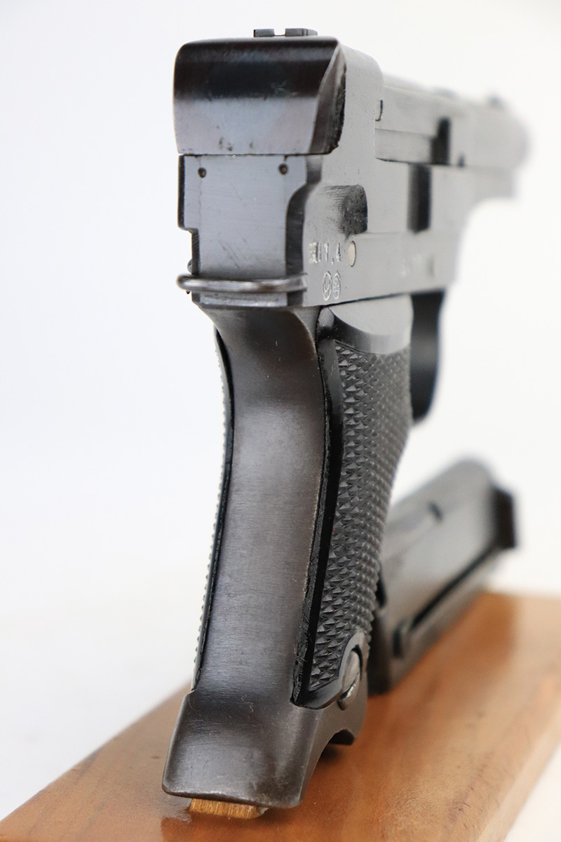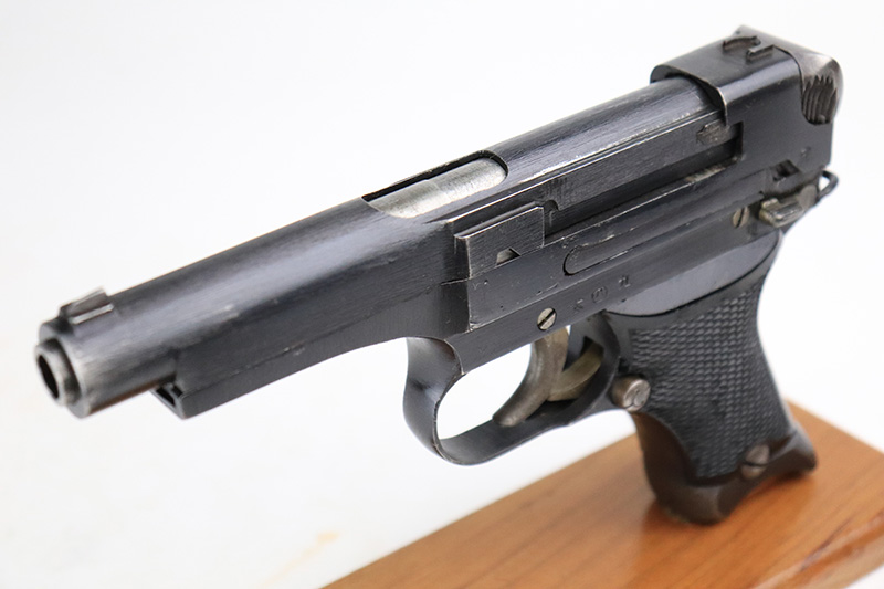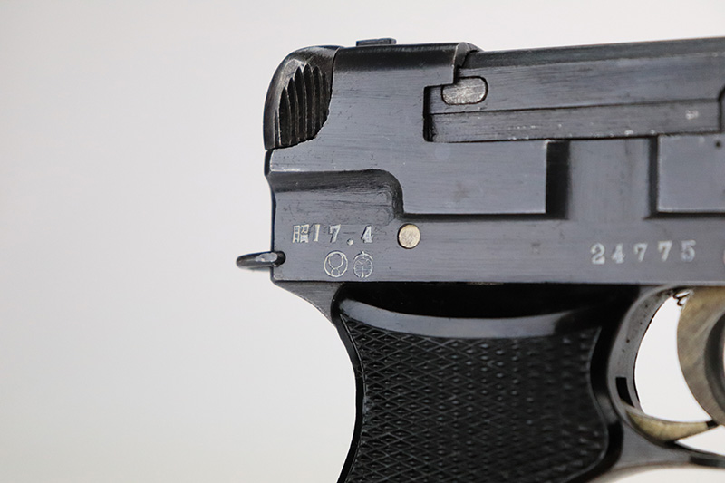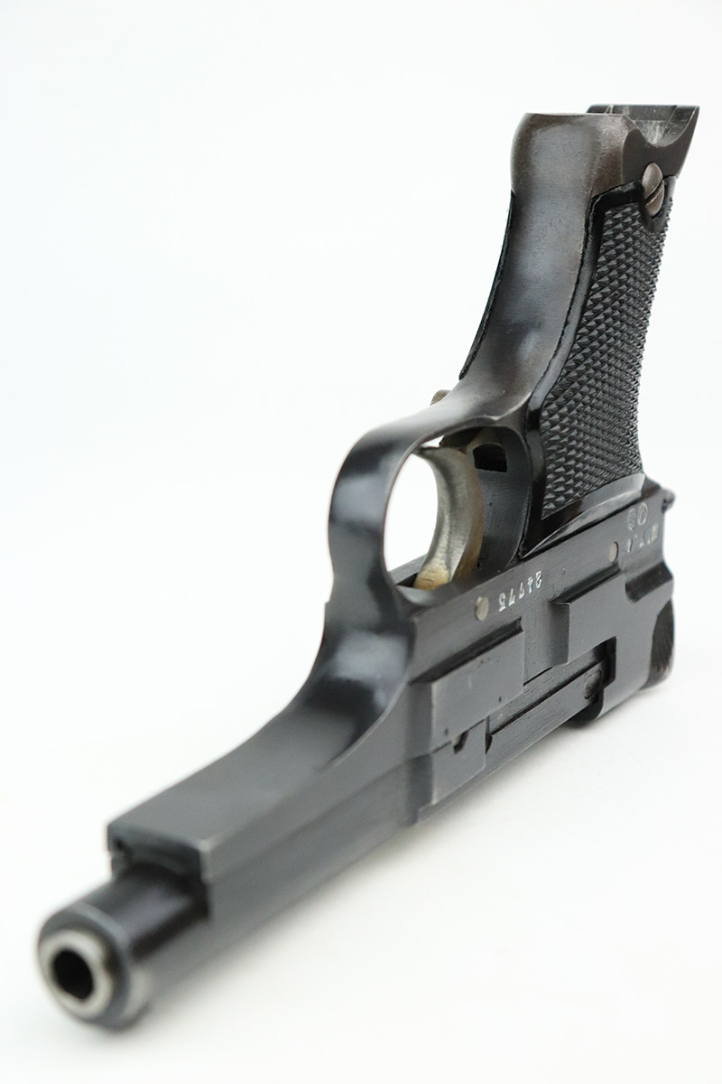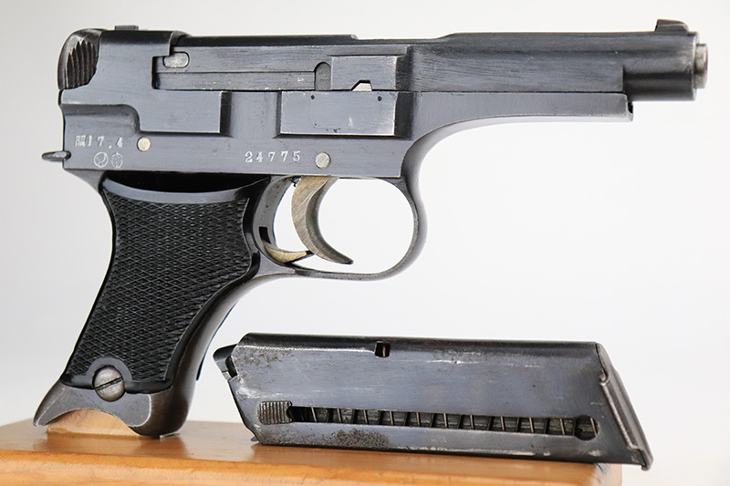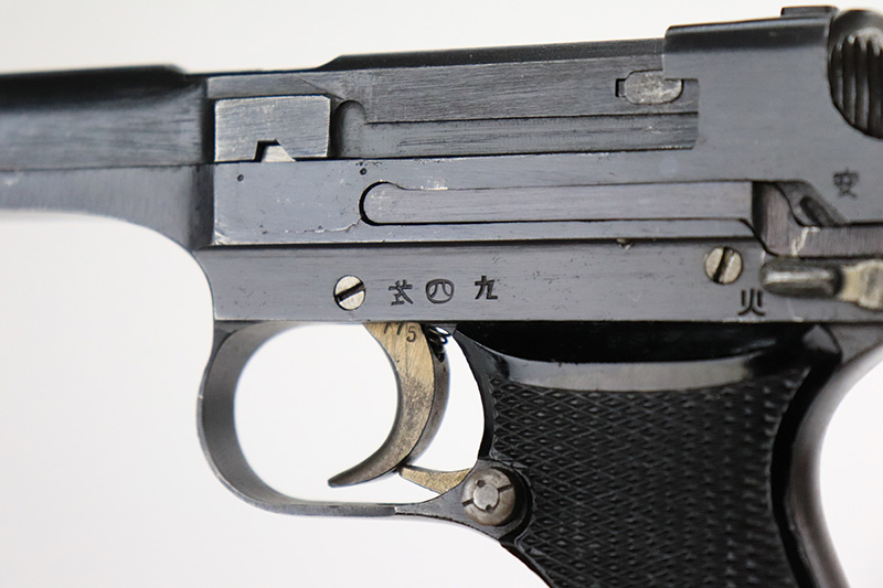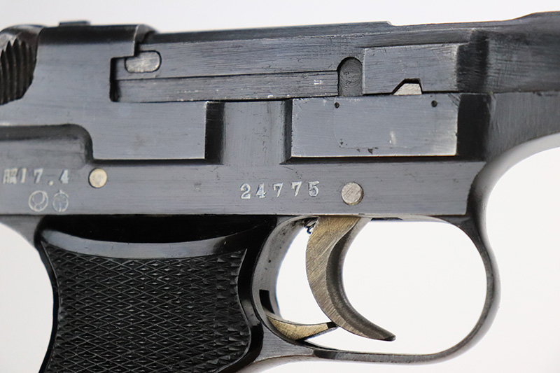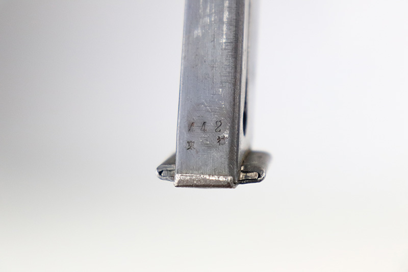 8/23/22 – This is a minty example of a Nambu Type 94 issued to the Japanese military in April of 1942. The gun is all matching and has retained about 98% of its original bluing. Very minor muzzle wear and a few tiny scratches on both sides of the frame. While there is very little actual finish loss, there is some minor dulling and light brown patina on both grip straps. Comes with excellent black bakelite grips and one period-correct but mismatched magazine. The bore is shiny with strong rifling with some very light freckling here and there.
