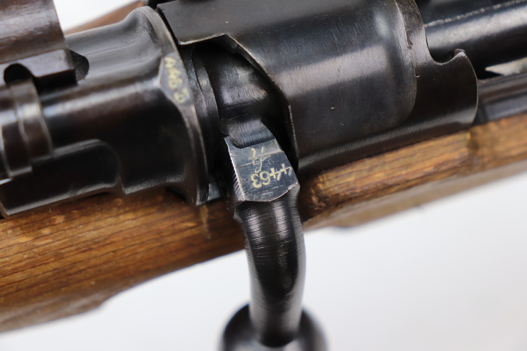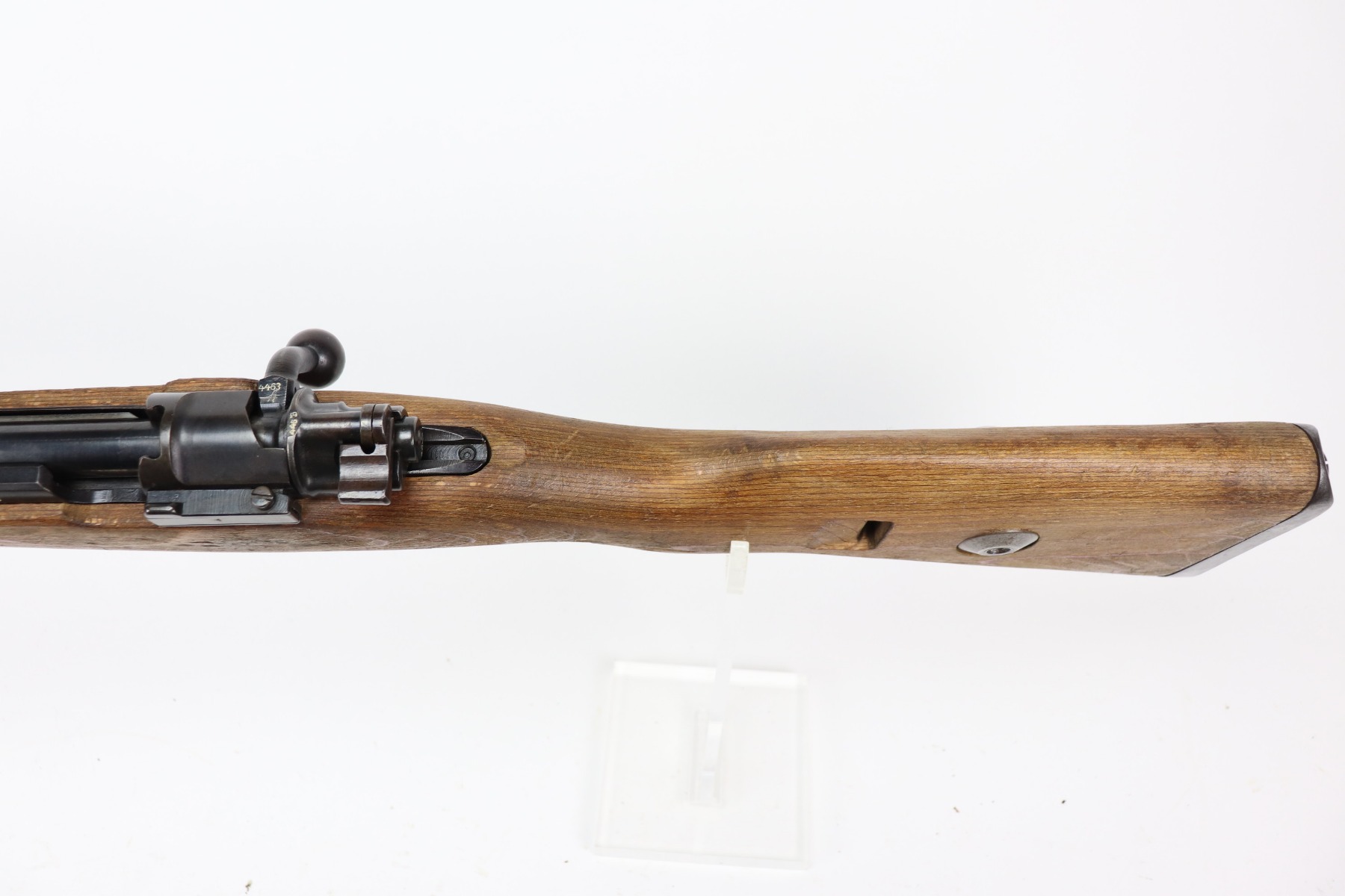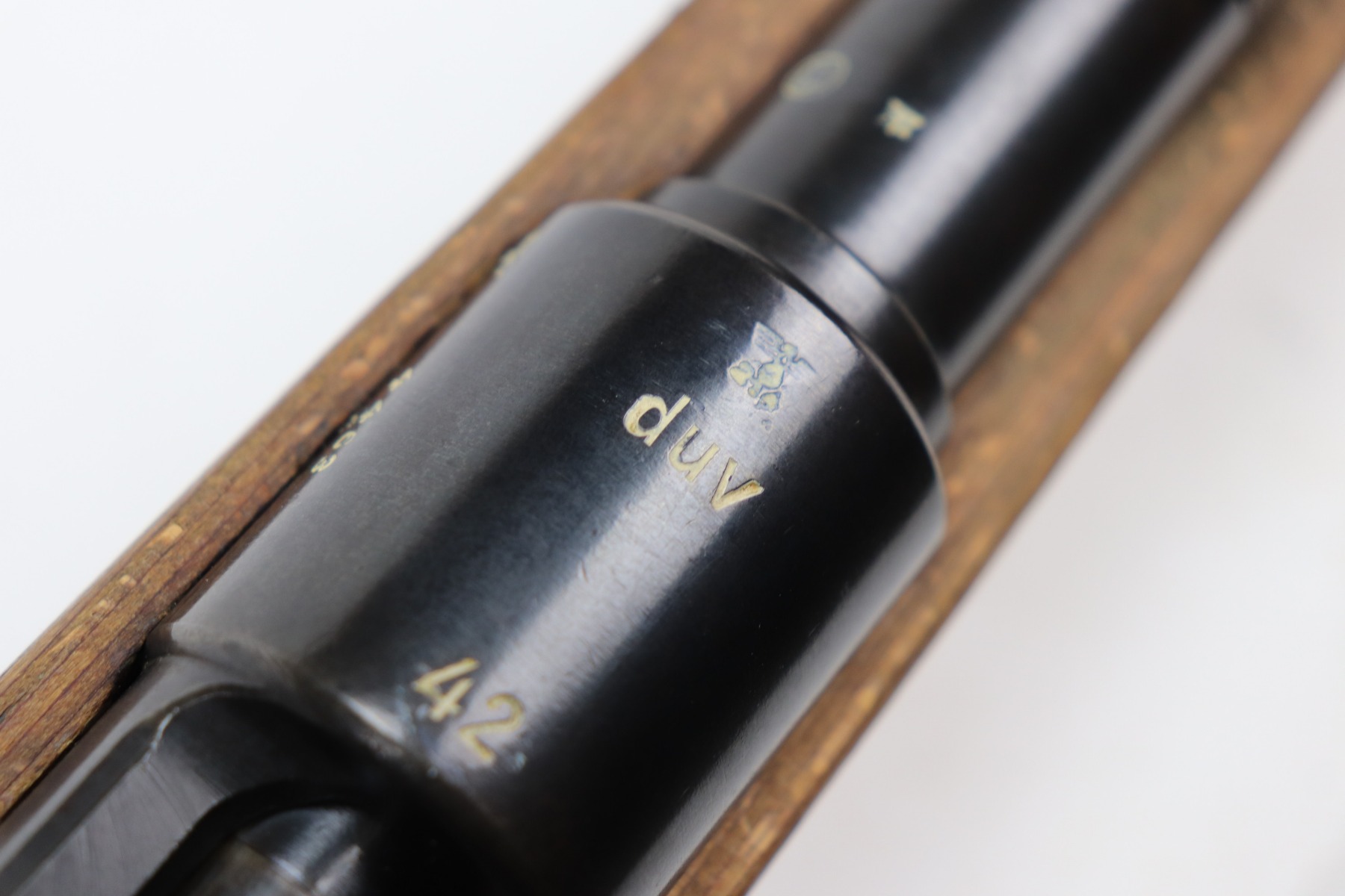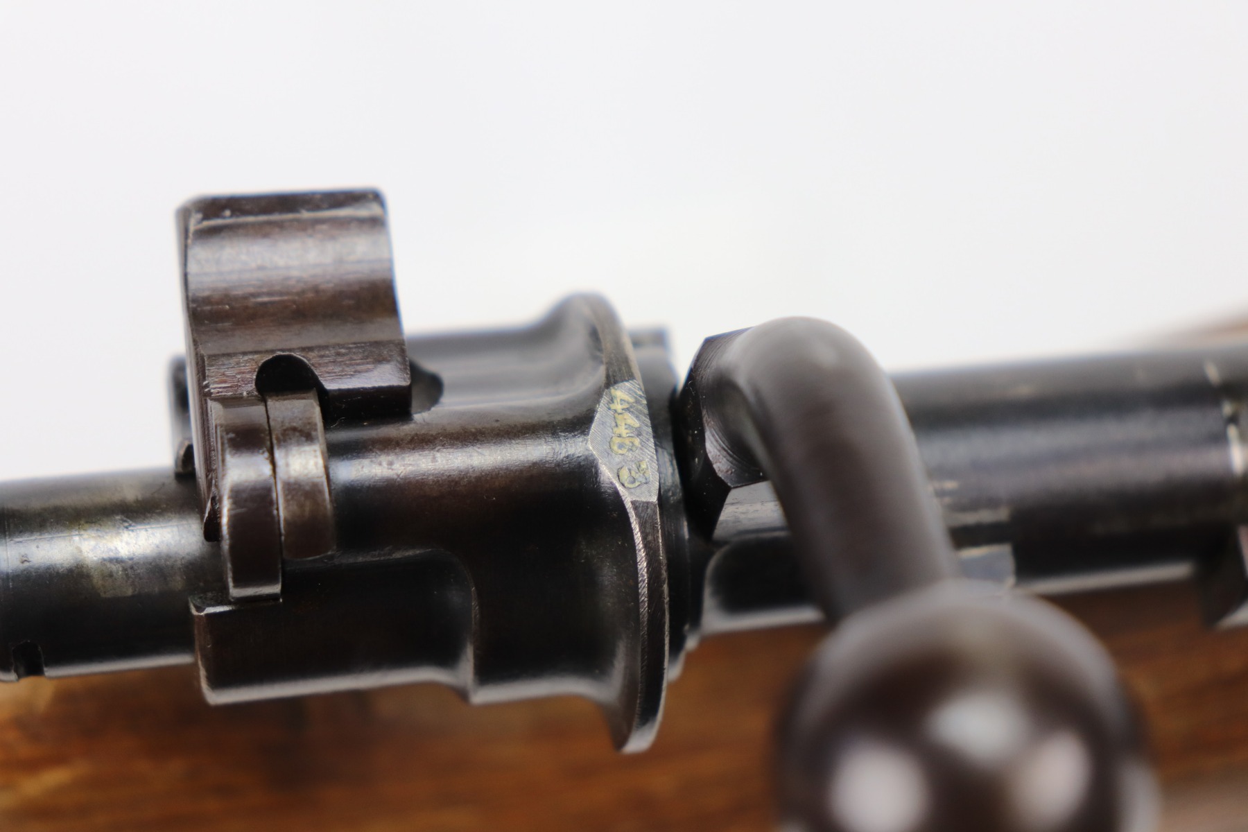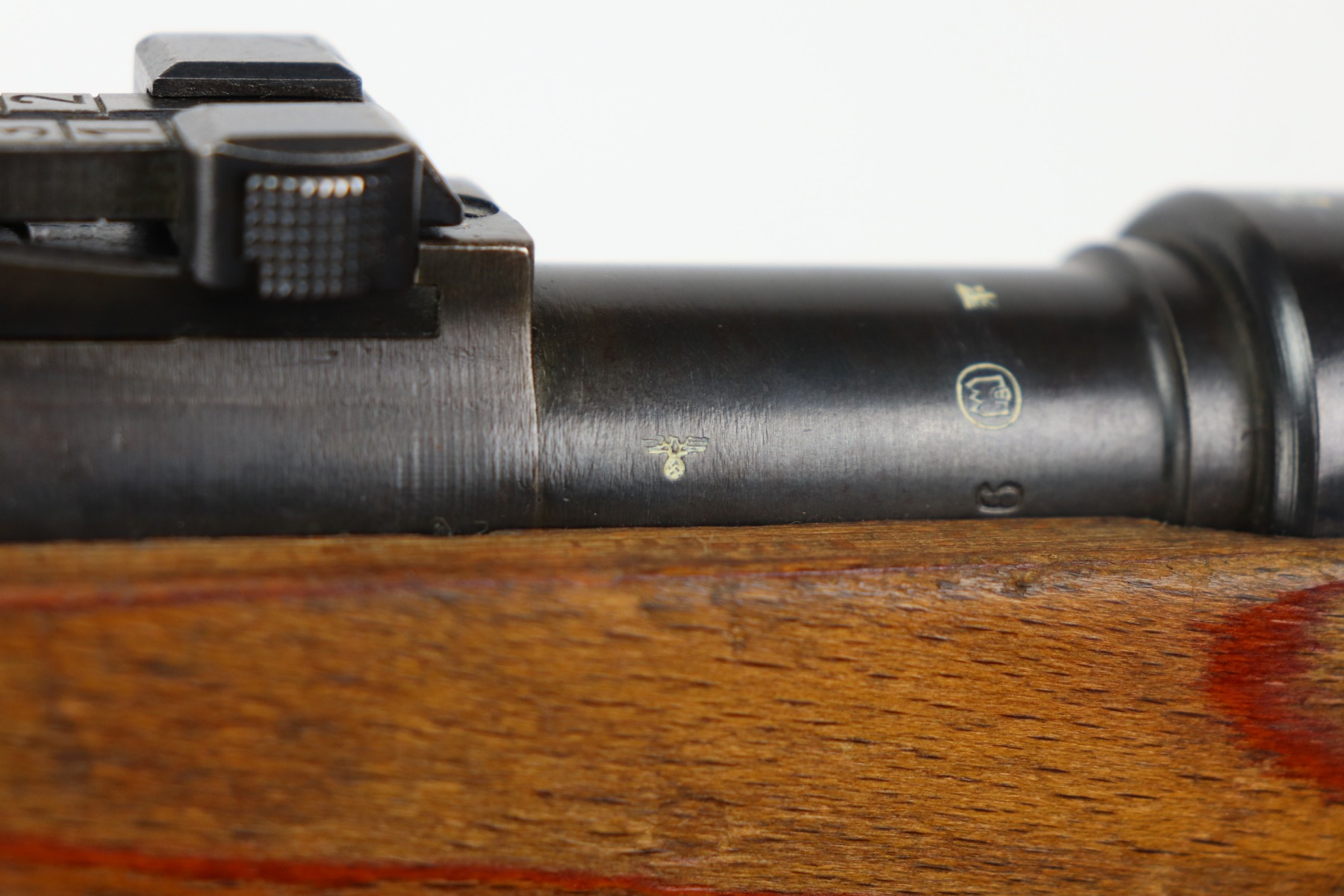 3/9/21 – This is an excellent example of a Berlin-Lubecker K98 issued to the Nazi military in 1942. All numbered parts are numbered, and there are waffen proofs throughout. The stock is also matching, but there are no visible waffen proofs. May have been lightly sanded. The safety lever is un-numbered so may have been replaced. The gun is in excellent condition. It has retained the majority of its finish. There are areas of minor wear around some of the high edges. The stock is very nice with minor dings and bruises here and there. The bore is excellent – shiny with strong rifling.