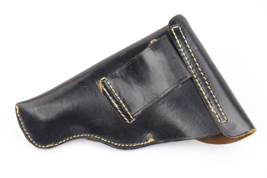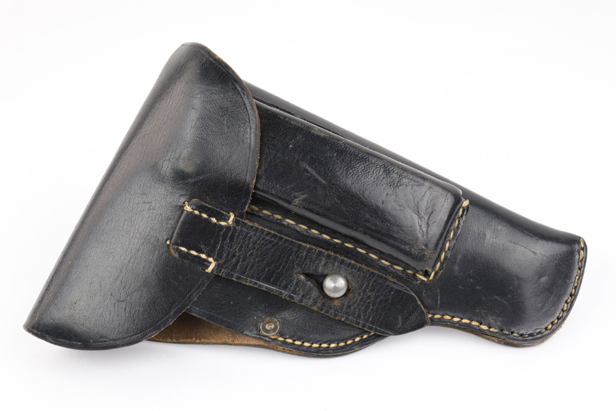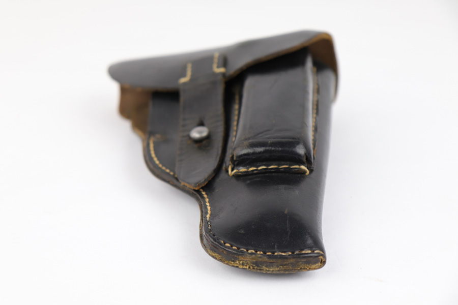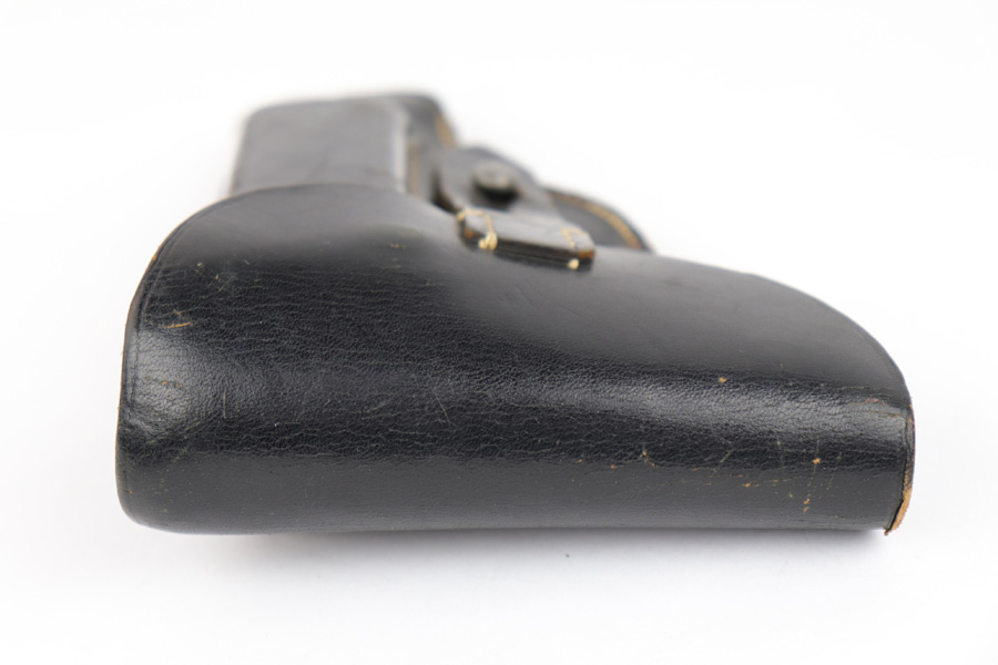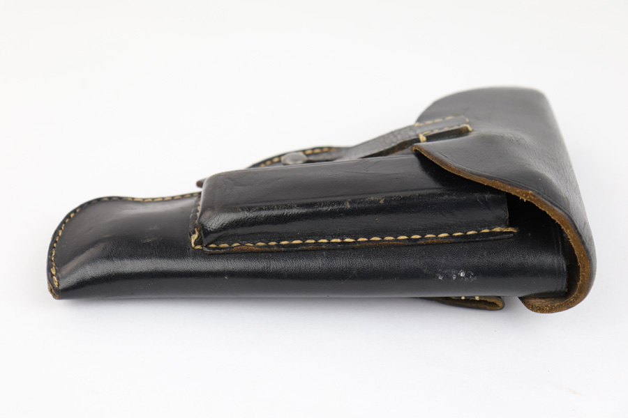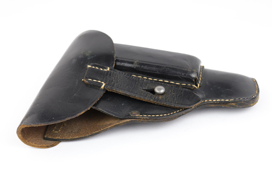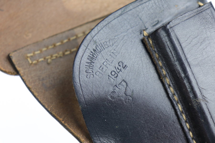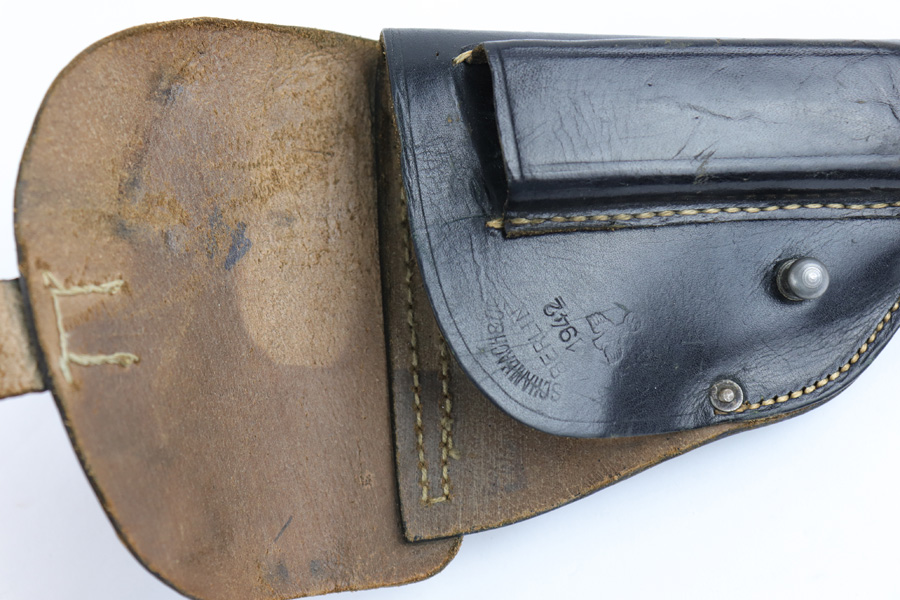 5/2/19 – This is an original 1942 dated police pistol holster from WW2. The holster is maker stamped and police eagle stamped on the front leather under the closure strap. Excellent, clean black leather and straw stitching all in tact. The holster is appropriate for a PPK, Sauer 38h, or Mauser HSc.
