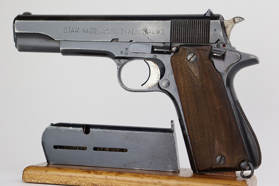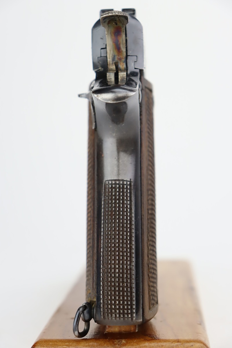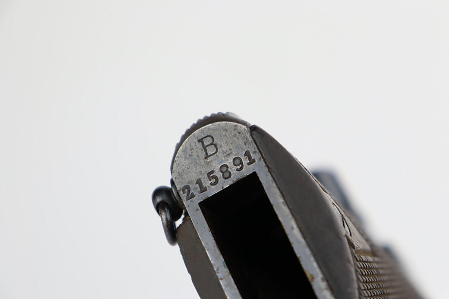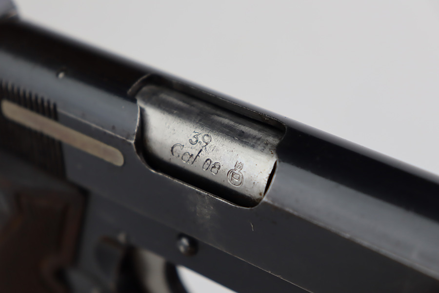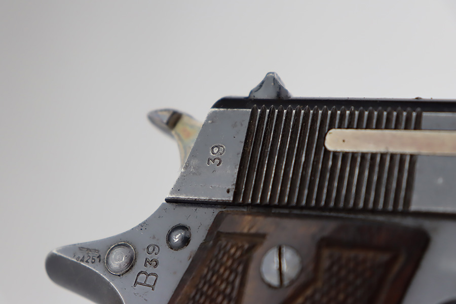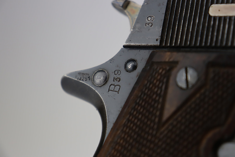 9/18/23 – This is a nice example of a Spanish Star Model B issued to the Nazi military in 1942. It is all matching and has the proper “Waffen 251” military acceptance proof on the right side of the tang. It comes as a rig with a nice unmarked leather holster and one period-correct magazine. The gun itself has retained roughly 85% of its original finish. There is general high edge wear, spotty wear on the front strap, and an area of wear and oxidation on the left side of the slide. Fitted with excellent period-correct wood grips. Excellent bore with great rifling.
