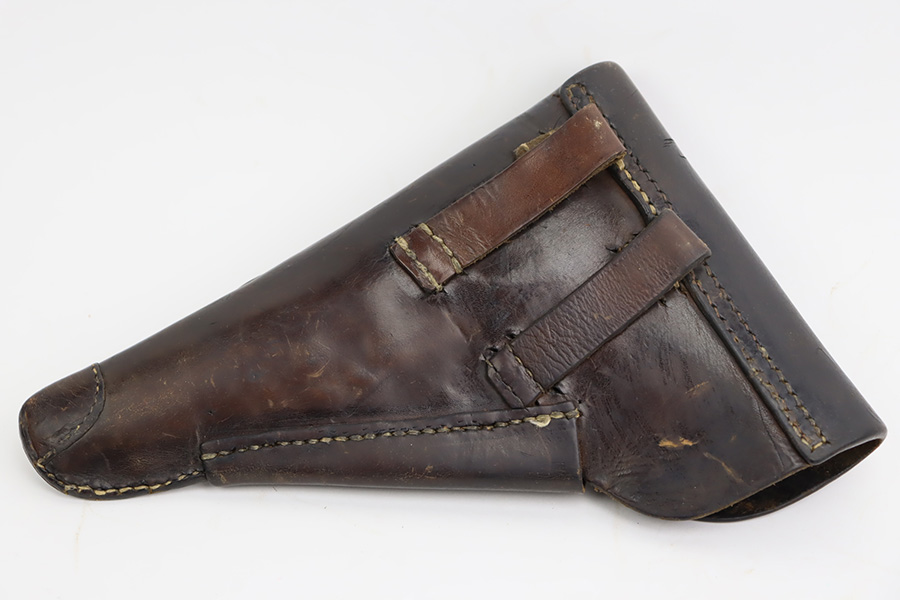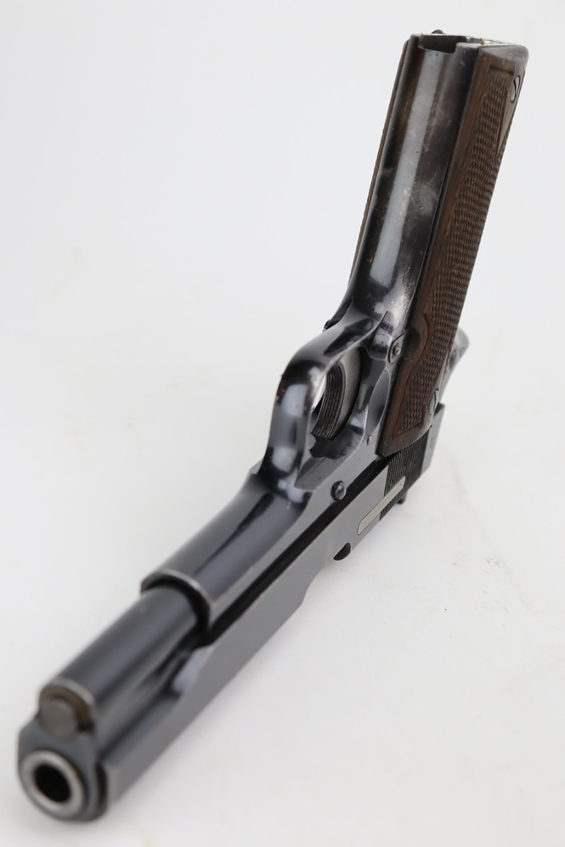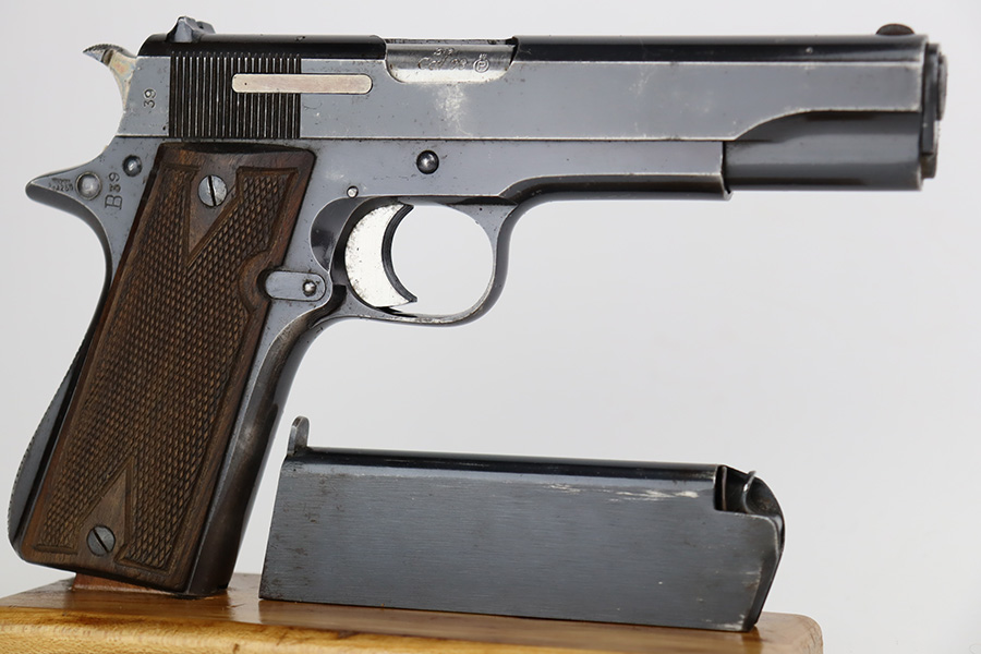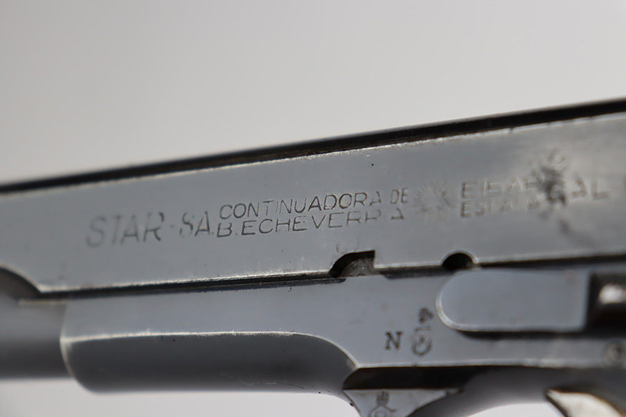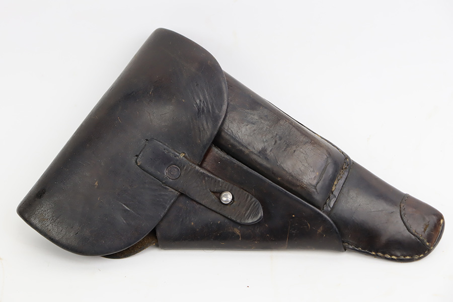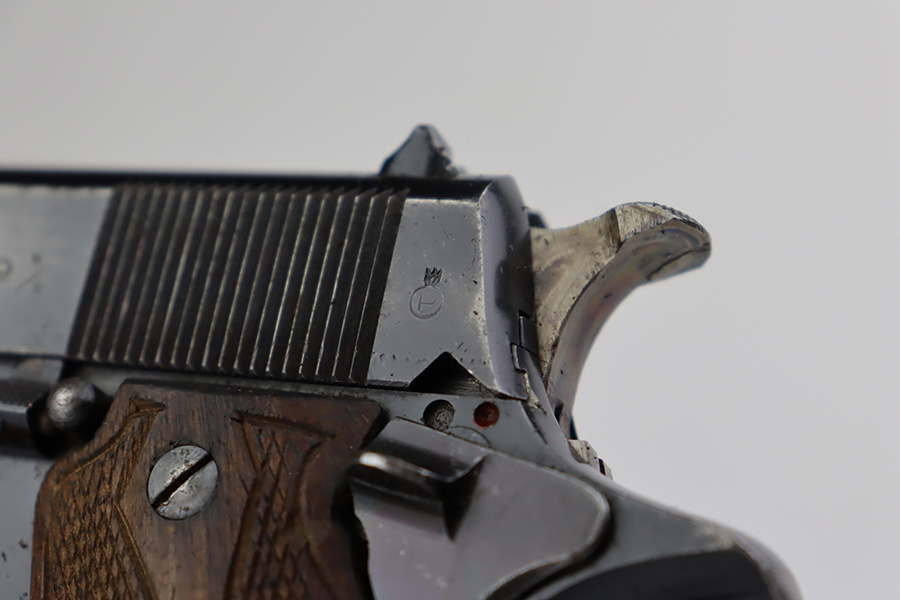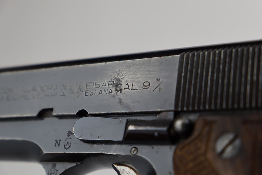 9/18/23 – This is a nice example of a Spanish Star Model B issued to the Nazi military in 1942. It is all matching and has the proper “Waffen 251” military acceptance proof on the right side of the tang. It comes as a rig with a nice unmarked leather holster and one period-correct magazine. The gun itself has retained roughly 85% of its original finish. There is general high edge wear, spotty wear on the front strap, and an area of wear and oxidation on the left side of the slide. Fitted with excellent period-correct wood grips. Excellent bore with great rifling.