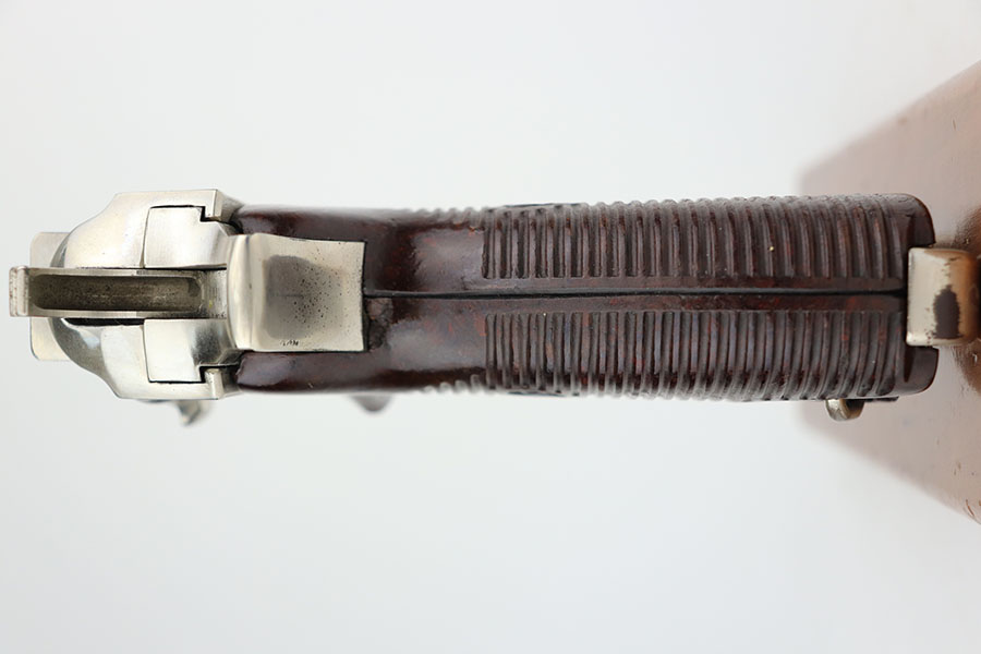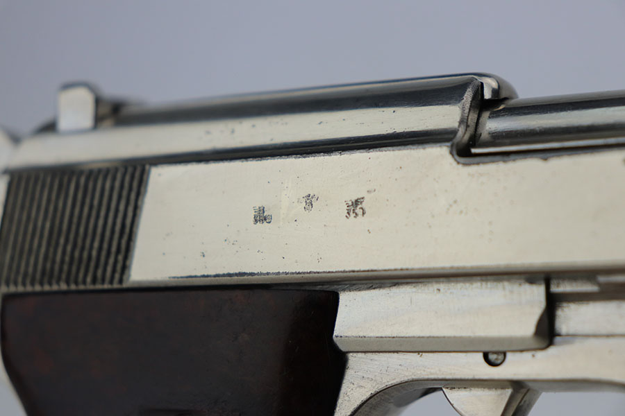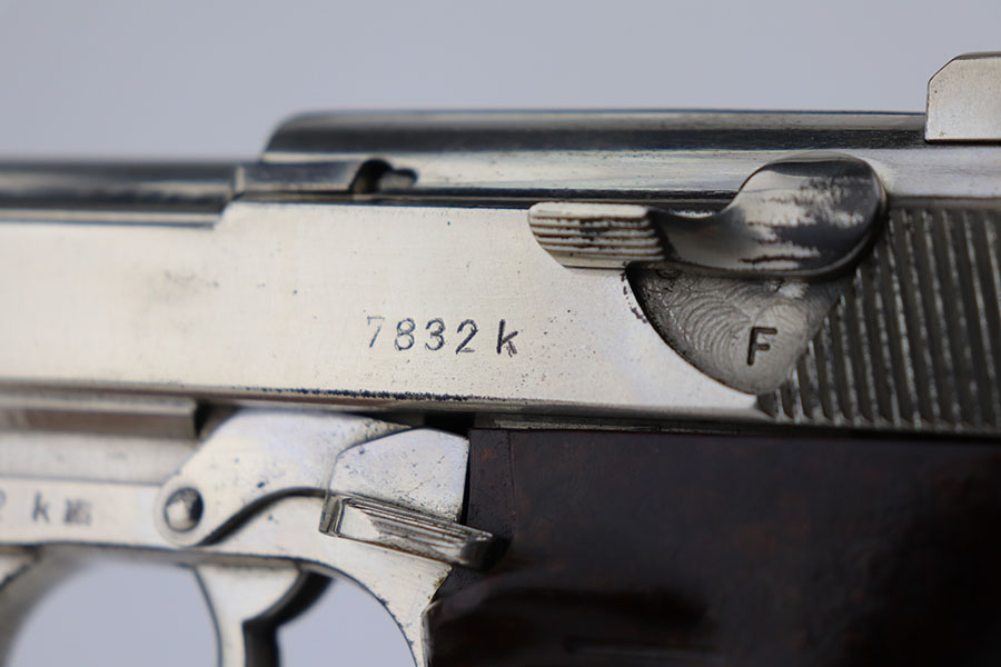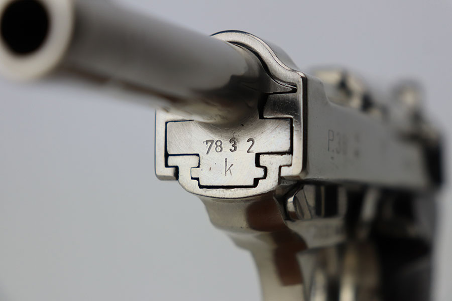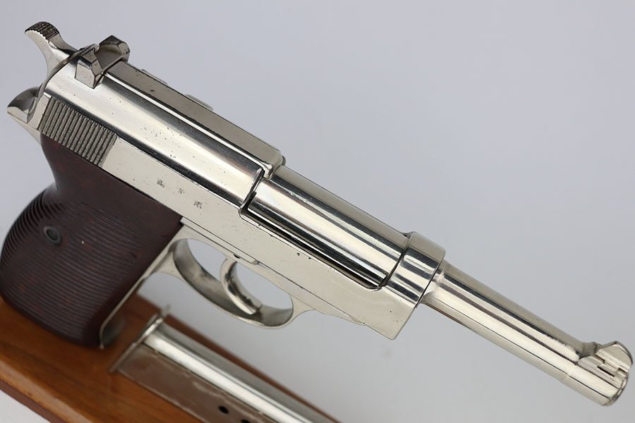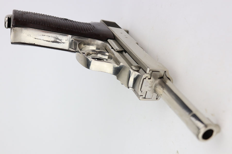 9/3/24 – This is Walther P38 issued to the Nazi military in 1942. It is all matching and has the proper “Eagle 359” military proofs. The gun has been completely nickel-plated, likely done by the GI who captured it and brought it home. This was common. The gun has retained about 94% of this nickel-plating. There is wear on the front strap and around some of the high edges. It comes with excellent grips and a nickel-plated Walther magazine. The bore has strong rifling with minor frosting in the grooves. The de-cocker is functional.