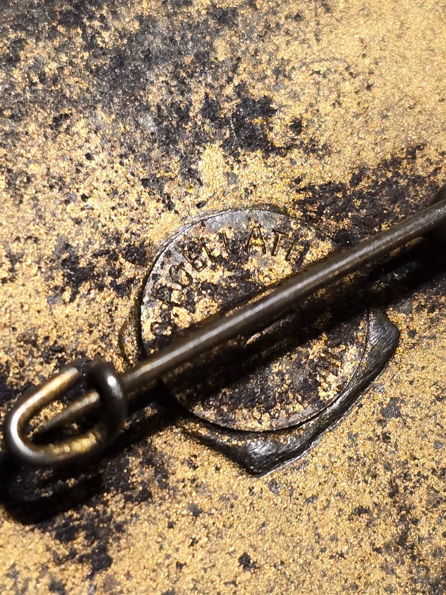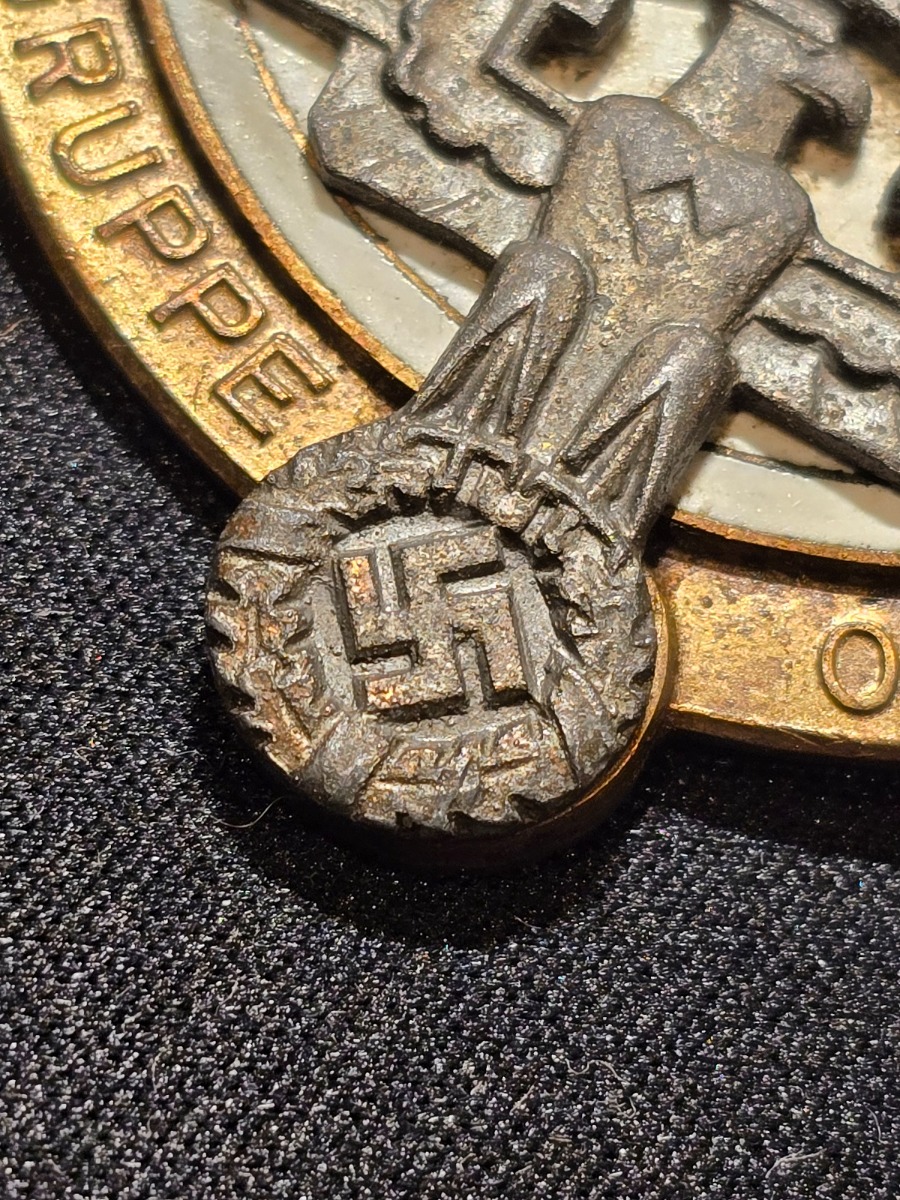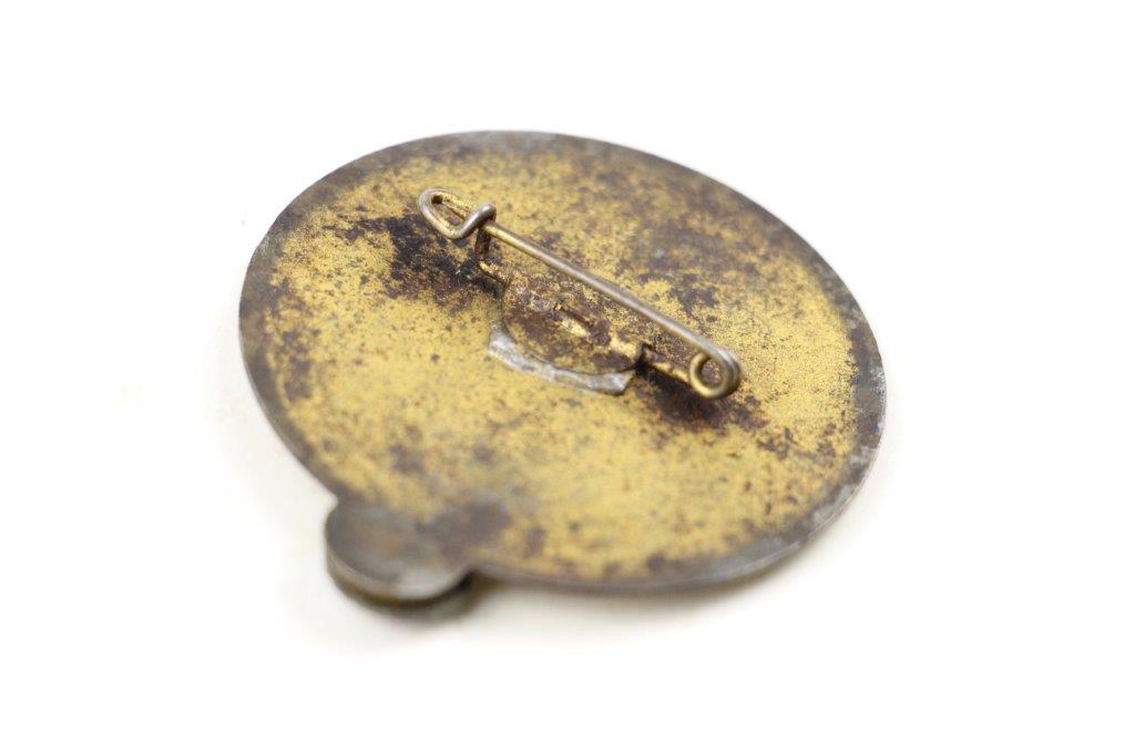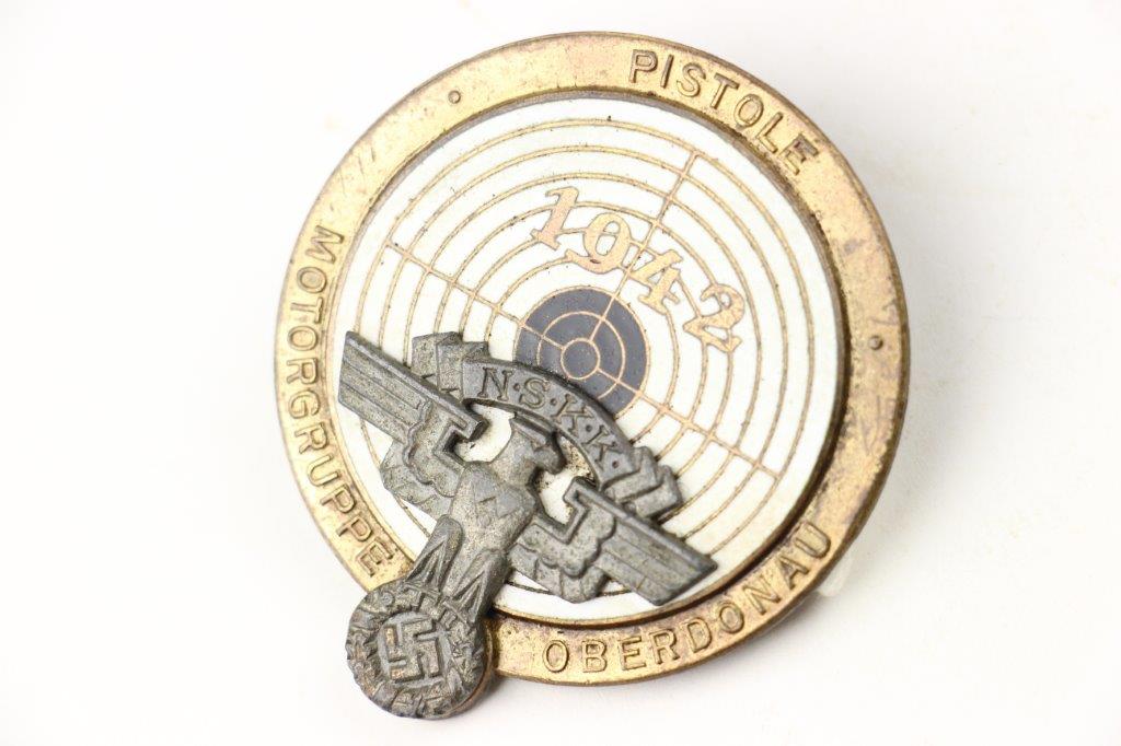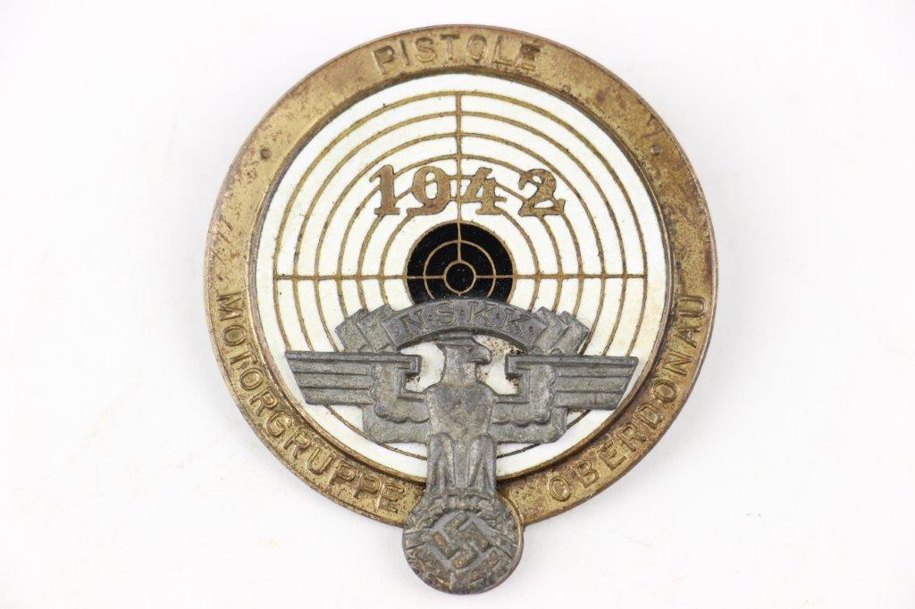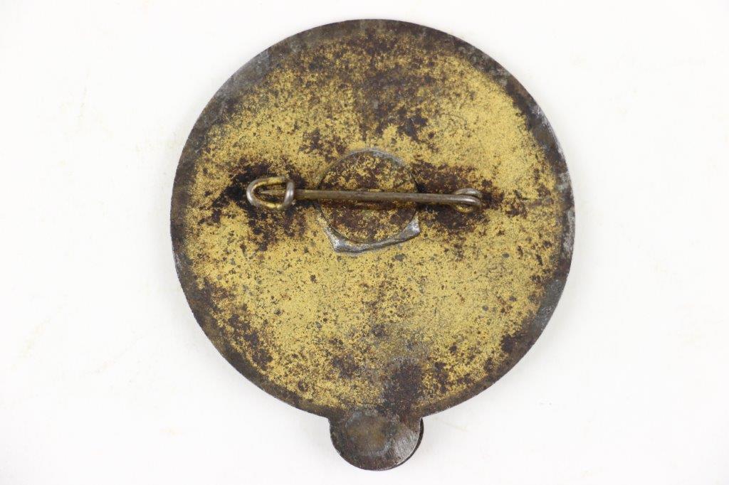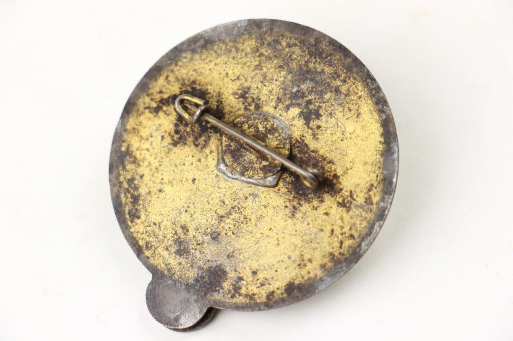 9/17/24 – This is a rare NSKK Pistol Shooting Prize Award from 1942. The badge is two piece construction with a steel base and front-affixed zinc NSKK eagle logo. The eagle has lost almost all of the gold wash finish, but traces of gold color are found on the wreath and swastika. The badge measures 4.5cm in diameter with white and black enamel paint on a central target. The outer rim has embossed writing and an aged finish with natural patina. The top of the badge indicates the event as “Pistole”, and the NSKK Gruppe, “Motorgruppe Oberdonau” is specified at the bottom of the rim. The reverse shows natural patina with a fair amount of gold colored finish remaining and a horizontal pinback soldered in place. The excessive solder suggests this was repaired at some point in history, but the condition is congruent with the rest of the pin which confirms this is all original. The base of the pin has a worn maker marking, which is hard to decipher, but the upper portion of writing appears to be, “C. Poellath”. A great addition for NSKK and SA Gruppe collectors, and pairs perfectly with NSKK PP or shooter prize pistols.