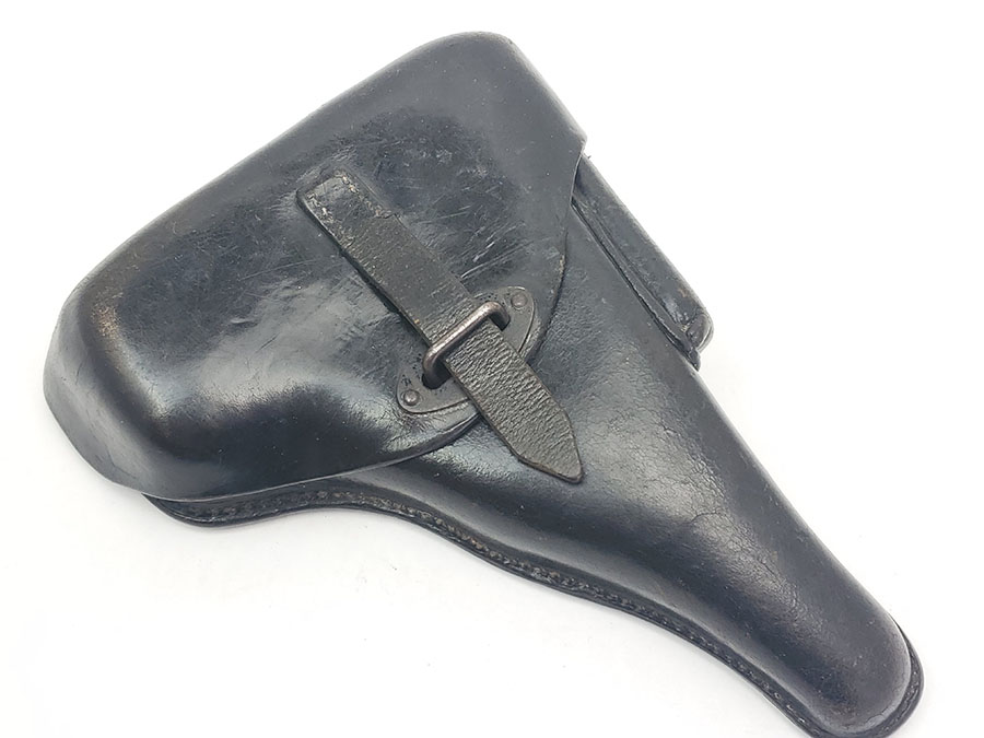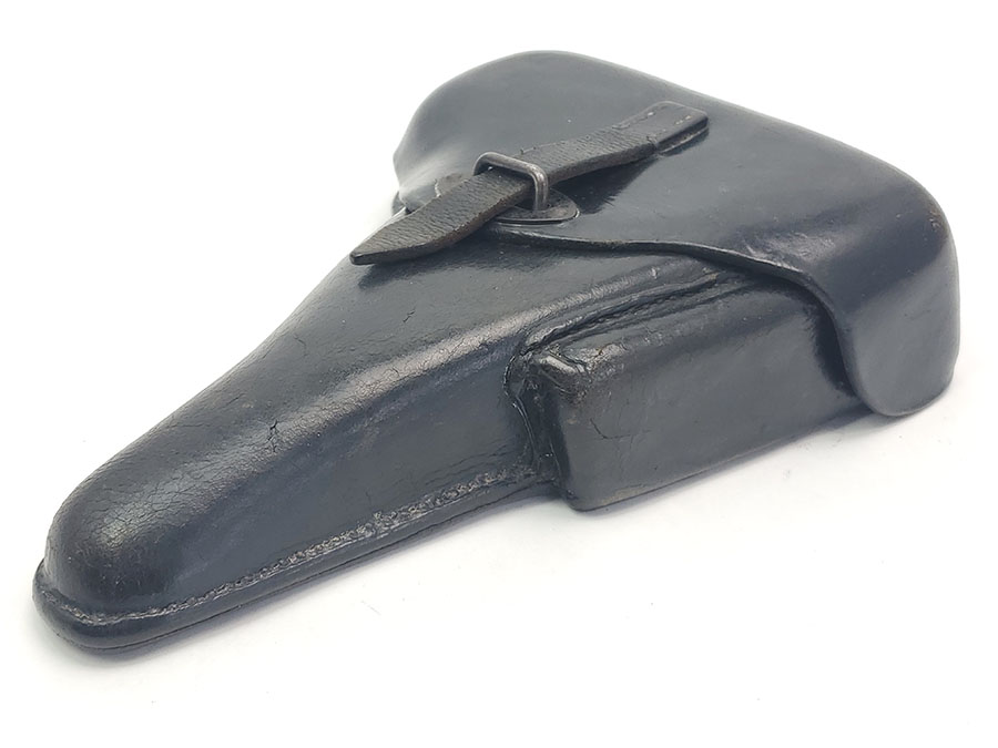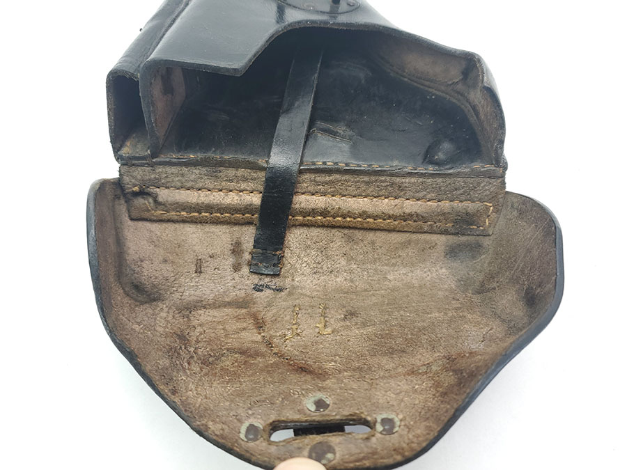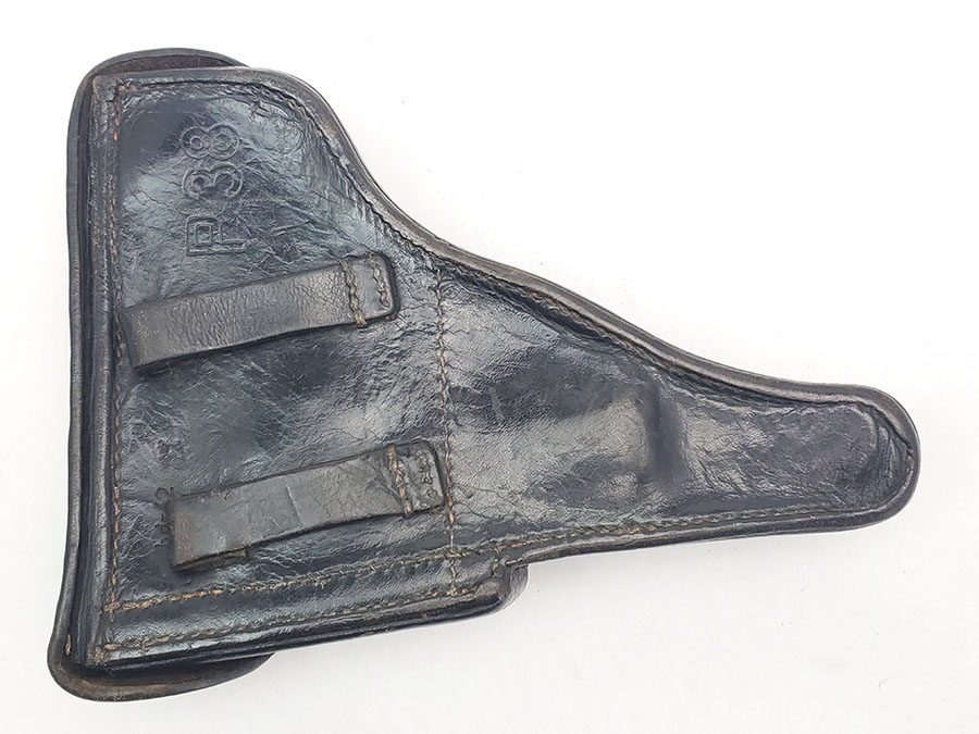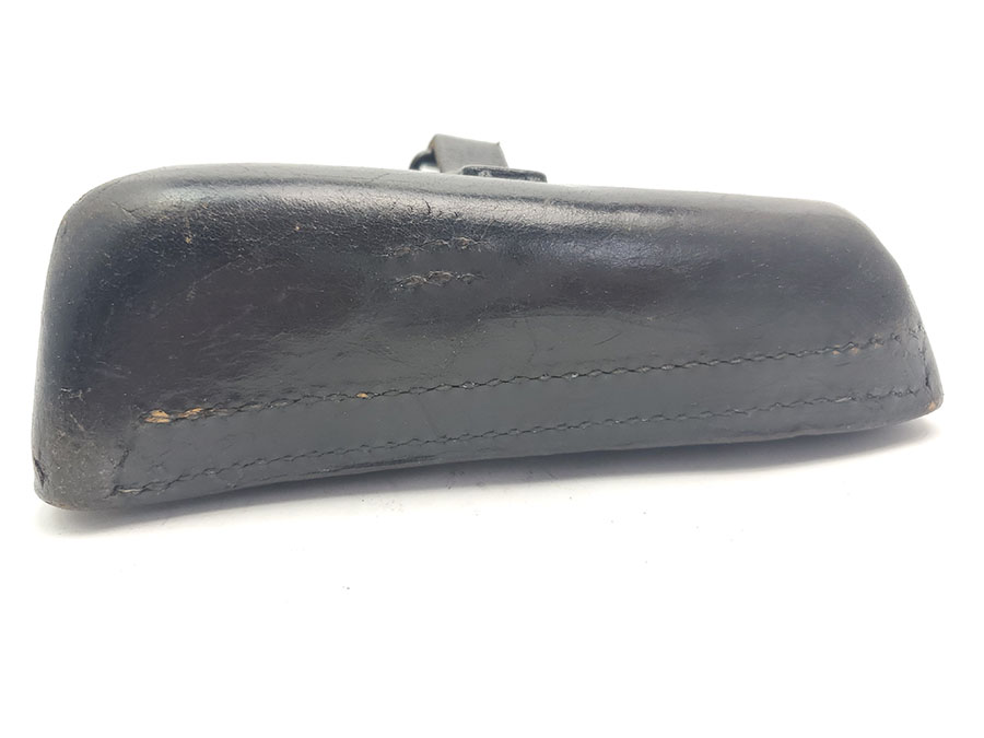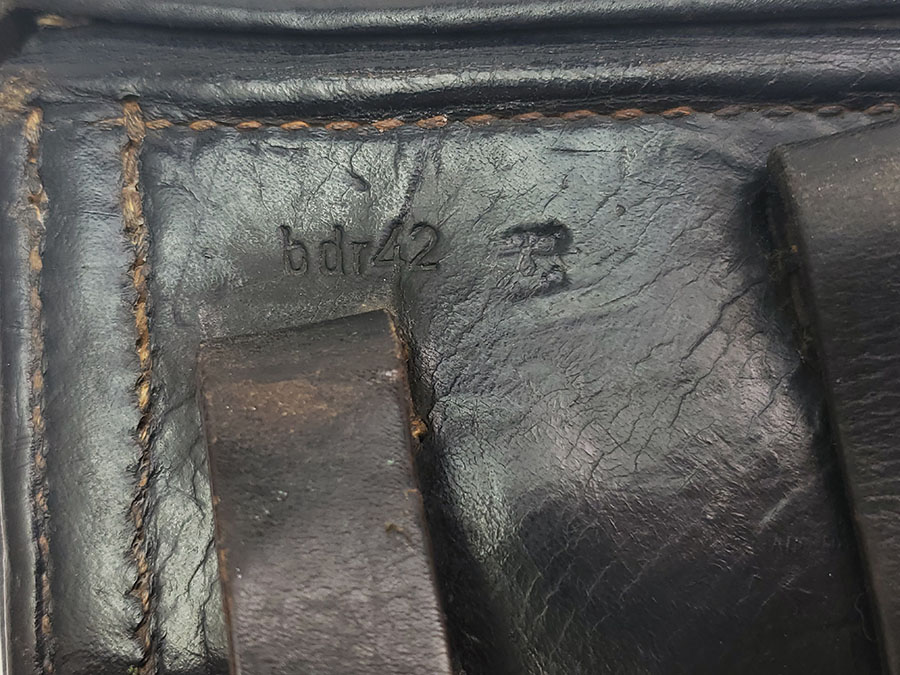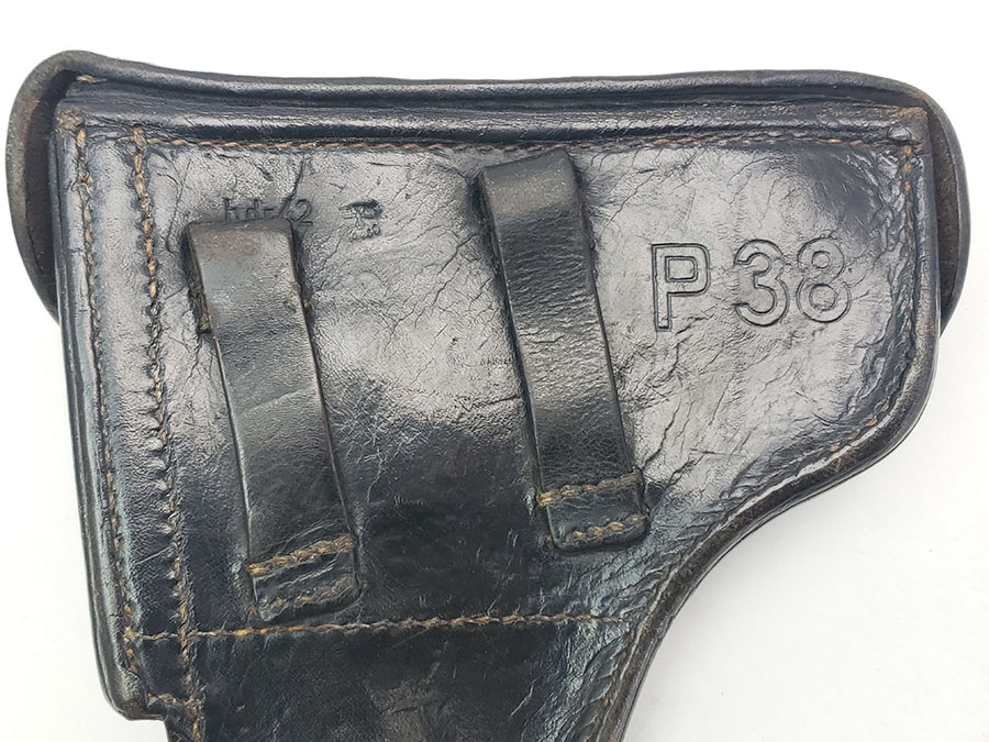 6/17/20 – This is an original 1942 dated P.38 holster. The back of the holster is well struck with a maker stamp, date, waffen proof, and P.38 stamp. The leather has light surface wrinkling on the closure strap as well as on the back leather. There’s also some surface wear near the toe of the holster, but all of the leather is in tact with normal pliability. Stitching is all original and in tact as well. Shows signs of aging and having held a P.38 for a while.