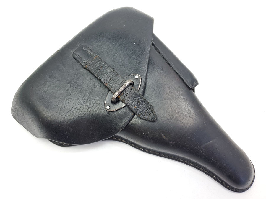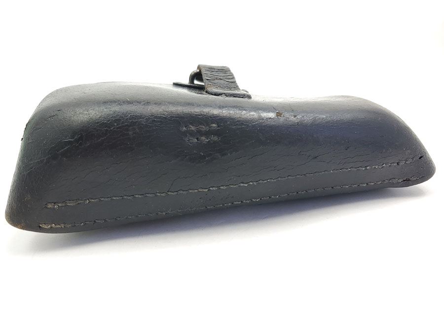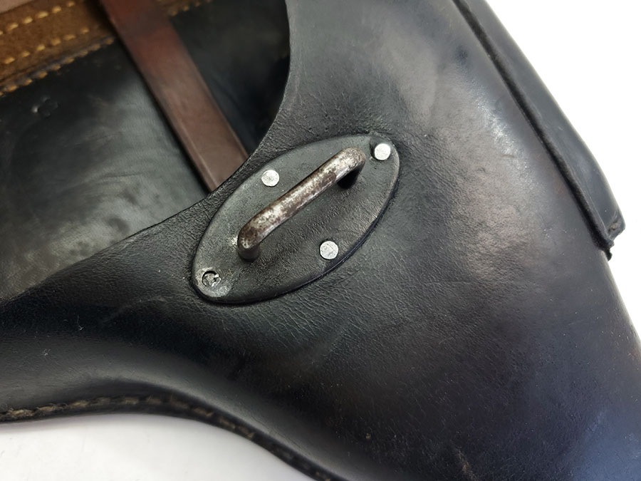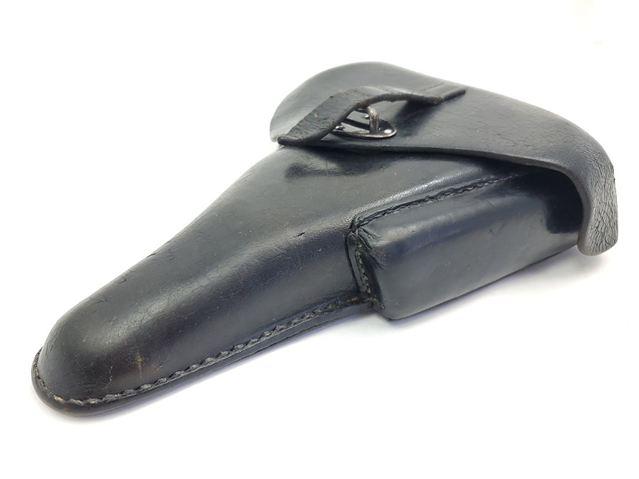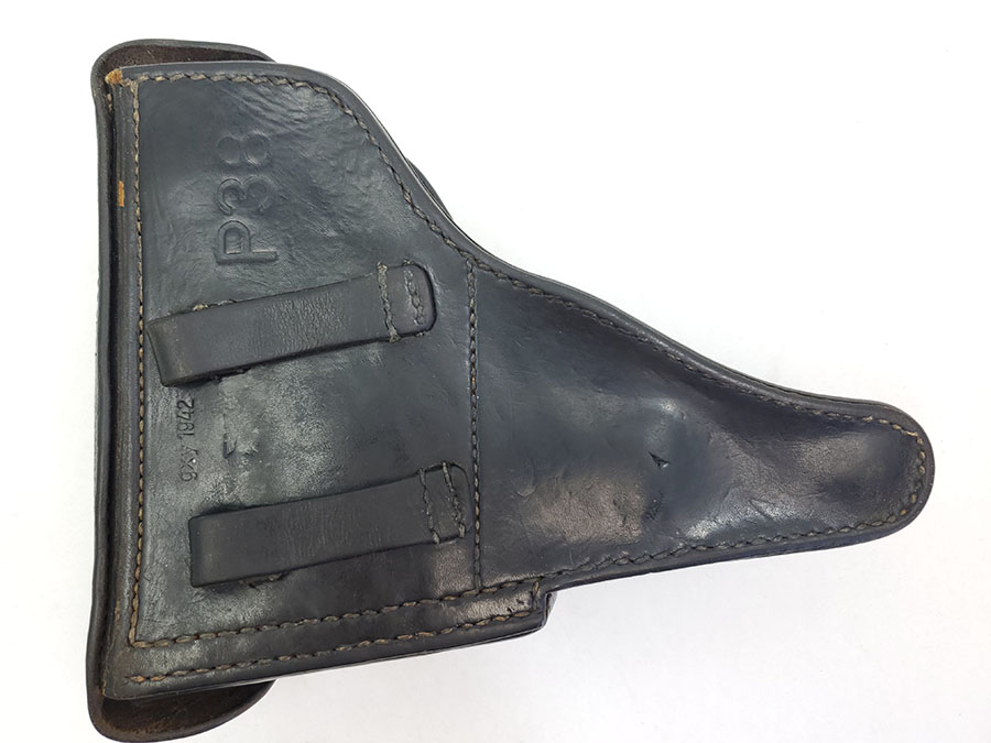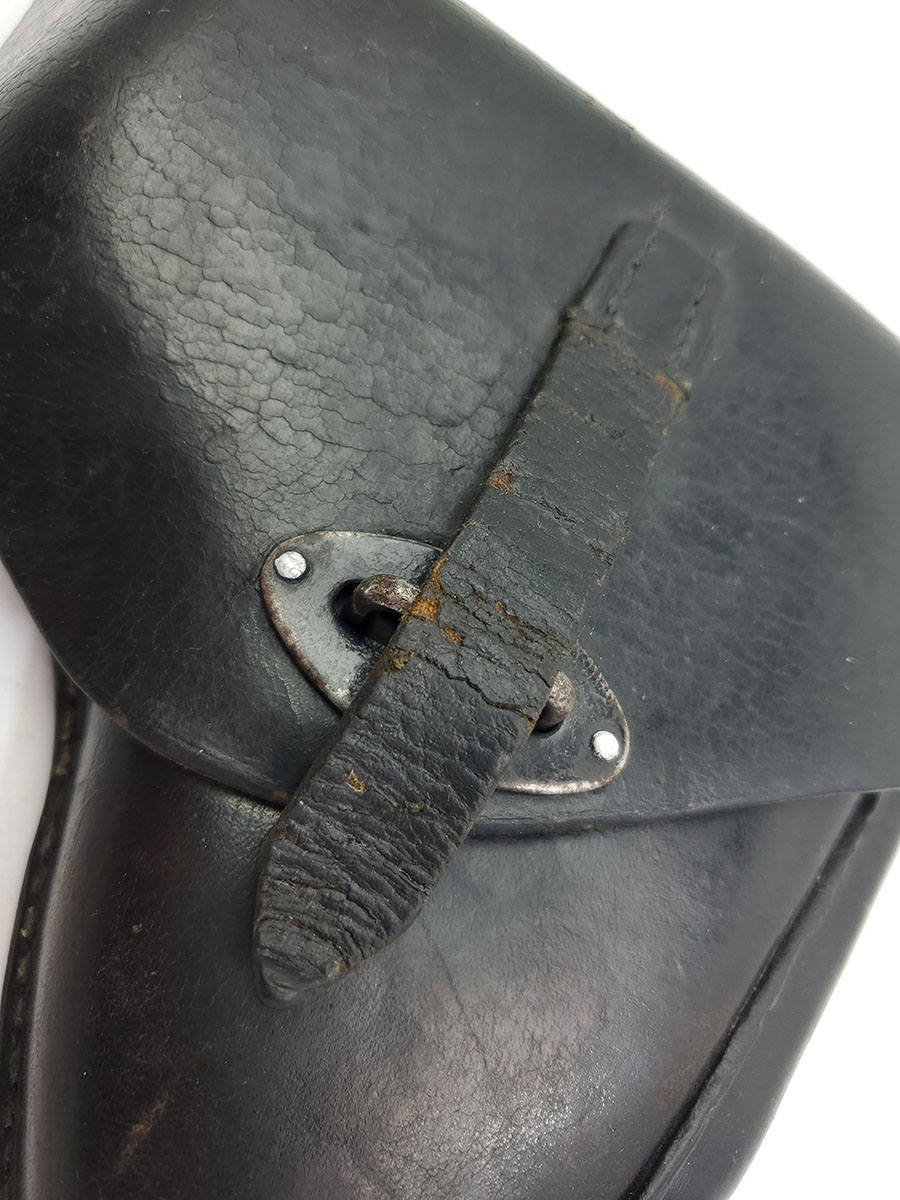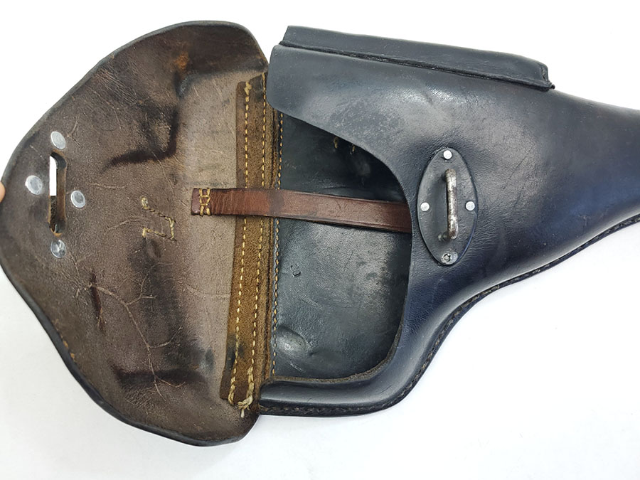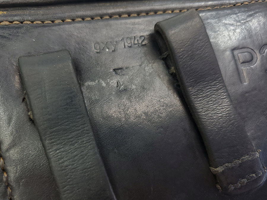 7/23/20 – This is an original 1942 dated P.38 holster. The holster has normal pliability and some cracking on the surface of the lid and closure strap, as shown in photos. The metal closure ring has very minor “play”. Stitching is all tight and original. Maker stamped, dated, and waffen proofed on the back leather.