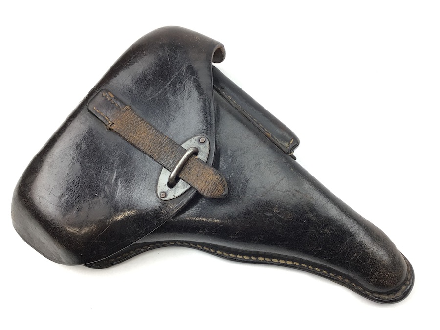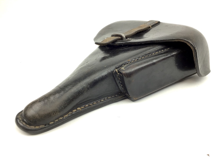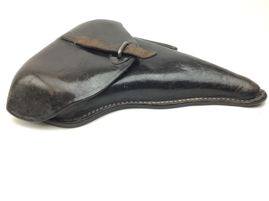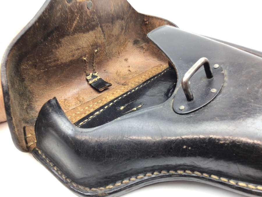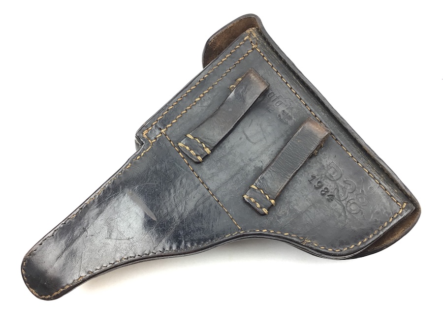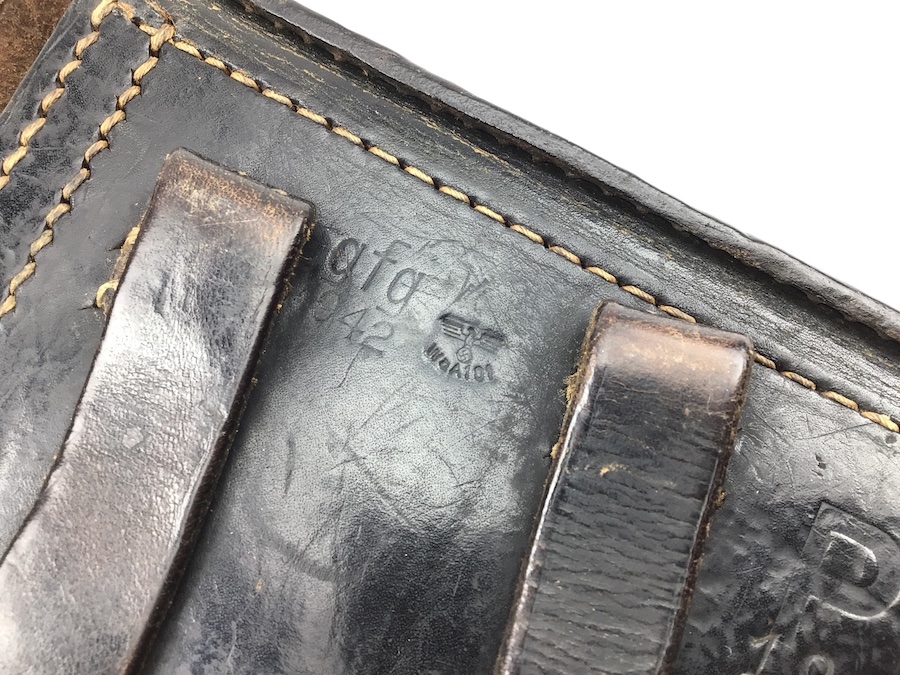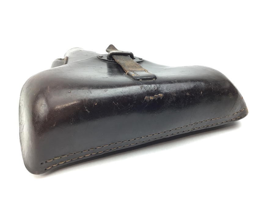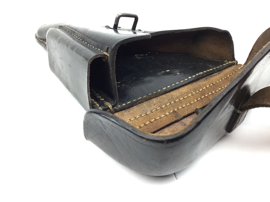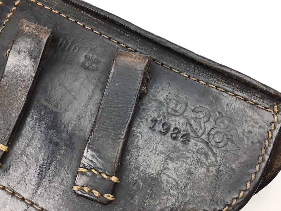 2/8/21 – This is an original 1942 dated P.38 holster. The back of the holster is “gfg” maker stamped, waffen military eagle “WaA101” proof, a 1942 date stamp, and a P.38 stamp. The numerals “1984” are stamped on he back as well. Possibly being re-issued after the war for police use. The black leather is strong and clean with only minor wear on the closure strap. Missing the lift strap. Otherwise there are no issues. The stitching is excellent. Very clean interior.