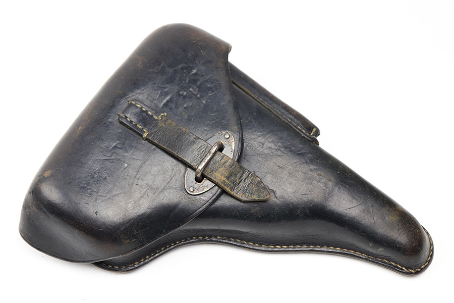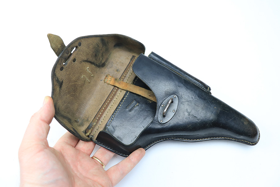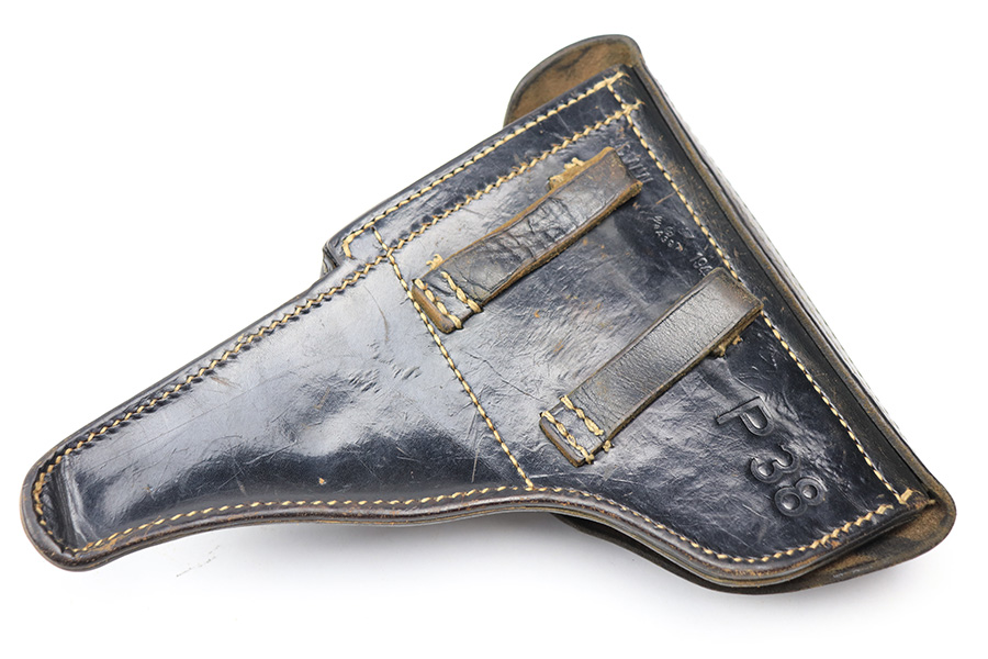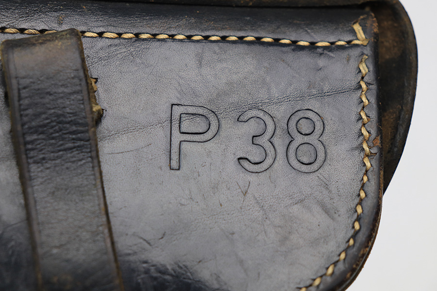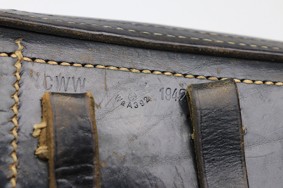 1/11/22 – This is an original 1942 dated P.38 holster from WW2. The holster is maker stamped, P.38 stamped, dated, and waffen proofed on the back leather. The leather is in great overall condition with normal signs of aging and pliability. A closer inspection of the stitching revealed some loose stitches at the top left belt loop. This loop is still attached, but most of the stitches are loose. Price reduced accordingly. Fairly clean interior leather.