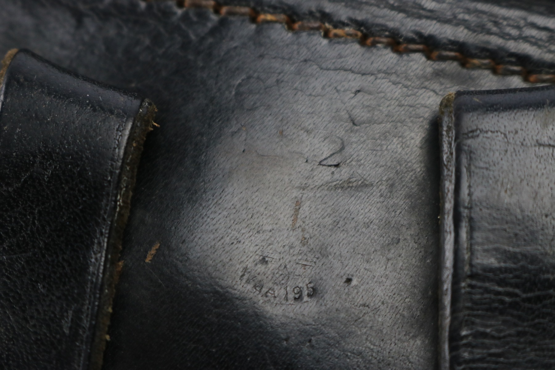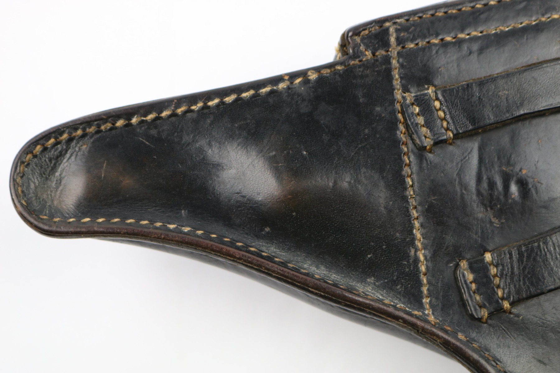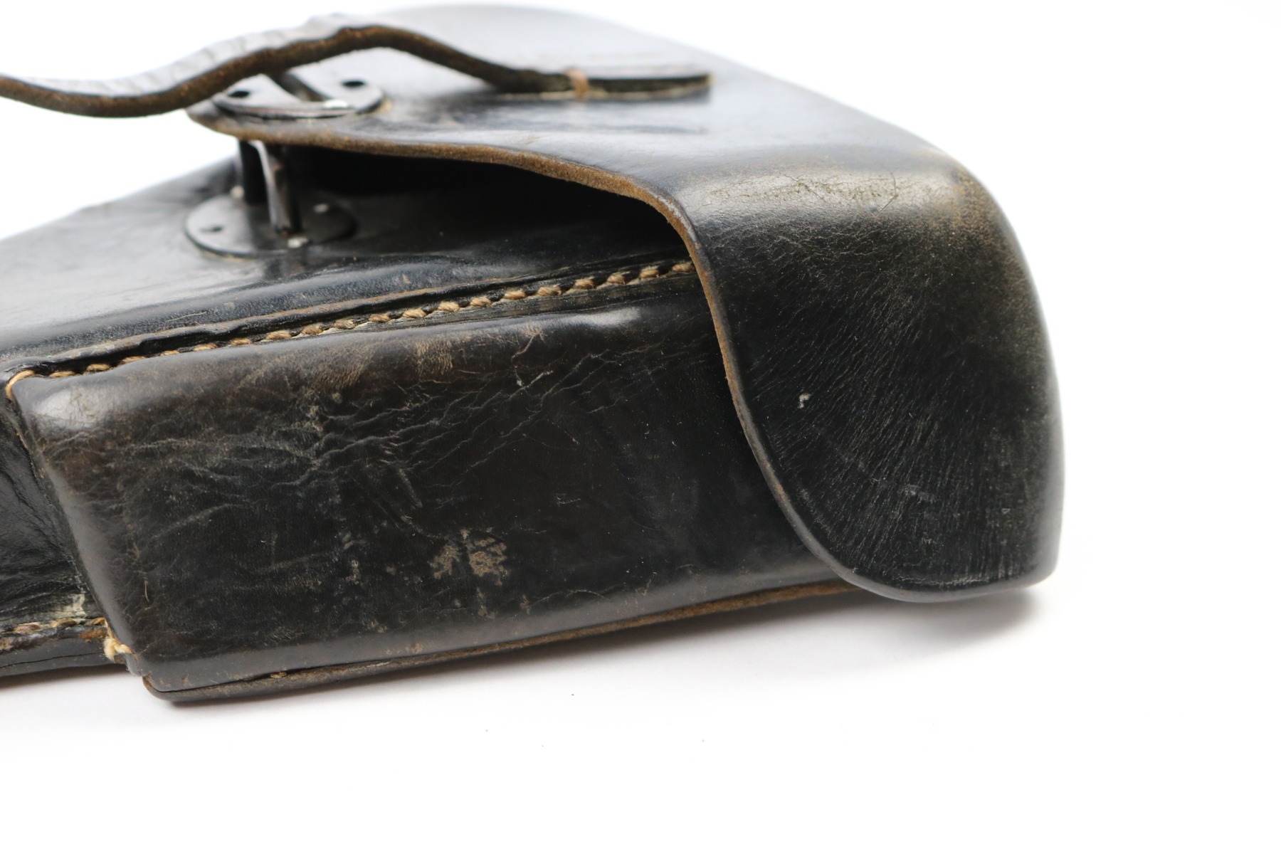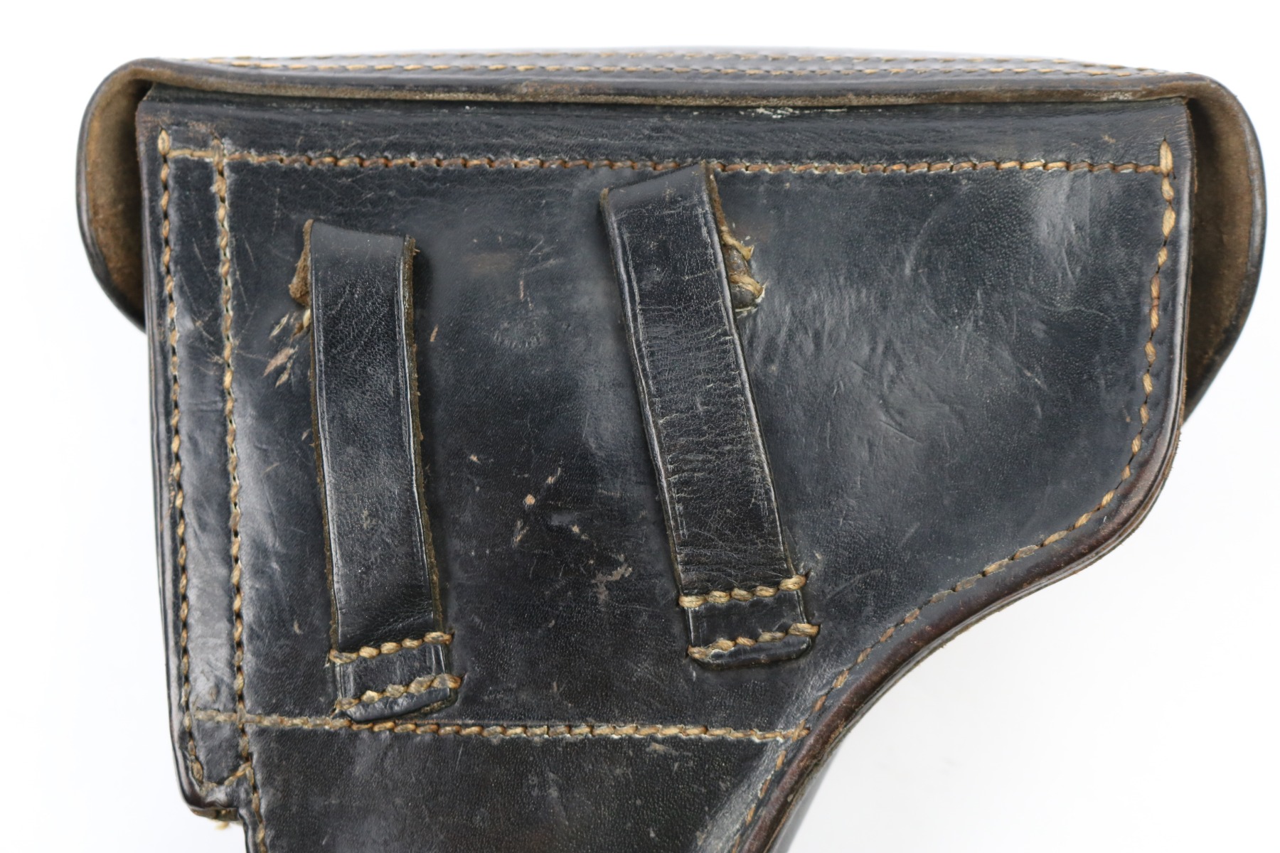 6/13/18 – This is an original WW2 P.38 hardshell holster. The back of the holster is faintly maker stamped “ewx” and 1942 dated. There’s also a waffen proof eagle under the date. The leather is soft and pliable with normal exterior wear and wrinkling in the leather. The stitching is all in tact except for the back left belt loop has a few missing stitches (but still attached). The interior leather is pebble grain, which is unique and makes this holster somewhat more desirable. Guaranteed original.