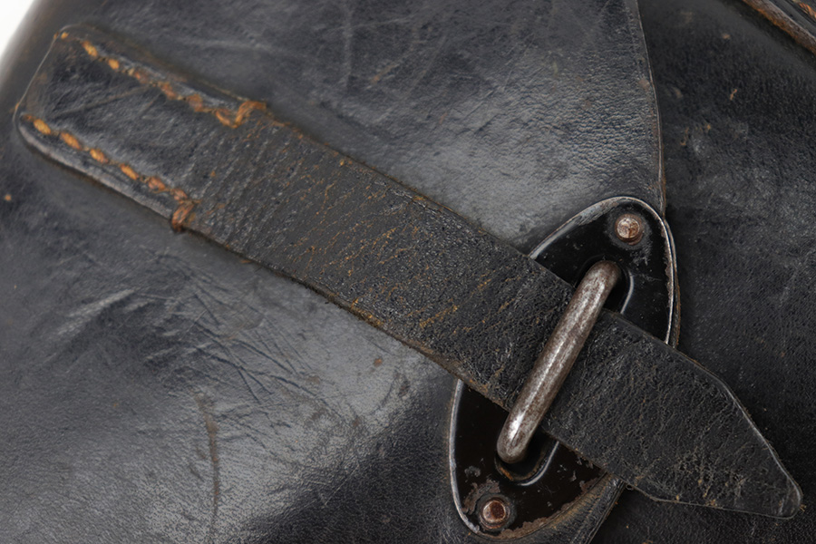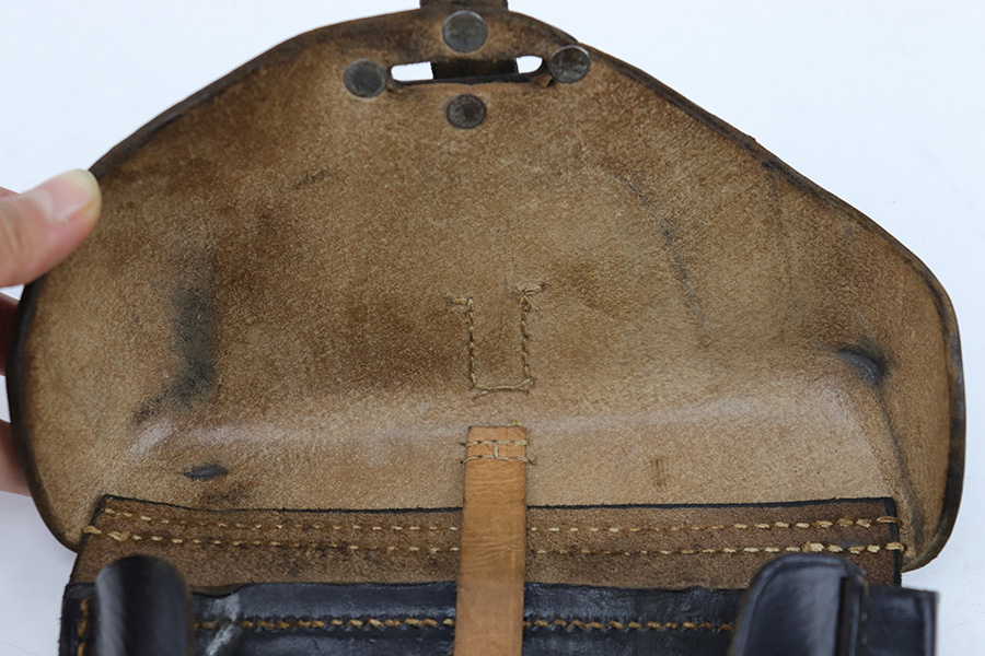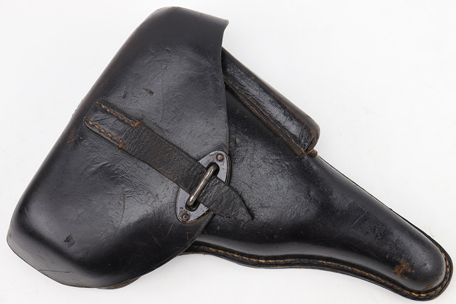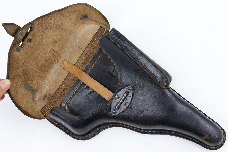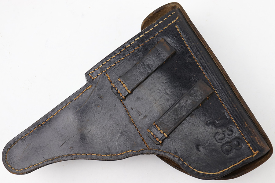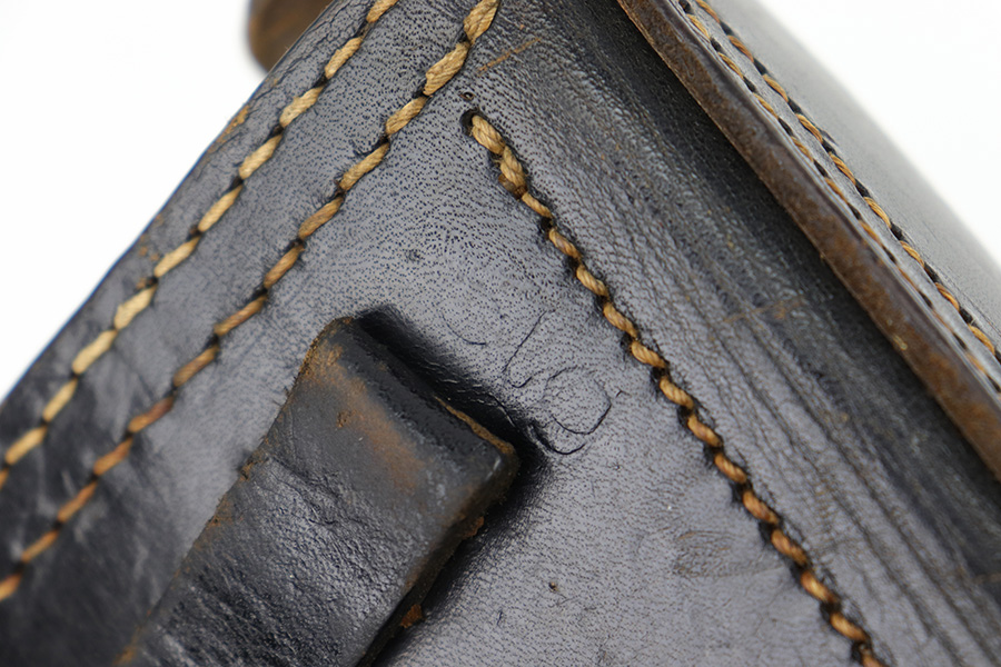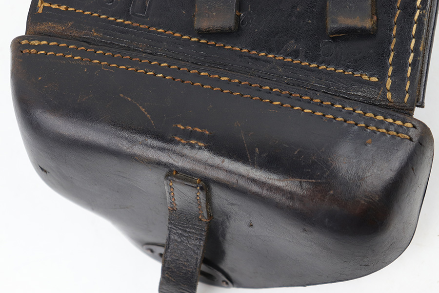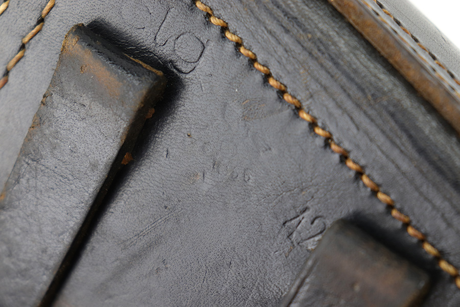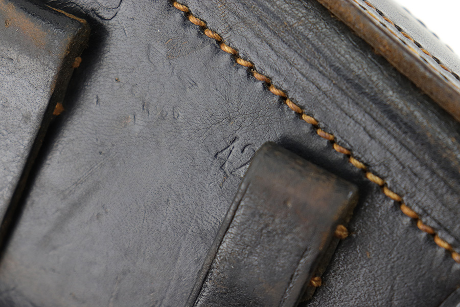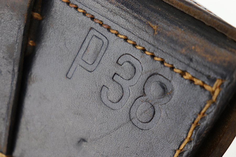 5/18/23 – This is an original 1942 dated P.38 hard shell style holster from WW2. This example is in excellent overall condition with all original leather and stitching. The exterior leather has some mild surface blemishes and wrinkling on the closure strap, as well as some surface scuffing near the toe. Minty, crisp interior leather. No stitching issues. The back leather has a faint “clg” maker stamp, waffen military proof stamp, and ’42 date stamp. Also stamped P.38 as shown. Normal pliability throughout.