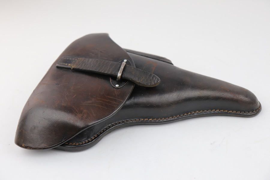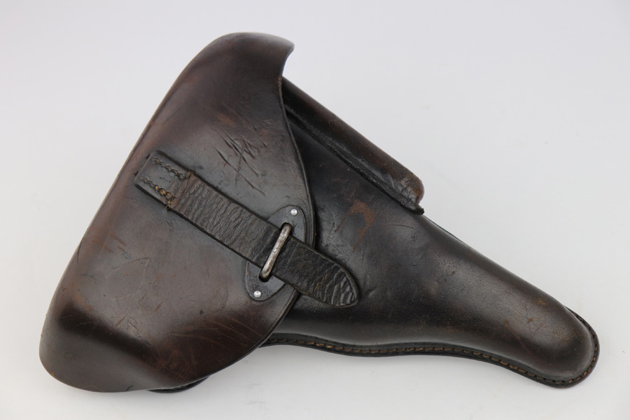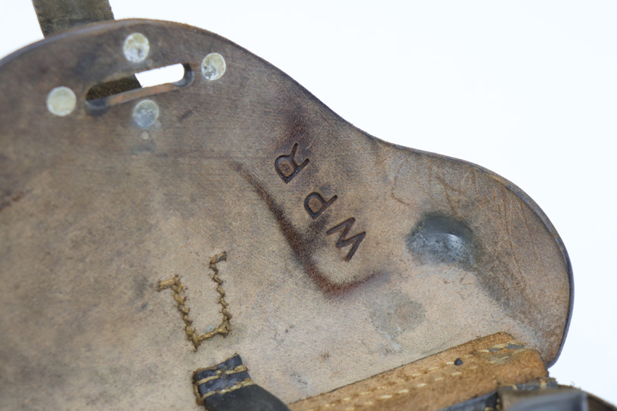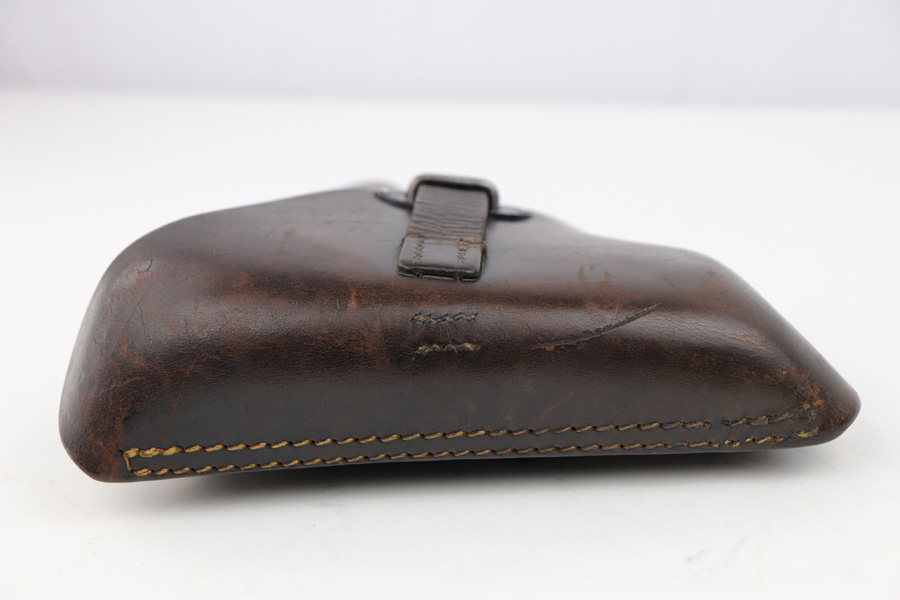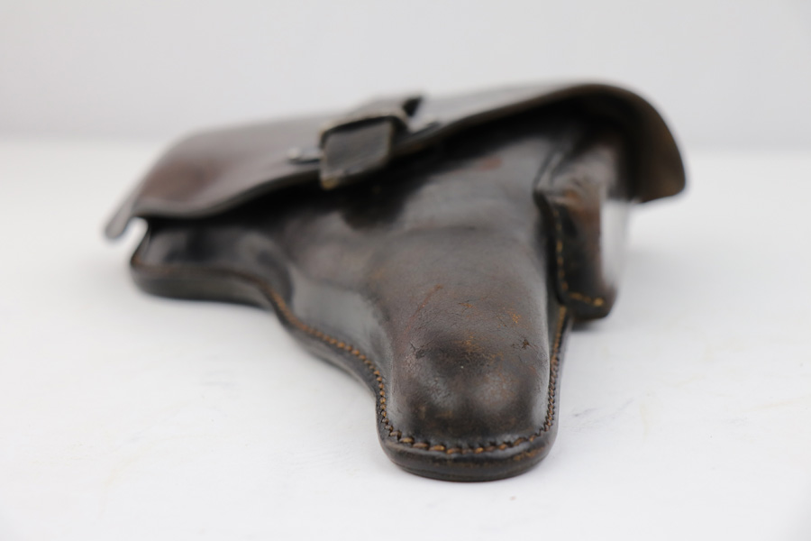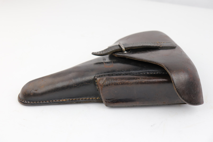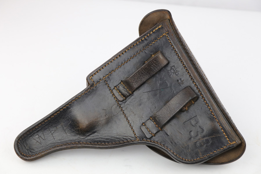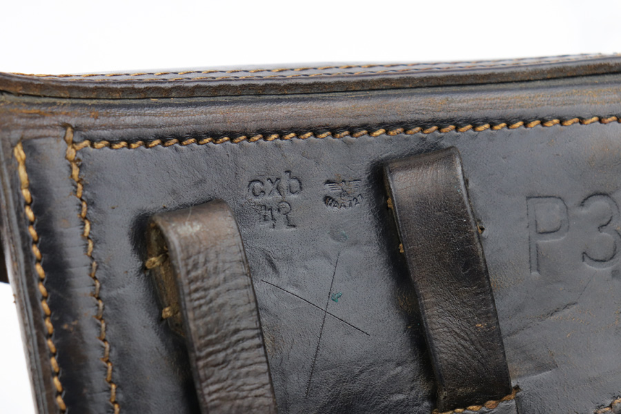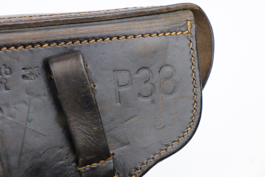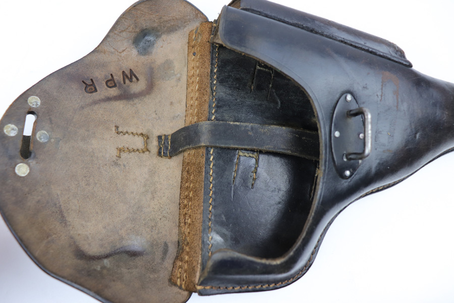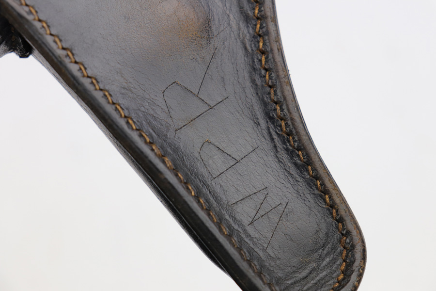 7/18/19 – This is an original 1942 dated P.38 holster. The back leather is maker stamped, waffen WaA727 military proofed, and 42 dated. The leather and stitching is all original. The leather normal pliability and initials stamped into the interior leather as well as on the back toe of leather (this GI really didn’t want anyone taking his holster). The leather has faded black ink so it looks more dark brown today. The stitching is all in tact.