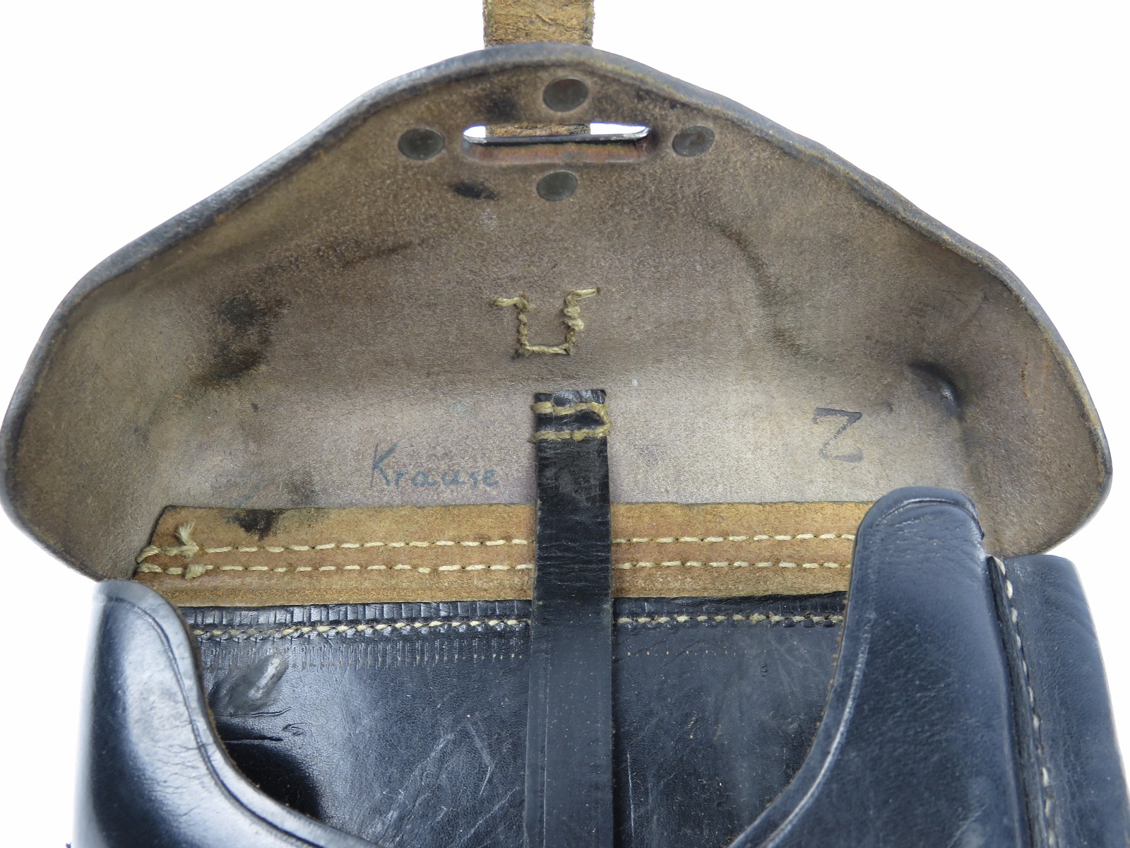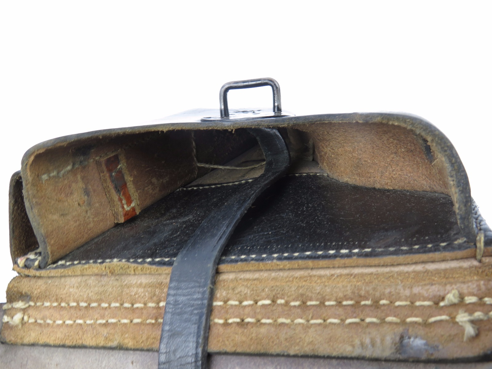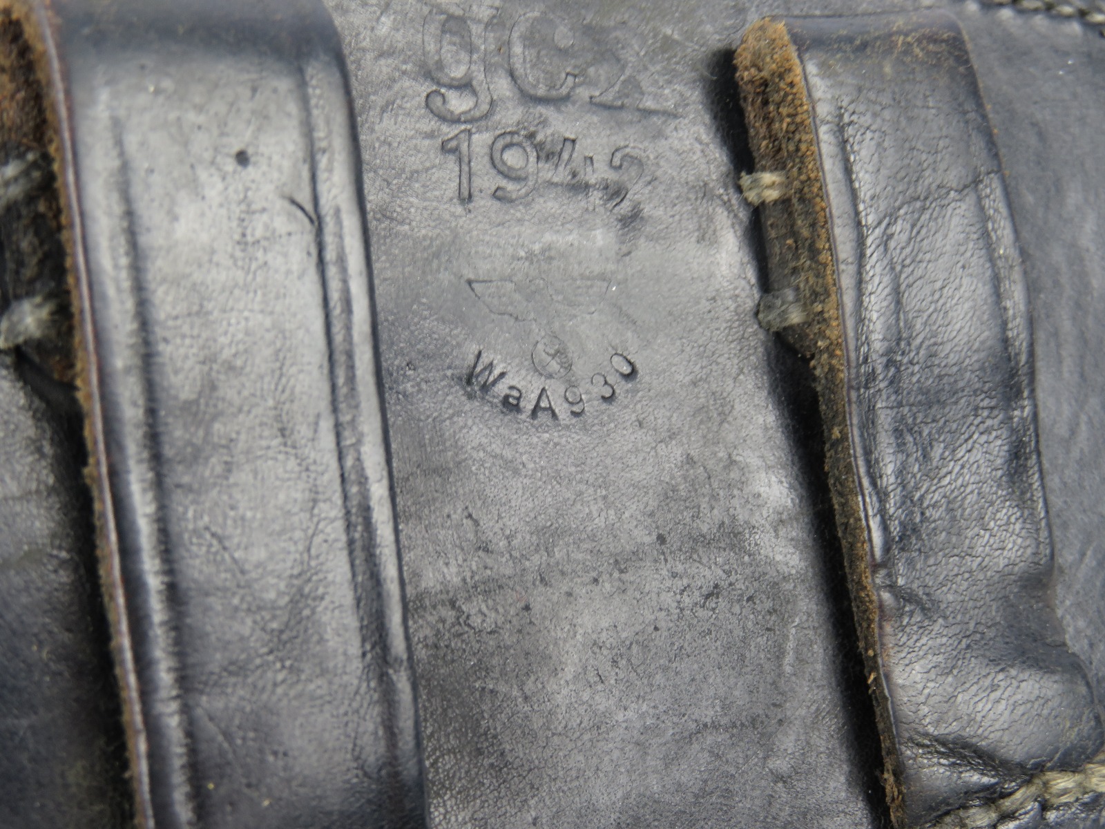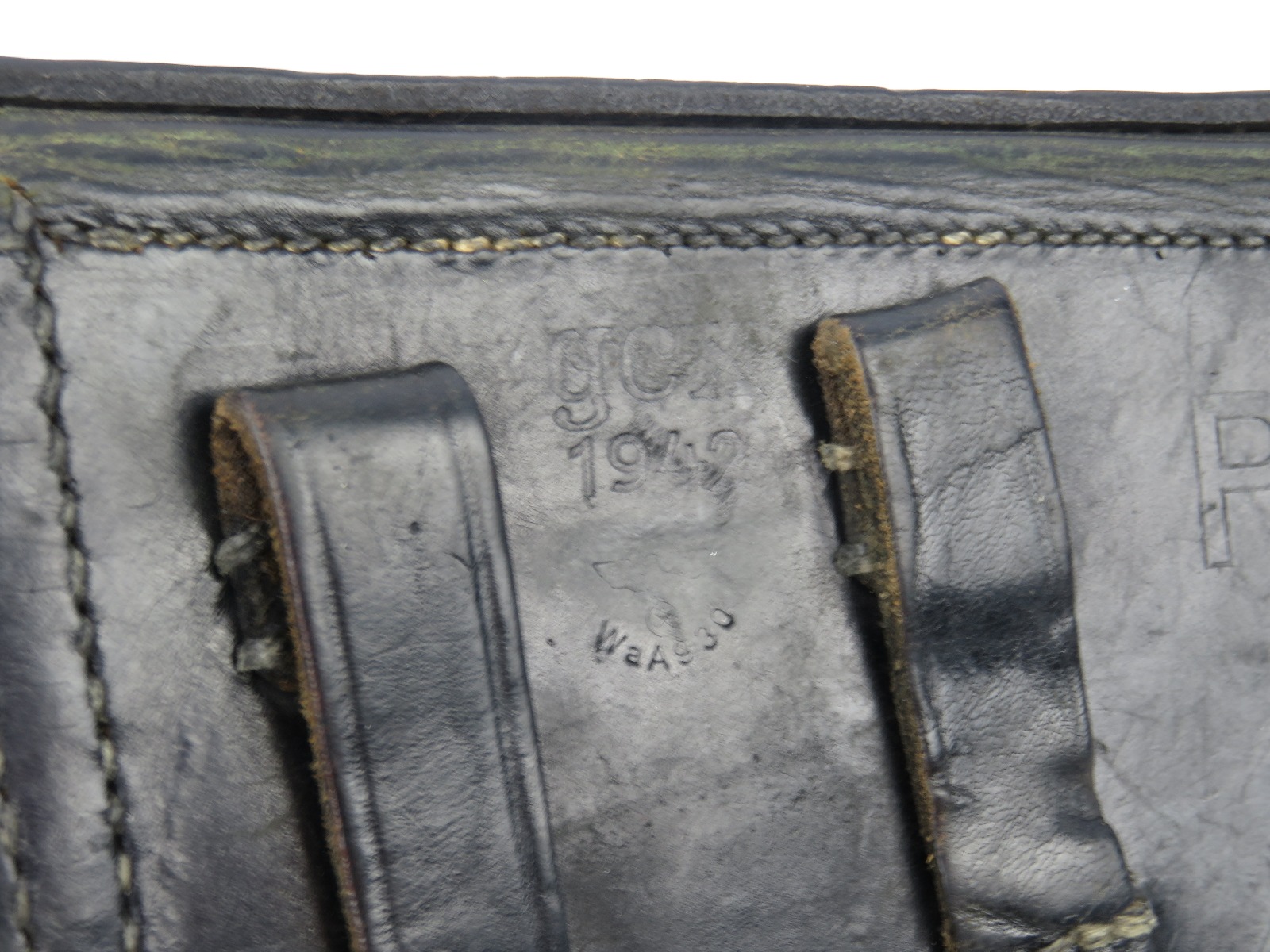 7/19/17 – This is an original WW2 era 1942 dated hardshell P.38 holster. The back of the holster is “gcx” maker coded with a 1942 date stamp, waffen eagle WaA930, and P.38 stamp. The holster was sold to us as part of Warren Buxton’s collection sold at Julia auction. The winning bidder let us sell his holsters for him. The holster has nice black leather in excellent condition. Strong overall, and a clean interior. The stitching is all original and in tact, but there is some black polish over the stitching, meaning this holster was most likely polished at some point. However this is a minor deterrent from an overall very nice, all original holster.