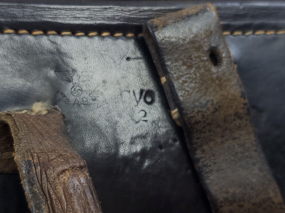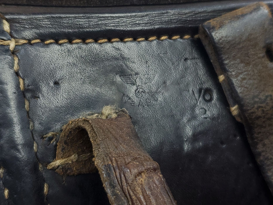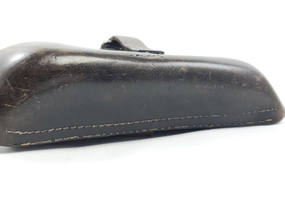 4/17/20 – This is an original 1942 dated P.38 holster from WW2. The holster appears to have a field repair, or period repair on the back belt loops. We’re calling this a field repair because the straps are different in color and look like scrap leather. Most collector repairs are made to look just like the original, and would look cleaner than this. These straps are worn, and the stitching looks original. The leather otherwise is very nice, with some light exterior surface scuffing and normal pliability. The stitching is all tight and original. The back leather has a waffen proof, maker stamp and date. The maker stamp appears to be cyo, but the “c” isn’t visible (uneven stamp).