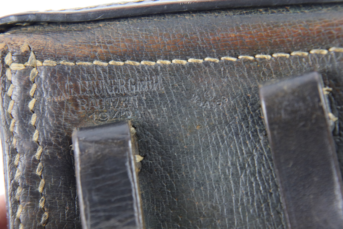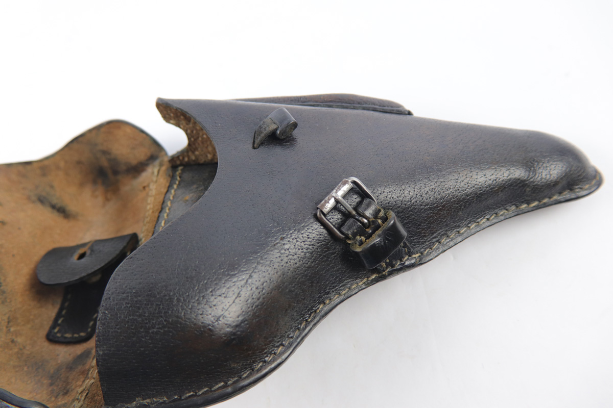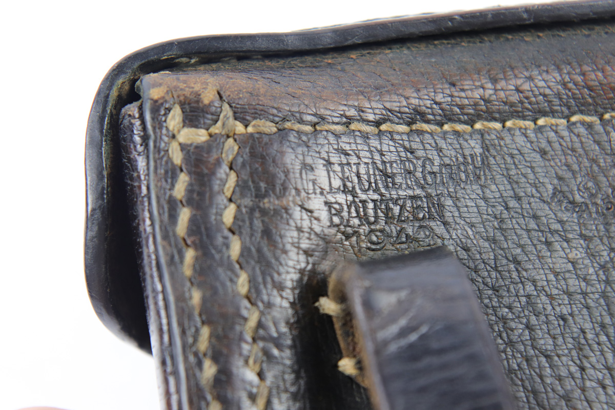 10/11/18 – This is an original rare pigskin leather P.08 holster. The holster is made by G. LEUNER from Bautzen and dated 1942 on the back leather. There’s also a waffen eagle WaA159 military proof stamp. The leather has normal pliability and exterior use wear, but no notable damage or wear. The stitching is all original and in tact. The interior leather has a “116” stamped near the closure strap attaches to the lid. We’re not sure the significance (unit or stock number?). Guaranteed original and authentic.