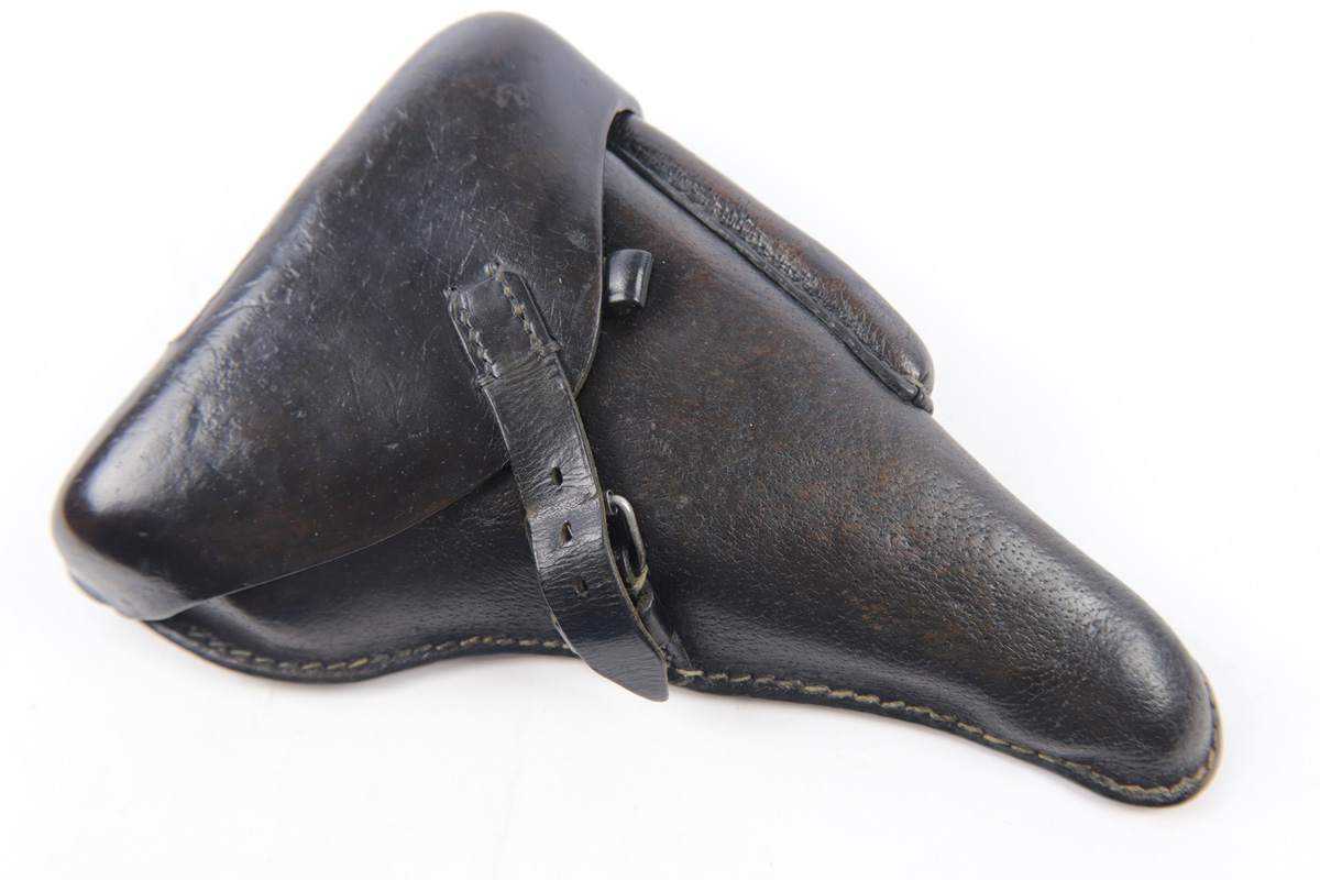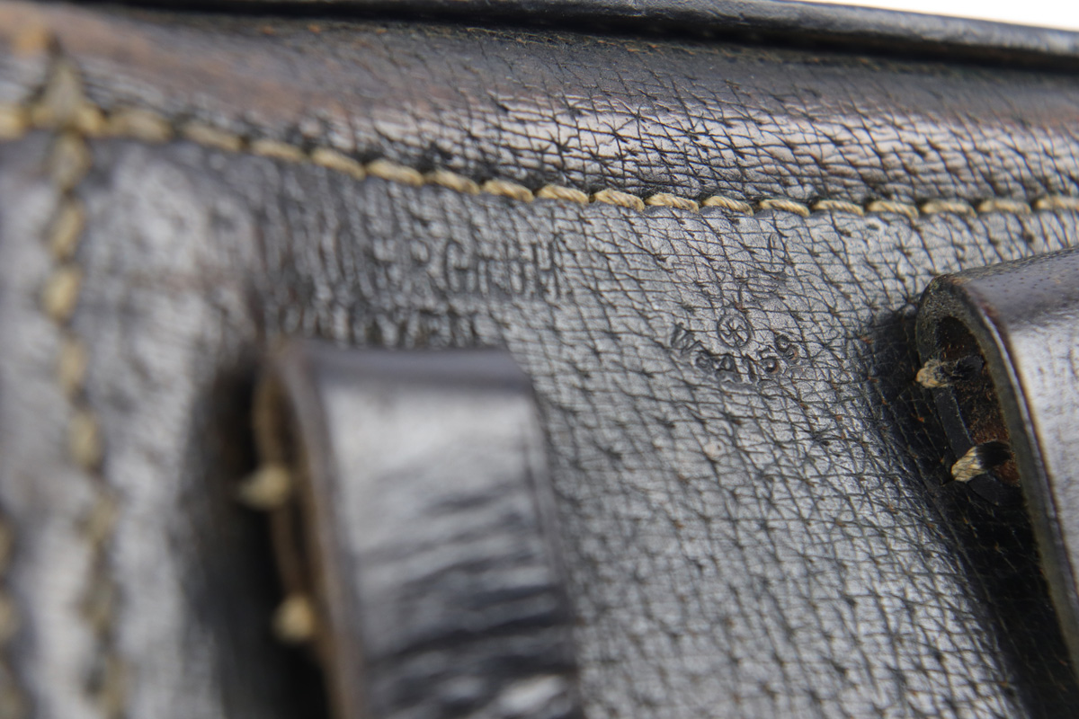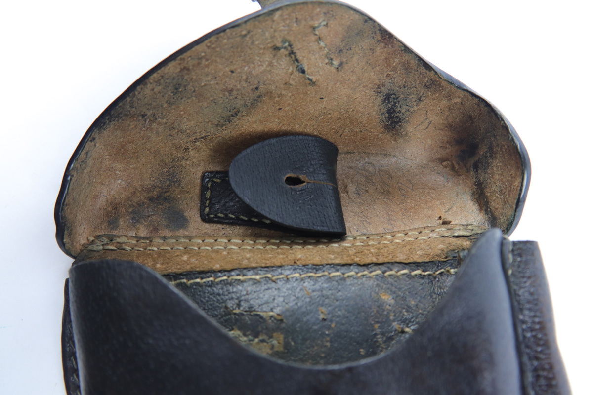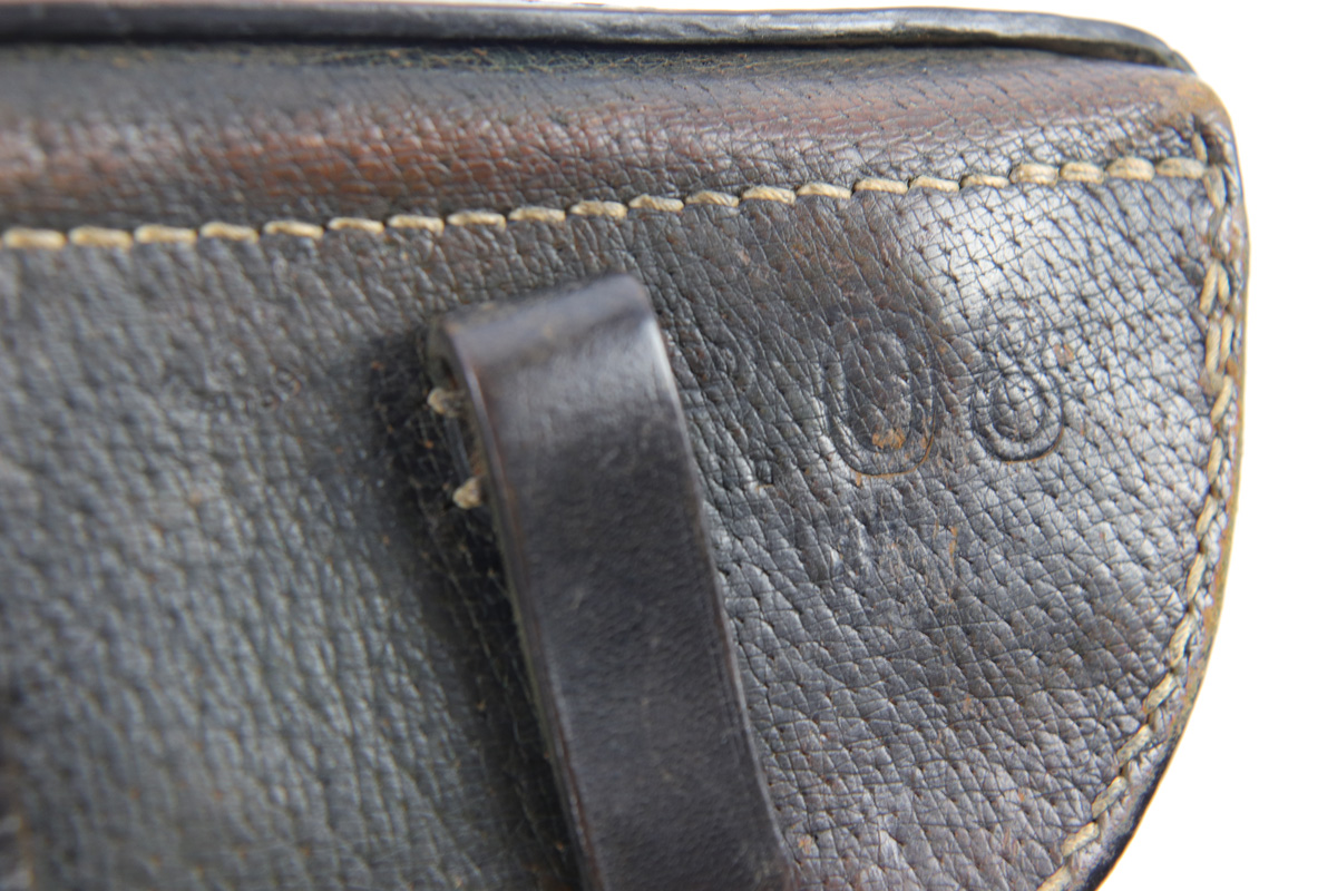 10/11/18 – This is an original rare pigskin leather P.08 holster. The holster is made by G. LEUNER from Bautzen and dated 1942 on the back leather. There’s also a waffen eagle WaA159 military proof stamp. The leather has normal pliability and exterior use wear, but no notable damage or wear. The stitching is all original and in tact. The interior leather has a “116” stamped near the closure strap attaches to the lid. We’re not sure the significance (unit or stock number?). Guaranteed original and authentic.