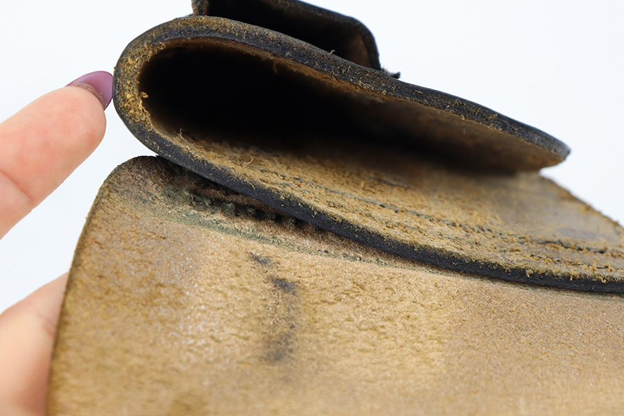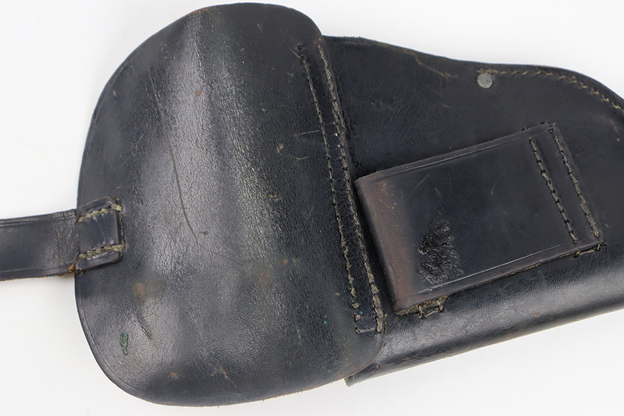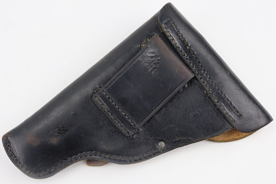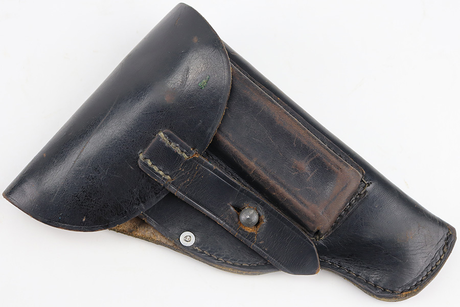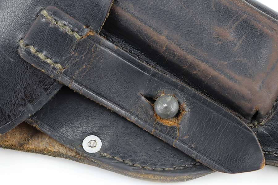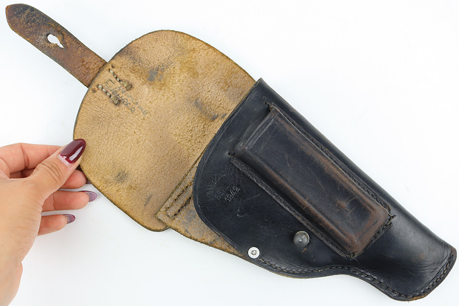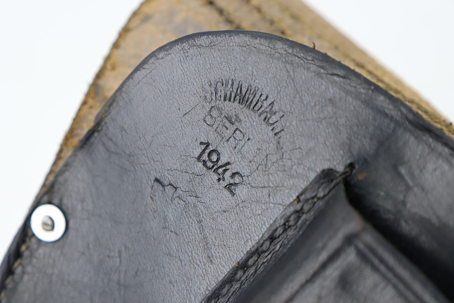 11/30/23 – This is a 1942 dated Police pistol holster for a Walther PP, Mauser HSC, or Sauer 38h. The holster is in great overall condition with some normal use and aging wear. There’s fading to the black dye on the magazine pouch, and a few scuffs and scratches on the exterior leather. Fairly clean interior leather. No stitching issues with all original stitching. Maker stamped, date stamped, and police eagle proof stamped under the closure strap.