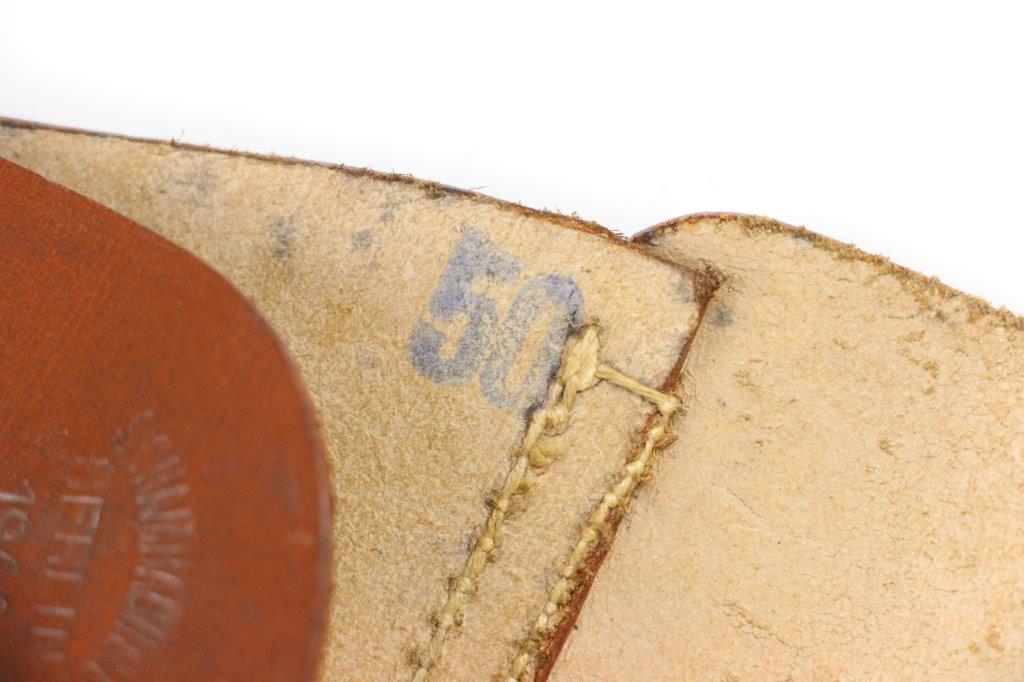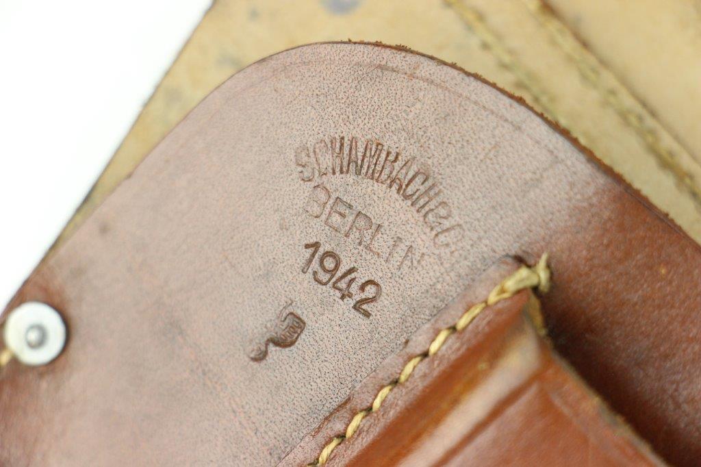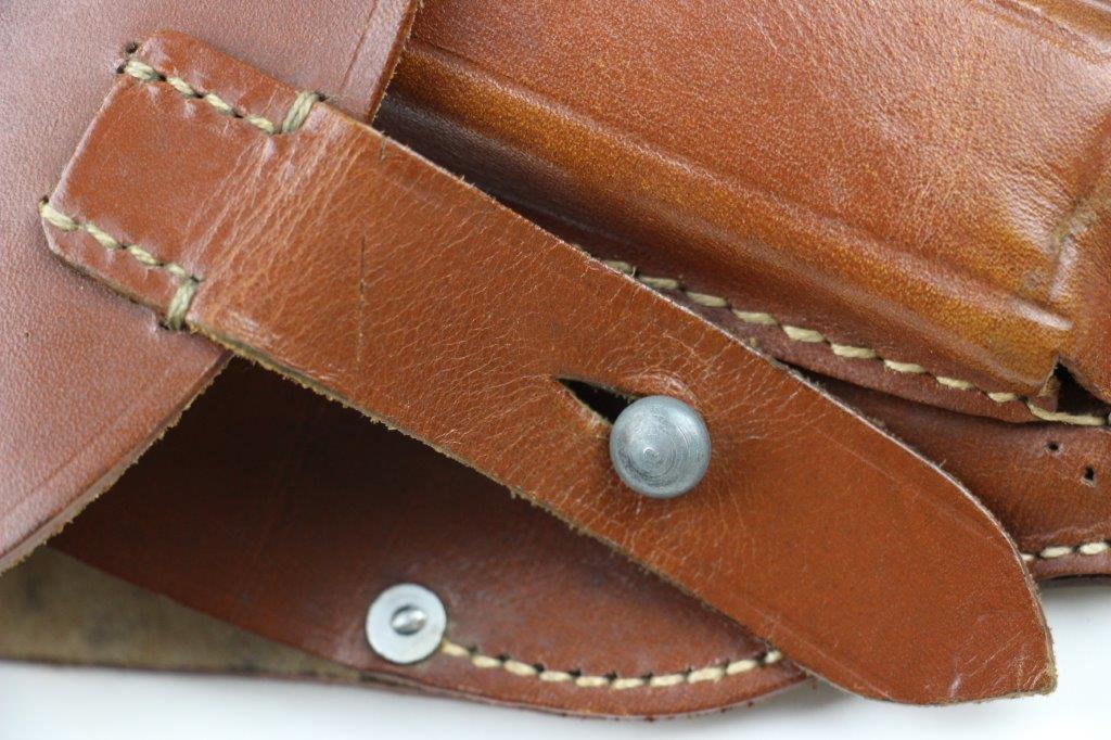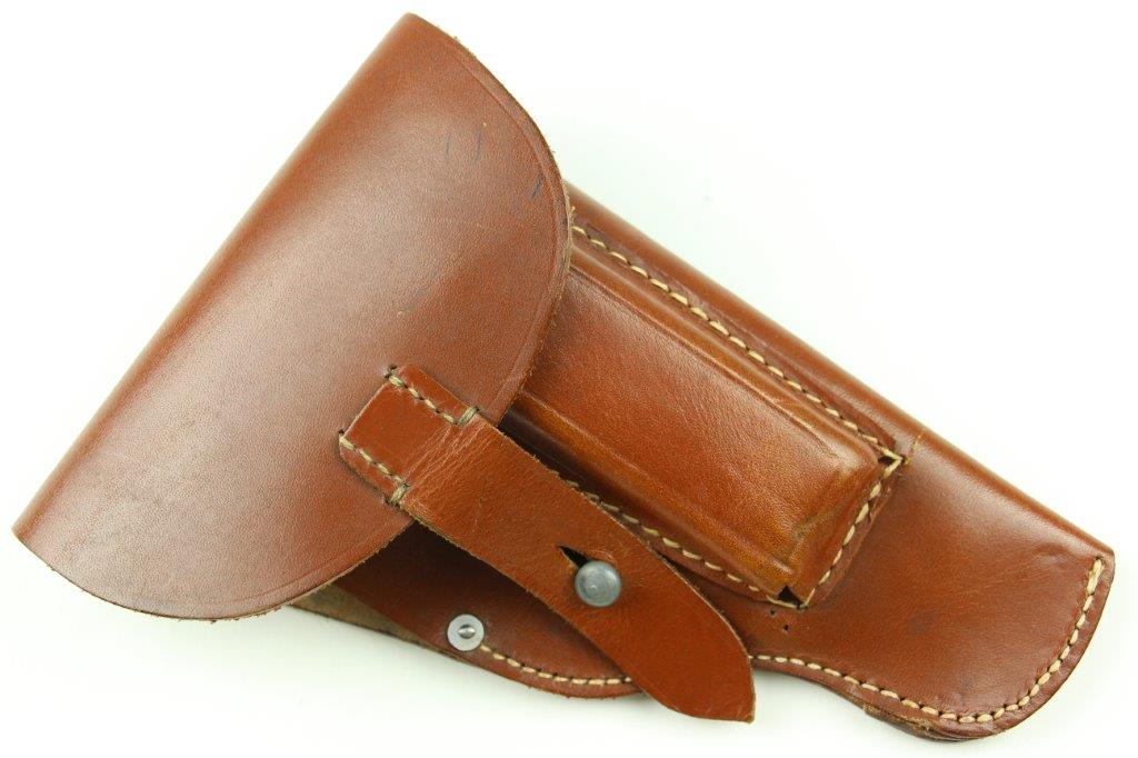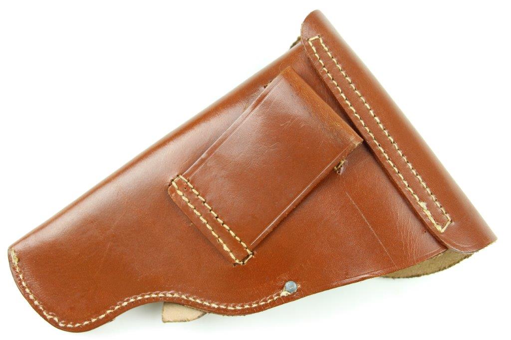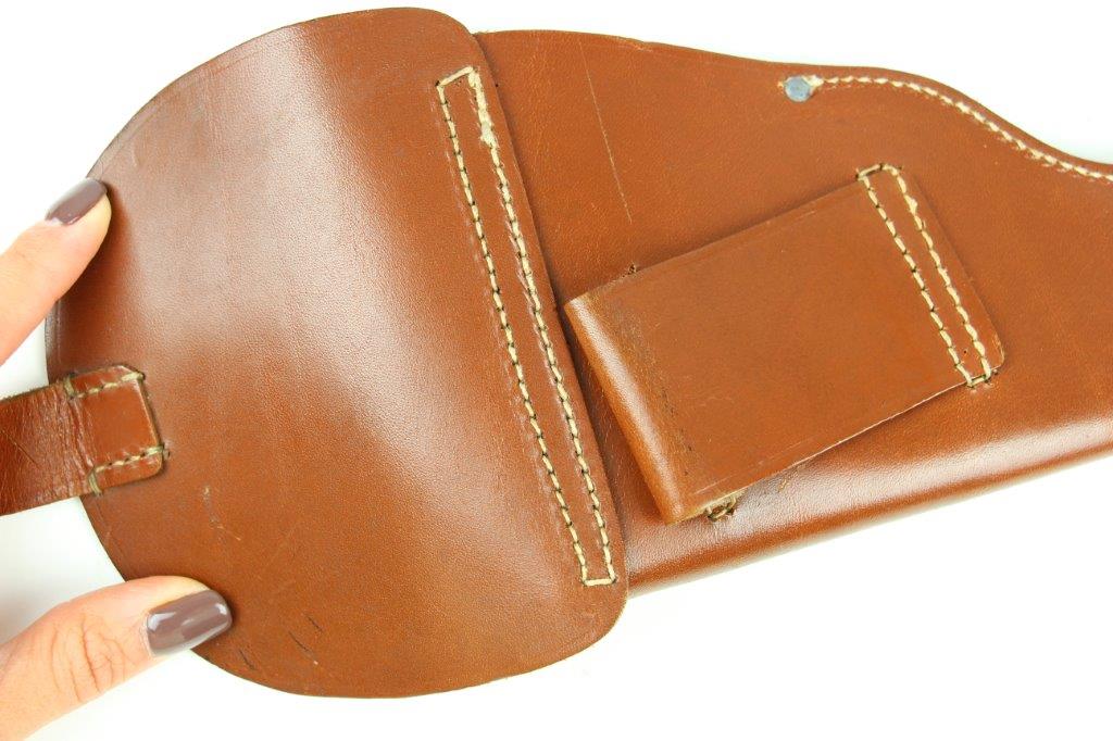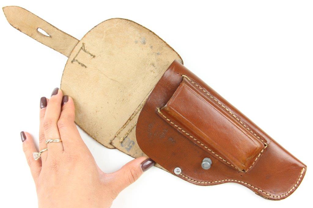 2/28/24 – This is an excellent condition 1942 dated Police issued holster from WW2. The holster is sized for a Walther PPk, Mauser HSC, or Sauer 38h. Features very clean, crisp brown leather with mild pliability. Maker stamped with a date and police eagle proof under the closure strap. Excellent all original stitching intact throughout as well.