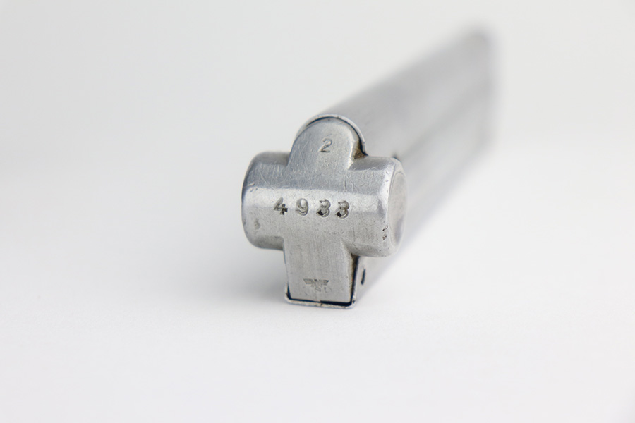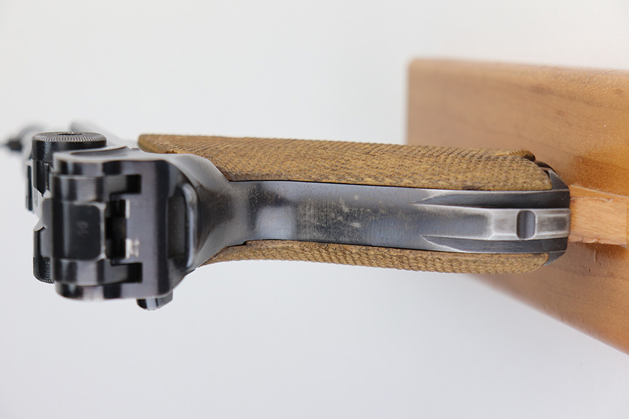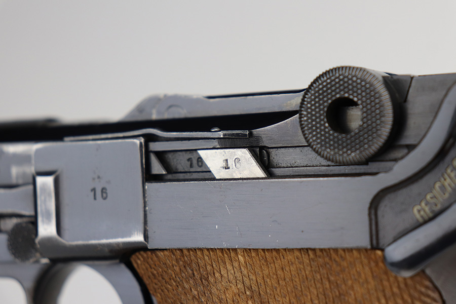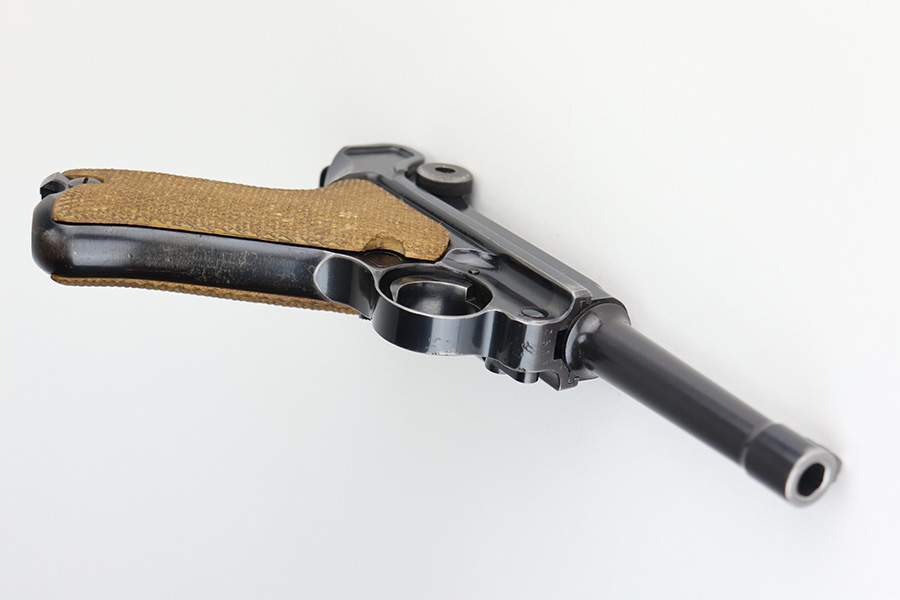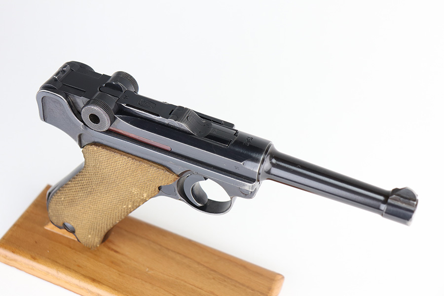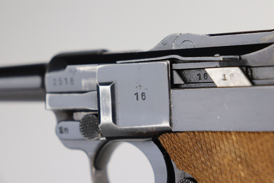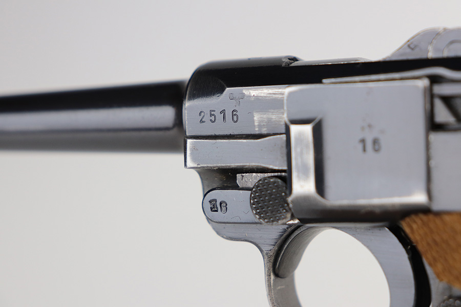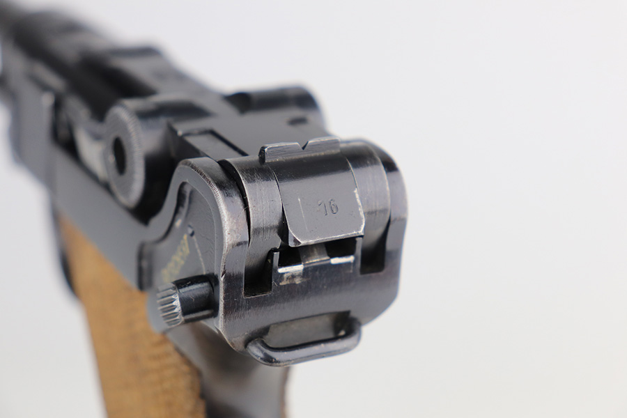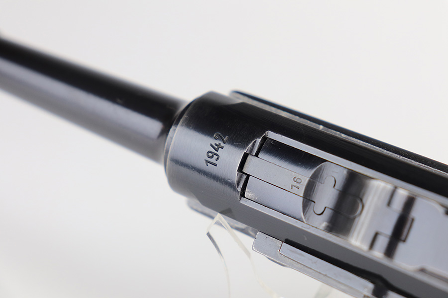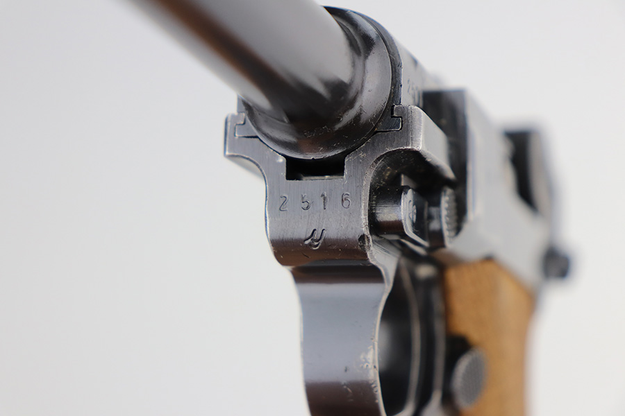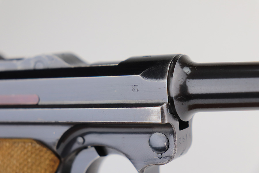 7/8/21 – This is a very nice example of a Mauser Banner Luger issued to the Nazi police in 1942. The gun is all matching, has an added police seer safety, a proper police “Eagle L” marking, and a Mauser Banner logo on the toggle. It has retained about 92% of its original bluing. The gun has nice profile views as most of the wear is spotty on the straps. There is also minor wear on the side plate, around the muzzle, and on the high edges of the frame. Comes with minty blonde grips and a mismatched Police Eagle L marked Haenel magazine. The bore has strong rifling with freckling in the grooves.