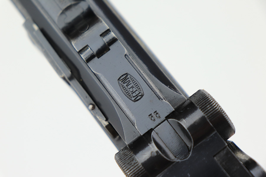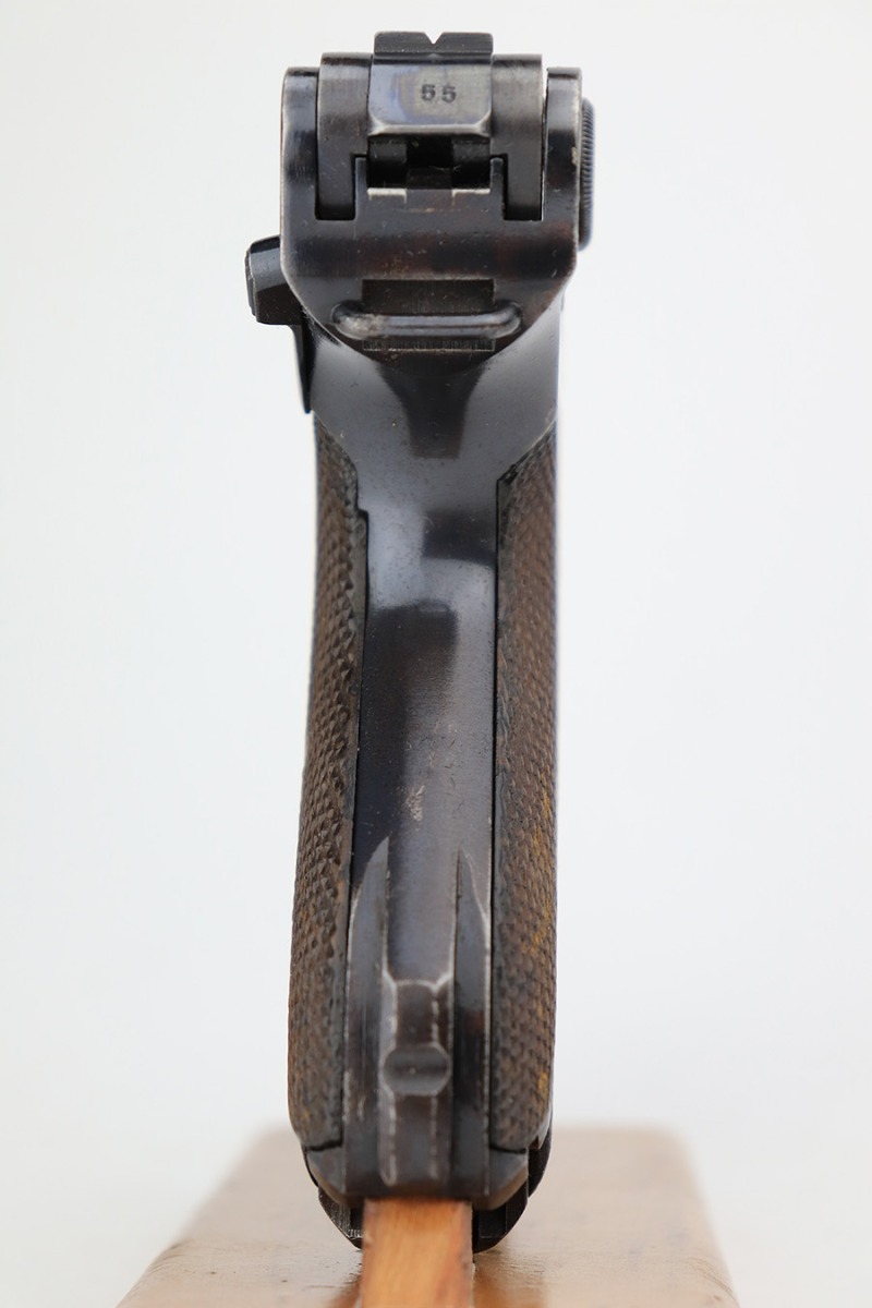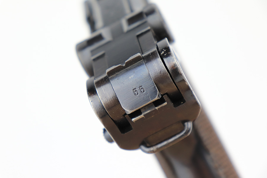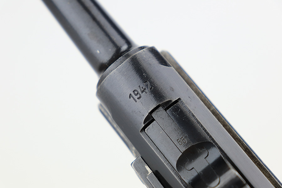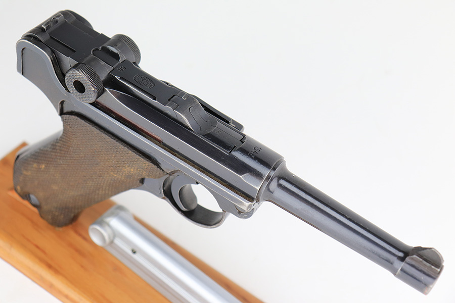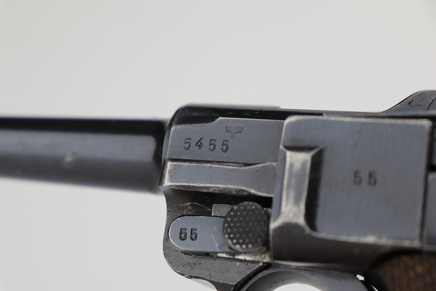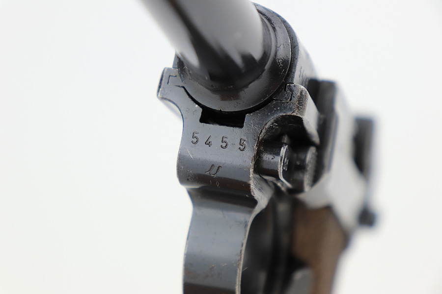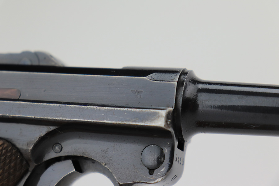 5/17/23 – This is a very nice example of a Mauser Banner Luger issued to the Nazi police in 1942. The gun is all matching, has an added police seer safety, a proper police “Eagle L” marking, and a Mauser Banner logo on the toggle. It has retained about 95% of its original bluing with wear around the muzzle, on the side rails, on the side plate, and one small spot at the base of the front strap. Some tiny scratches on the barrel near the muzzle. Some pin-pricking on both grip straps and tiny handling marks on the front strap. Fitted with un-numbered wood grips – some bruises on both sides, more noticeable on the left side. Comes with a period-correct mismatched but police “Eagle L” marked Haenel magazine. The bore has good rifling, but there is frosting in the grooves.