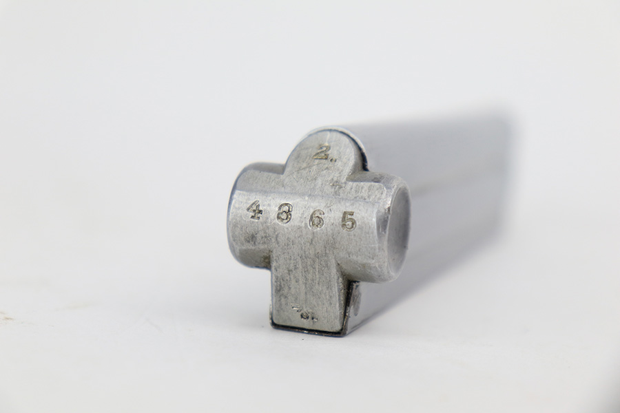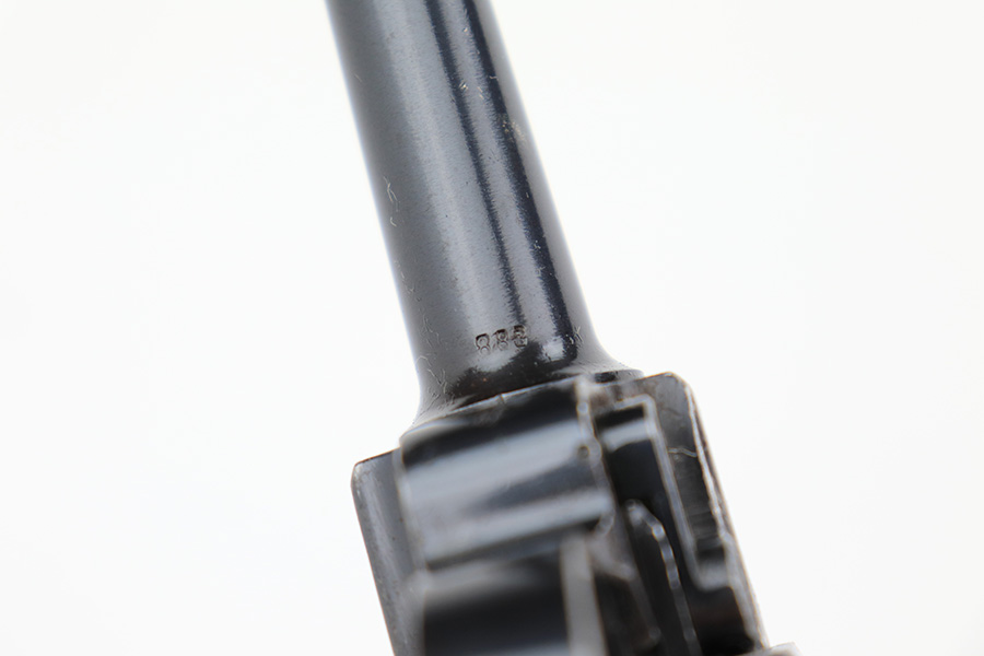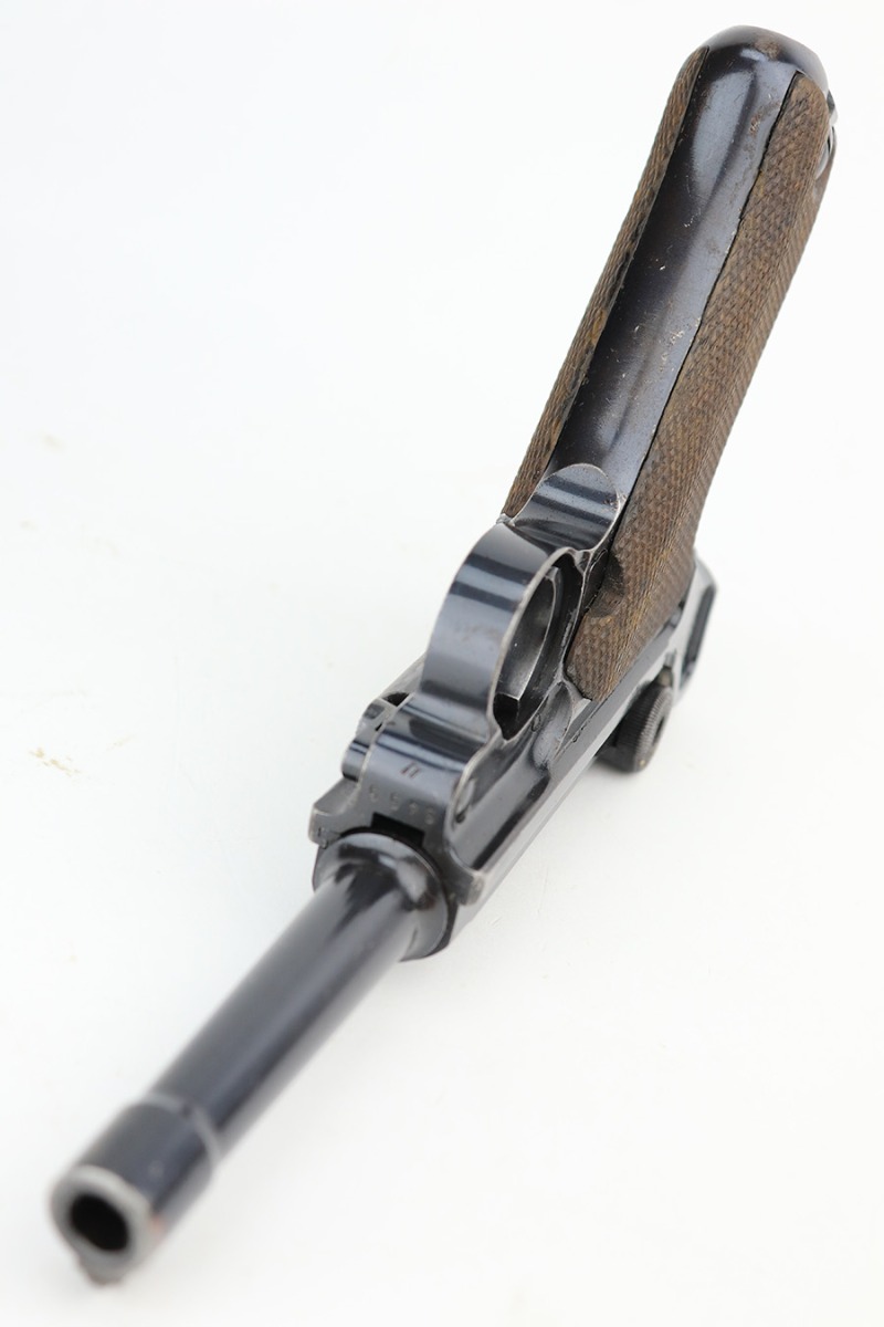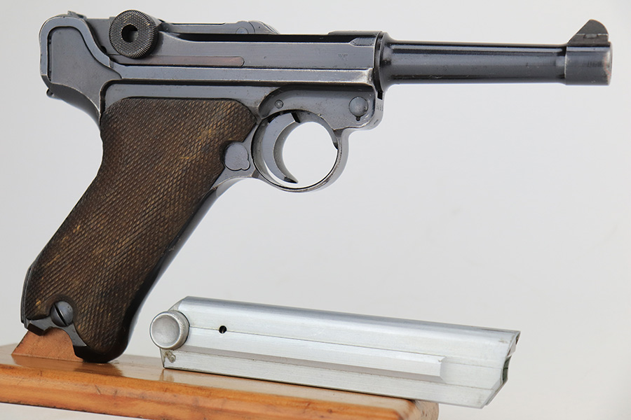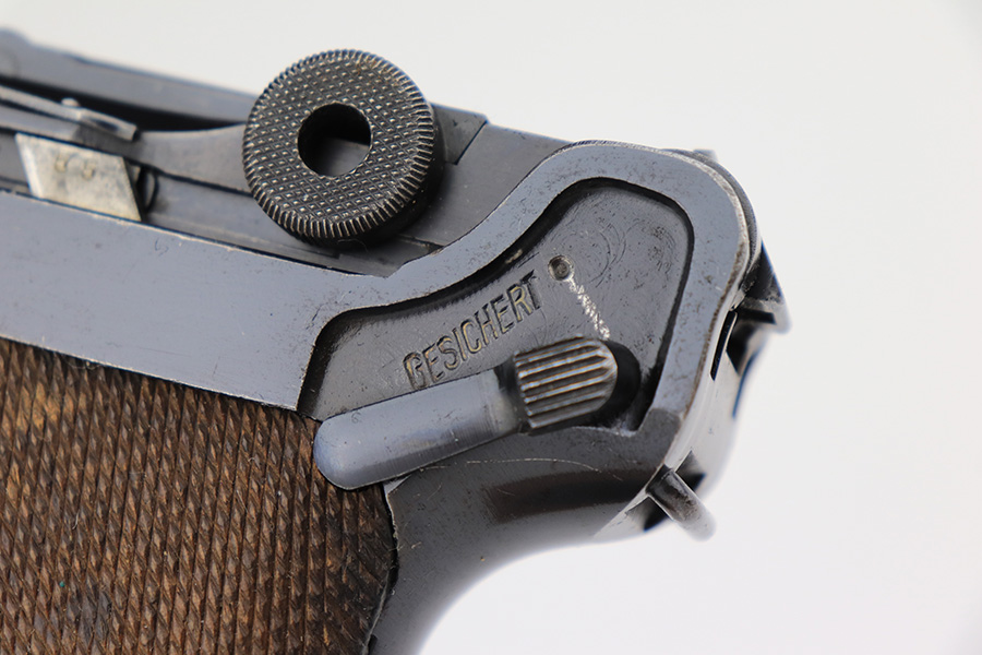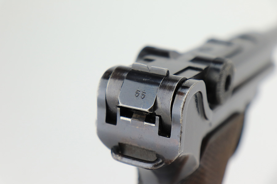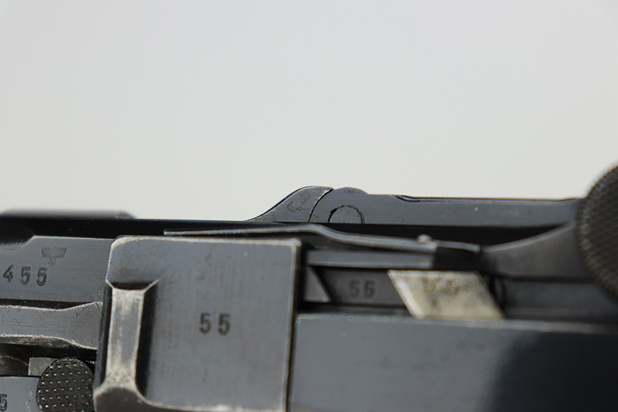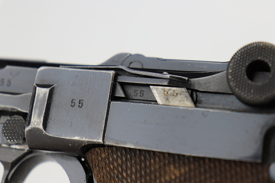 5/17/23 – This is a very nice example of a Mauser Banner Luger issued to the Nazi police in 1942. The gun is all matching, has an added police seer safety, a proper police “Eagle L” marking, and a Mauser Banner logo on the toggle. It has retained about 95% of its original bluing with wear around the muzzle, on the side rails, on the side plate, and one small spot at the base of the front strap. Some tiny scratches on the barrel near the muzzle. Some pin-pricking on both grip straps and tiny handling marks on the front strap. Fitted with un-numbered wood grips – some bruises on both sides, more noticeable on the left side. Comes with a period-correct mismatched but police “Eagle L” marked Haenel magazine. The bore has good rifling, but there is frosting in the grooves.