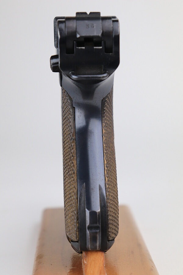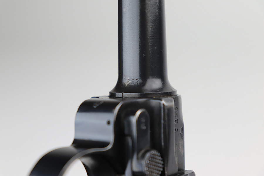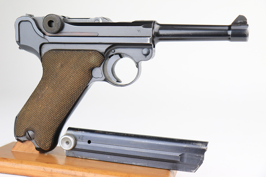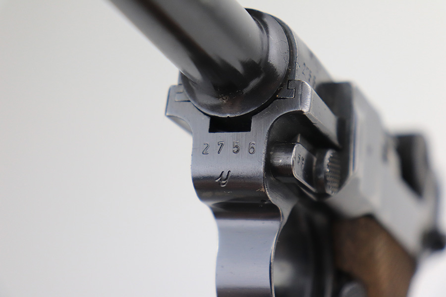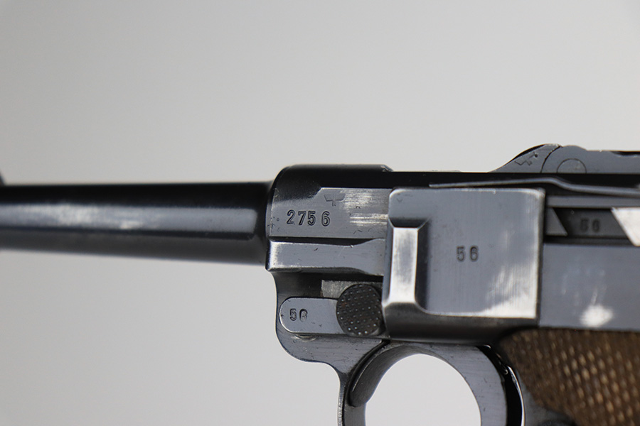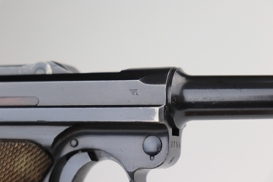 11/30/21 – This is a very nice example of a Mauser Banner Luger issued to the Nazi police force in 1942. It is all matching, has the Mauser banner logo on the toggle, has the proper Nazi police “Eagle L” proof on the right side of the slide, and has an added police sear safety. Only about 4,700 guns of this variation were produced. This one also comes with a matching-numbered magazine. The gun has retained about 93-94% of its original finish. Most of the wear is on the left side, concentrated around the muzzle, on the barrel, on the side plate, and on the left side of the frame. There is also very minor wear on the right side of the muzzle and front edge of the right side rail. Very minor freckling on both grip straps. Comes with excellent matching-numbered wood grips. The bore is very shiny with strong rifling and some very light freckling in the grooves.